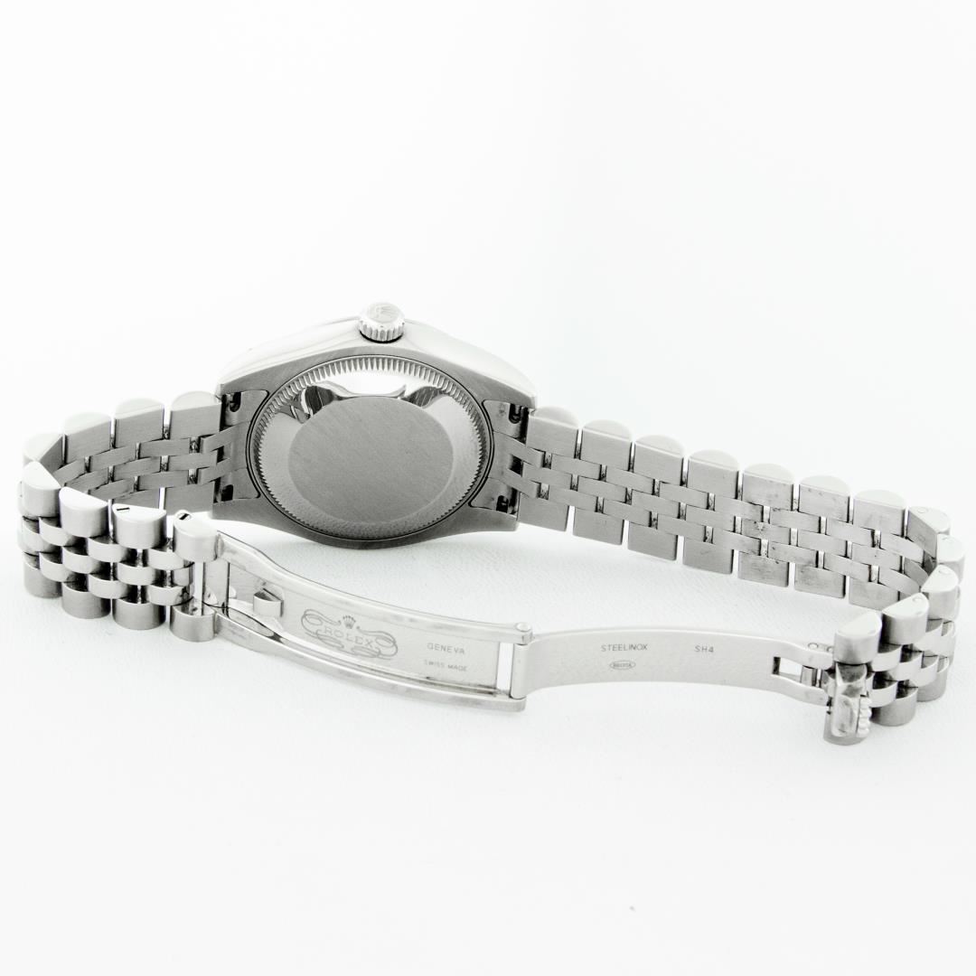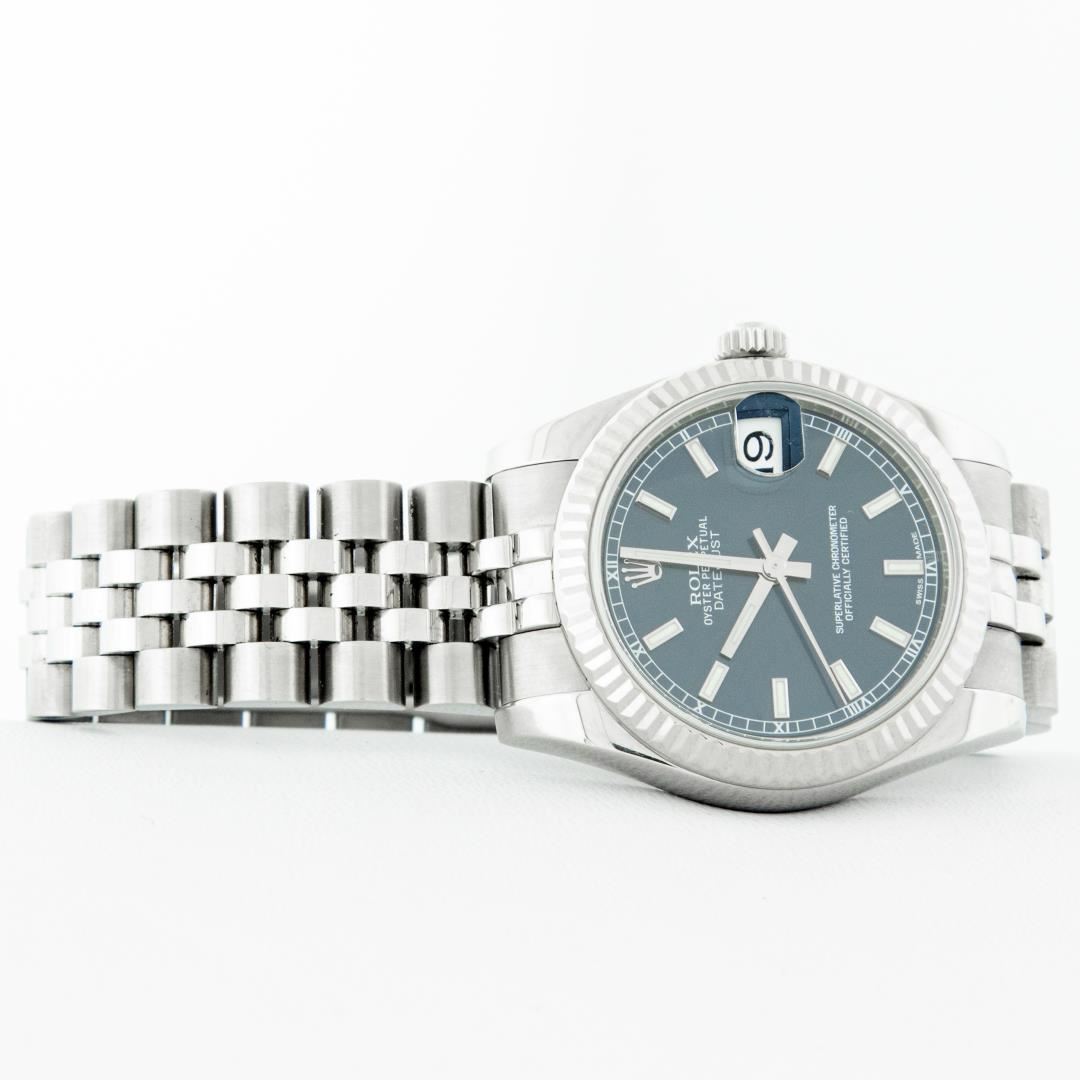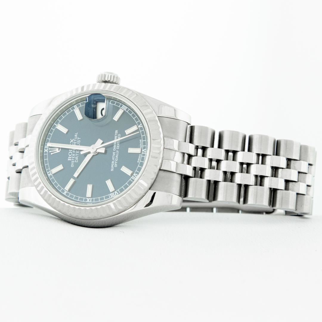 One Women's Midsize Stainless Steel Rolex Datejust Polished, Serviced & Electronically Tested, Stainless Steel Case : 31mm, Stainless Steel Crown, Bezel: 18K White Gold Fluted Bezel, Crystal: Sapphire With Magnified Date Window. Hands: Luminescent Hands. Rolex Movement: Automatic Winding Movement Caliber 2235. Rolex Dial: Blue Index Dial With Square Roman Track, Date Window: 3 O'Clock Position Date Display, Quickset, Model: Sapphire Quickset Midsize Datejust. Condition: G-6 Extra Fine. Rolex Bracelet: Stainless Steel Jubilee Band With Hidden Clasp. Bright Polish. 6.0 Inch Length, Adjustable. Hidden Clasp, With Rolex Logo. This Pre Owned Watch Has Been Serviced Time Tested And Is In Excellent Condition It Is Free Of All Scratches And Dents.