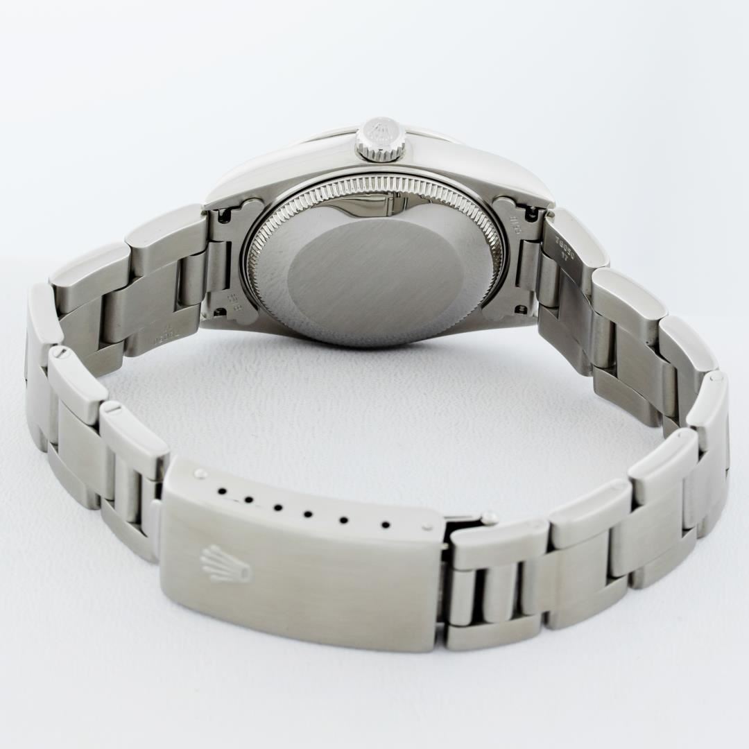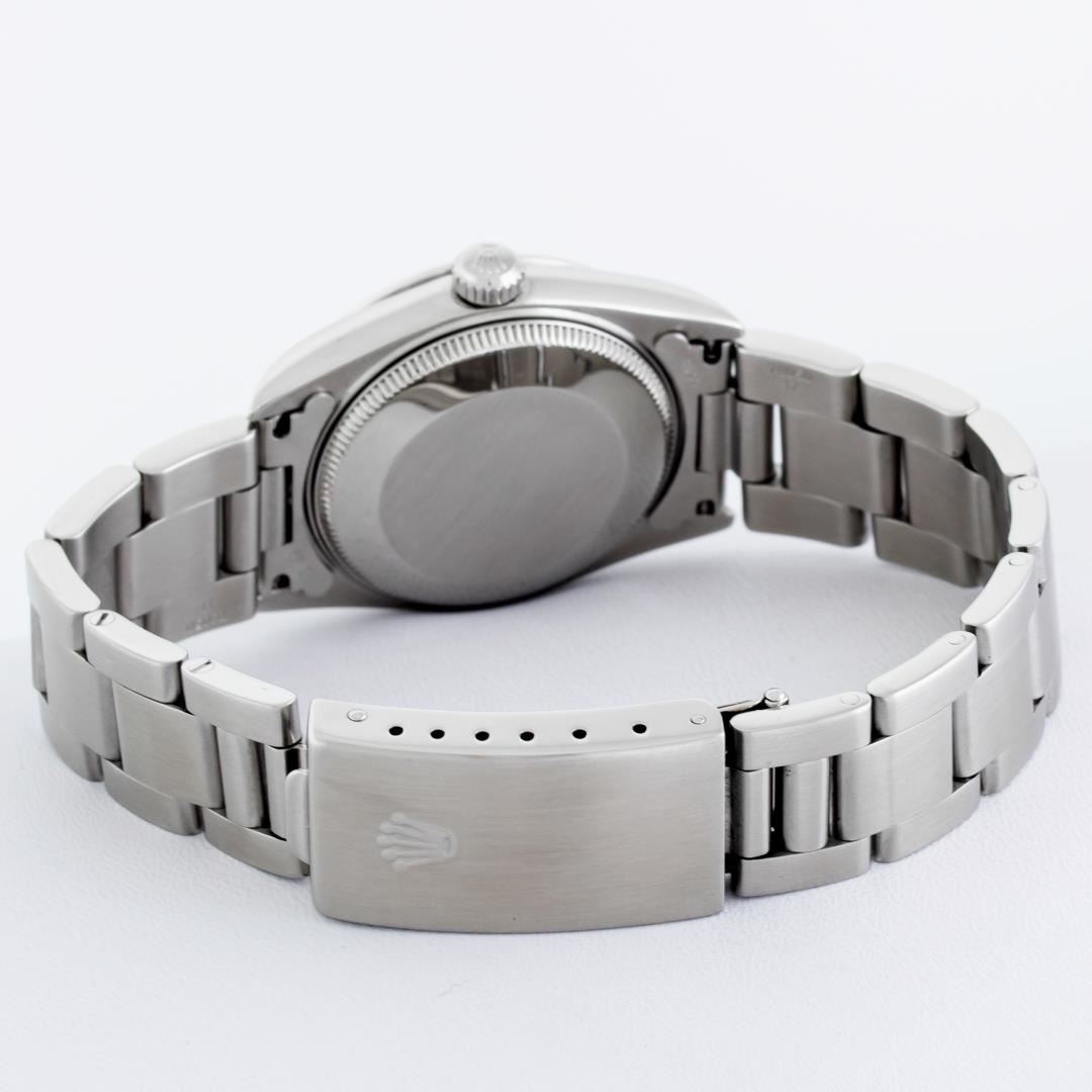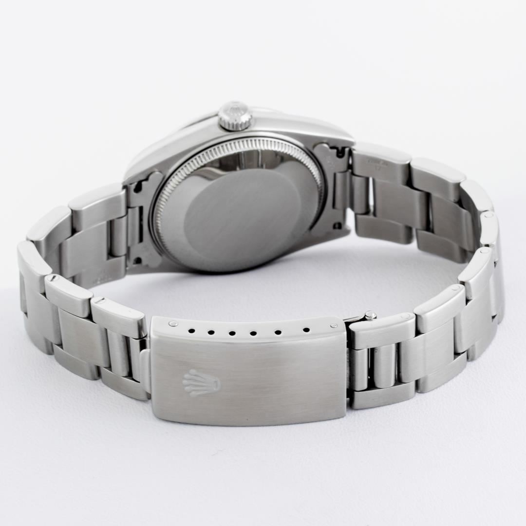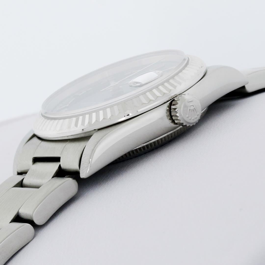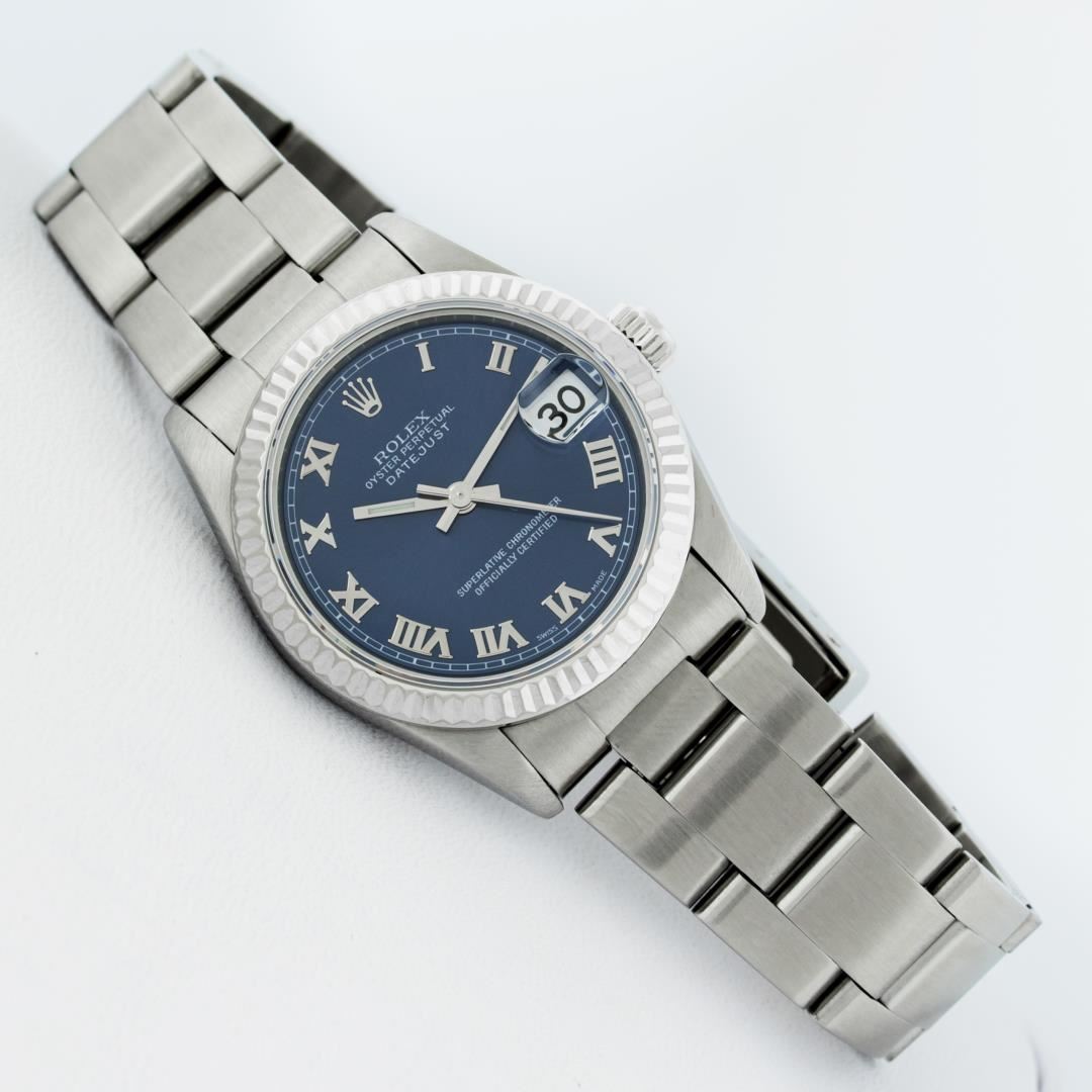 One Women's Rolex Midsize Stainless Steel Datejust Polished, Serviced & Electronically Tested, Rolex Stainless Steel Case : 31mm, Rolex Stainless Steel Crown, Rolex Bezel: 18K White Gold Fluted Bezel, Crystal: Sapphire With Cyclops Lens. Hands: Lumi Hands. Rolex Movement: Automatic Winding Movement 2235. Rolex Dial: Factory Blue Dial With Roman Hour Markers And Square Track. Date Window: 3 O'Clock Position Date Display, Quickset, Model: Midsize Quickset Datejust. Condition: G-6 Extra Fine. Rolex Bracelet: Stainless Steel Oyster Band. Bright Polish. 6.0 Inch Length, Adjustable. Standard Clasp, With Rolex Logo. This Pre Owned Watch Has Been Serviced Time Tested And Is In Excellent Condition It Is Free Of All Scratches And Dents.