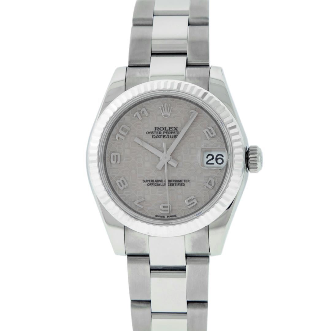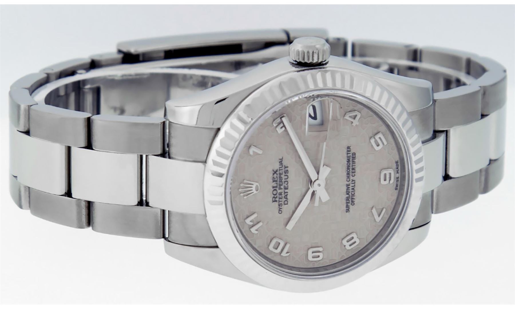 One Women's Midsize Stainless Steel Rolex Datejust Polished, Serviced & Electronically Tested, Rolex Stainless Steel Case : 31mm, Rolex Stainless Steel Crown, Rolex Bezel: 18K White Gold Fluted Bezel, Crystal: Sapphire With Cyclops Lens. Hands: White Hands. Rolex Movement: Automatic Winding Movement Caliber 2235. Rolex Dial: Cream Jubilee Dial With Arabic Hour Markers, Date Window: 3 O'Clock Position Date Display, Quickset, Model: Midsize Datejust. Condition: G-6 Extra Fine. Rolex Bracelet: Stainless Steel Oyster Band. Bright Polish. 6.0 Inch Length, Adjustable. Standard Clasp, With Rolex Logo. This Pre Owned Watch Has Been Serviced Time Tested And Is In Excellent Condition It Is Free Of All Scratches And Dents.