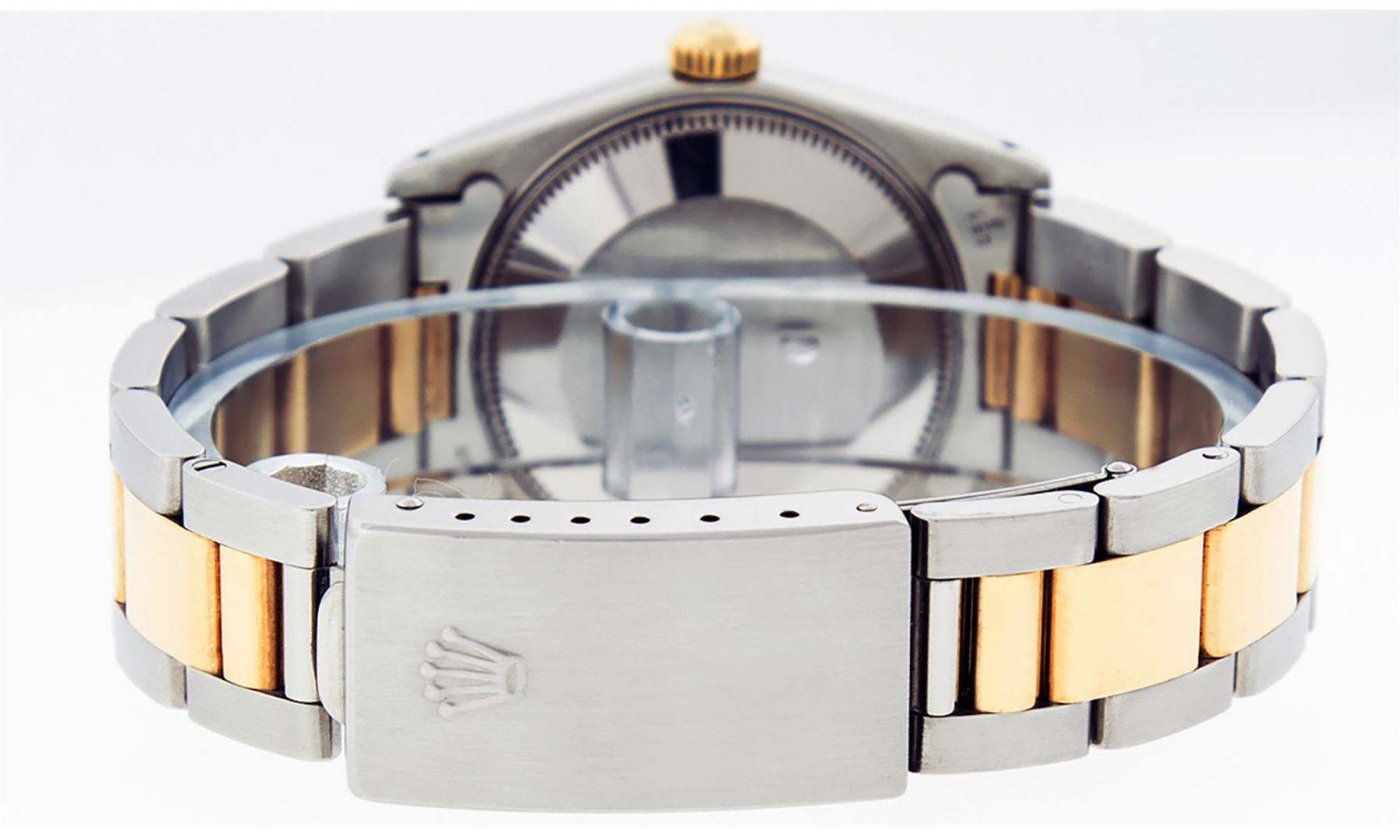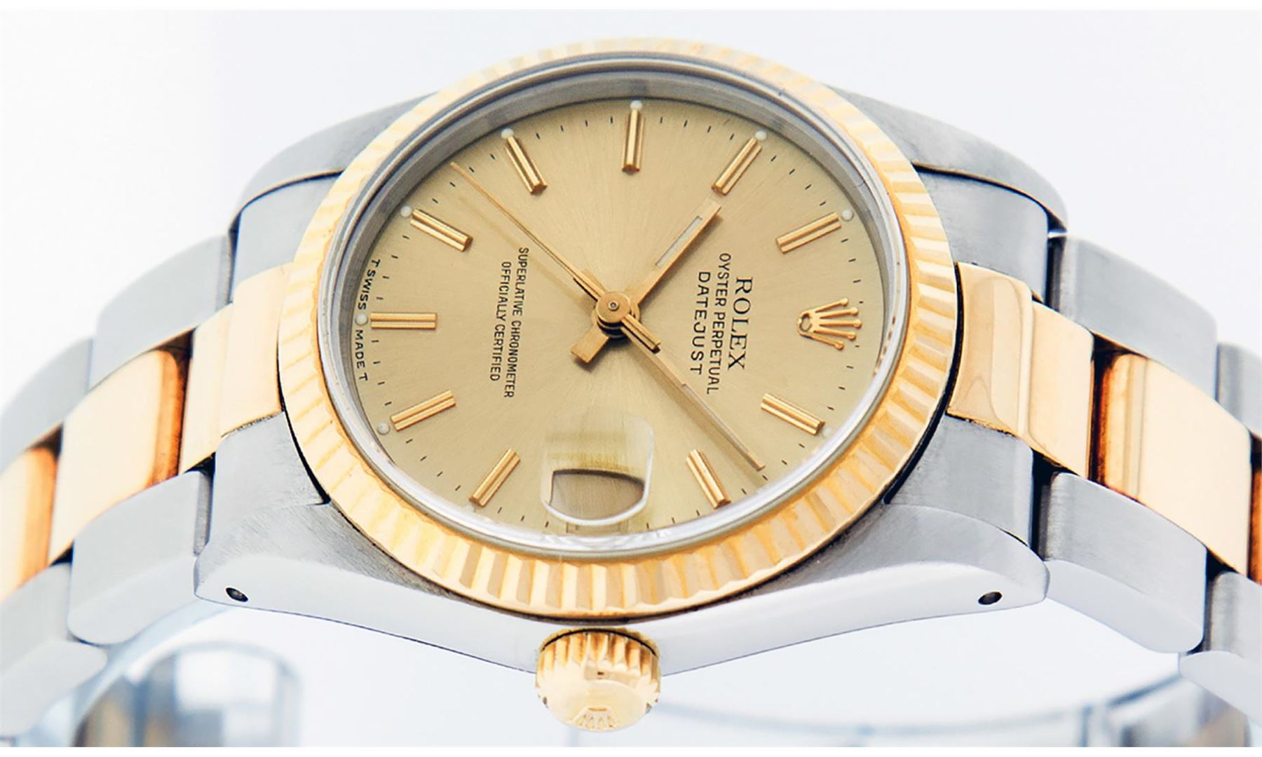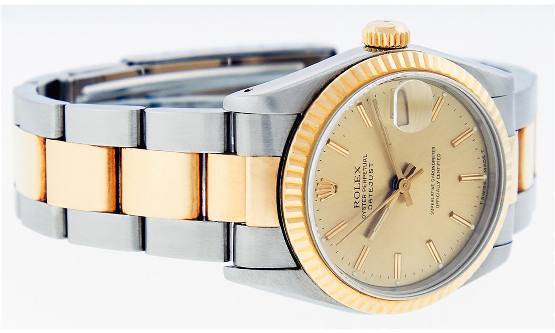 One Women's Midsize 18K Yellow Gold And Stainless Steel Rolex Datejust Polished, Serviced & Electronically Tested, Rolex Stainless Steel Case 31mm, Rolex Yellow Gold Crown, Rolex Bezel: 18K Yellow Gold Fluted Bezel. Crystal: Sapphire With Magnified Date Window. Hands: Luminescent Hands. Rolex Movement: Automatic Winding Movement Caliber 2135. Rolex Dial: Champagne Index Dial With Dash Track And Lumi Dots, Date Window: 3 O'Clock Position Date Display, Quickset, Model: Midsize Quickset Datejust. Condition: G-6 Extra Fine. Rolex Bracelet: 18K Yellow Gold And Stainless Steel Oyster Band. Bright Polish. 6.0 Inch Length, Adjustable. Standard Clasp, With Rolex Logo. This Pre Owned Watch Has Been Serviced Time Tested And Is In Excellent Condition It Is Free Of All Scratches And Dents.