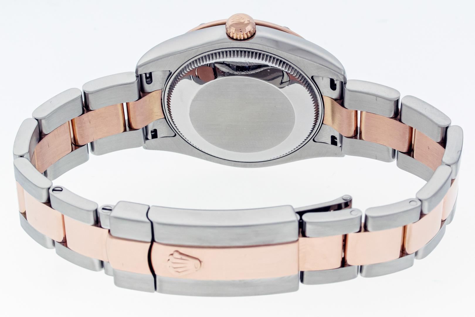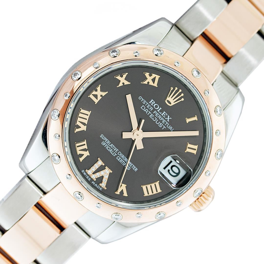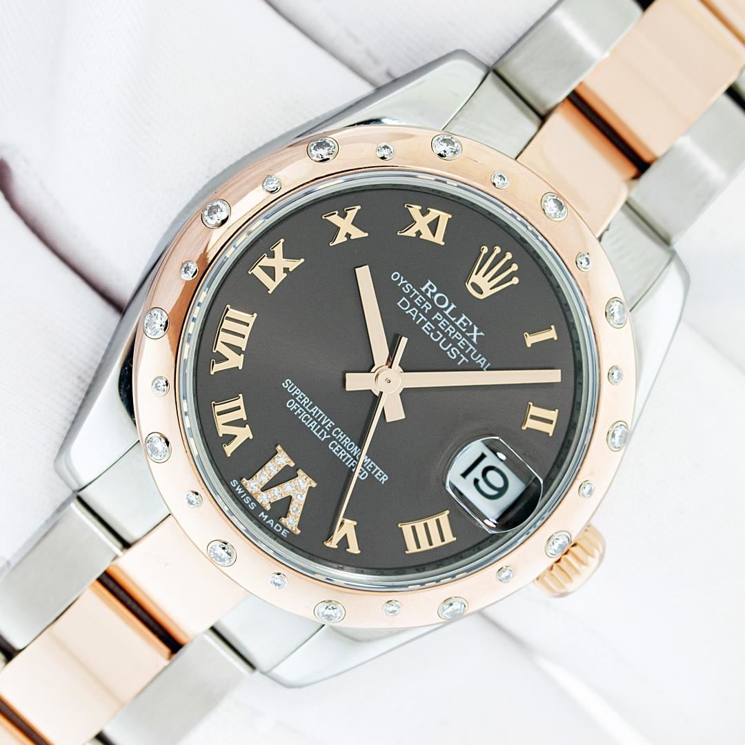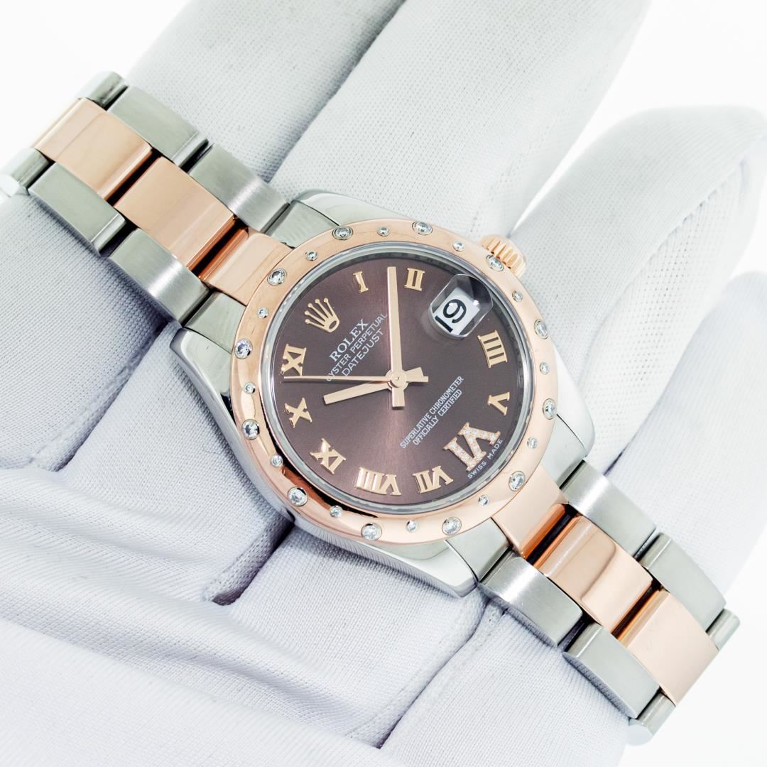 One Women's Pre Owned Midsize 31MM Stainless Steel and 18K Rose Gold Rolex Datejust Polished, Serviced & Electronically Tested, Rolex Stainless Steel & 18K Rose Gold Case: 31mm, Rolex Rose Gold Crown, Rolex Bezel: 18K Rose Gold Diamond Bezel, Diamond Count: 24 Diamonds On Bezel, Color: G To H, Clarity: VS2-SI1. Crystal: Sapphire With Magnified Date Window. Hands: Solid Hands. Rolex Movement: Automatic Winding Movement Caliber 2235. Rolex Dial: Chocolate Roman Dial WIth Diamond Six Hour Marker. Date Window: 3 O'Clock Position Date Display, Quickset, Model: Midsize Datejust. Condition: G-6 Extra Fine. Rolex Bracelet: Stainless Steel and 18K Rose Gold Oyster Band. Bright Polish. 6.0 Inch Length, Adjustable. Standard Clasp, With Rolex Logo. This Watch Has Been Serviced Time Tested And Is In Excellent Condition It Is Free Of All Scratches And Dents.
