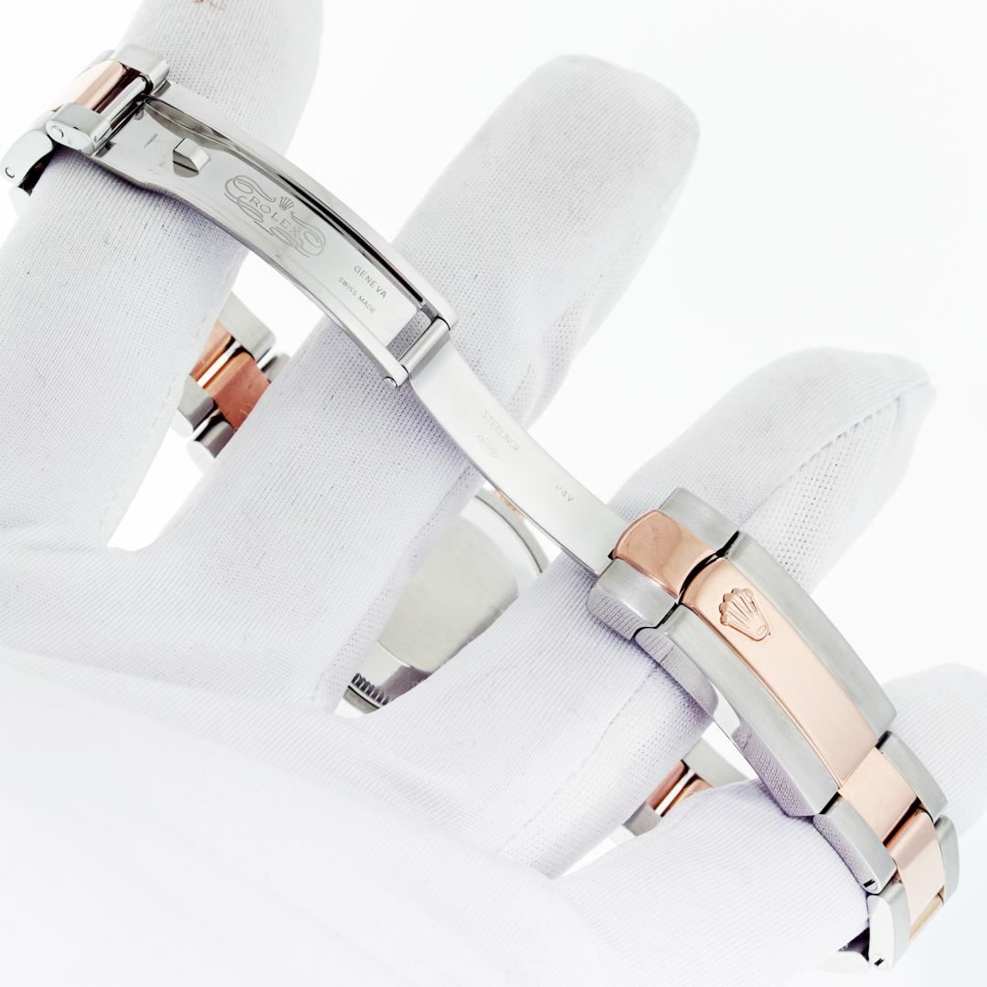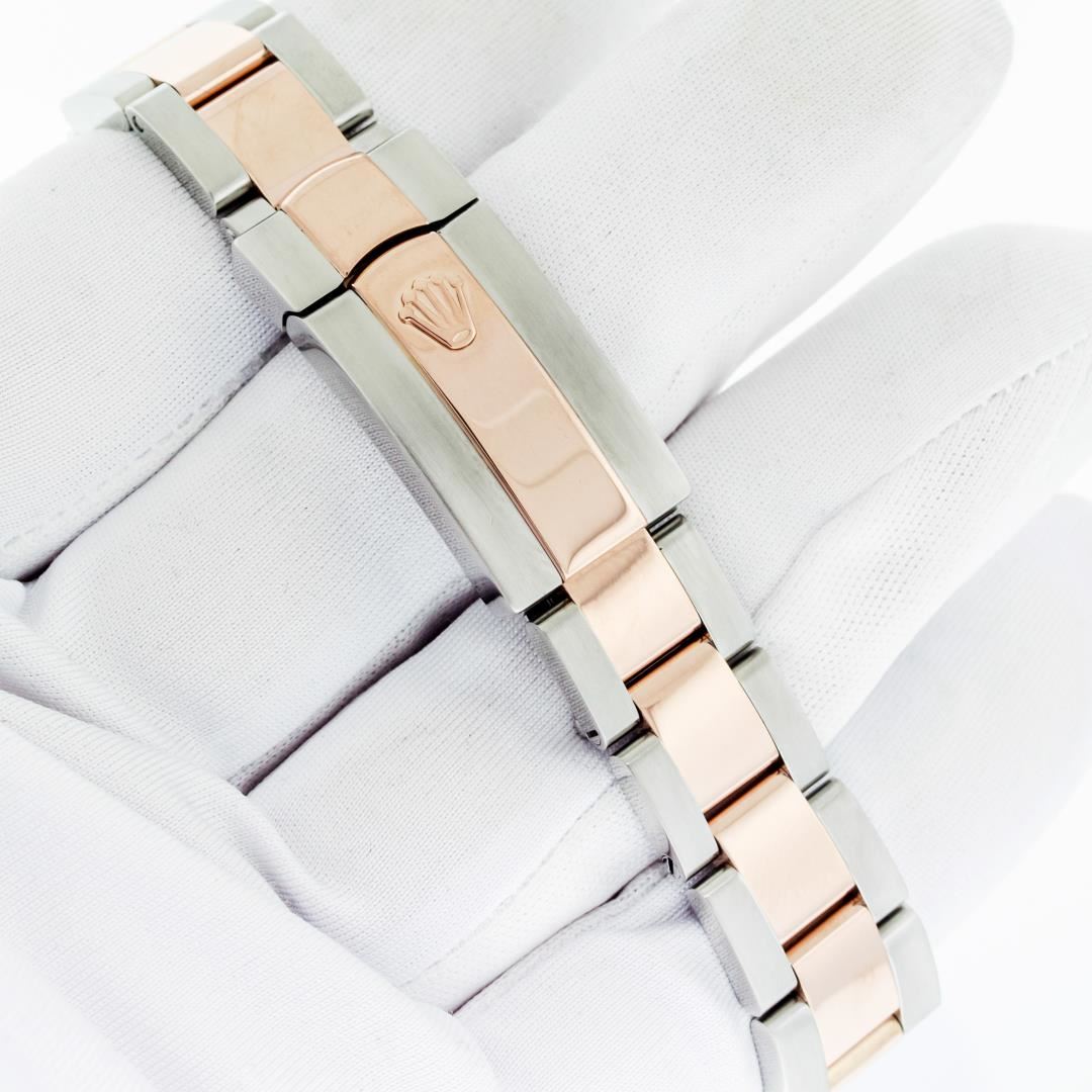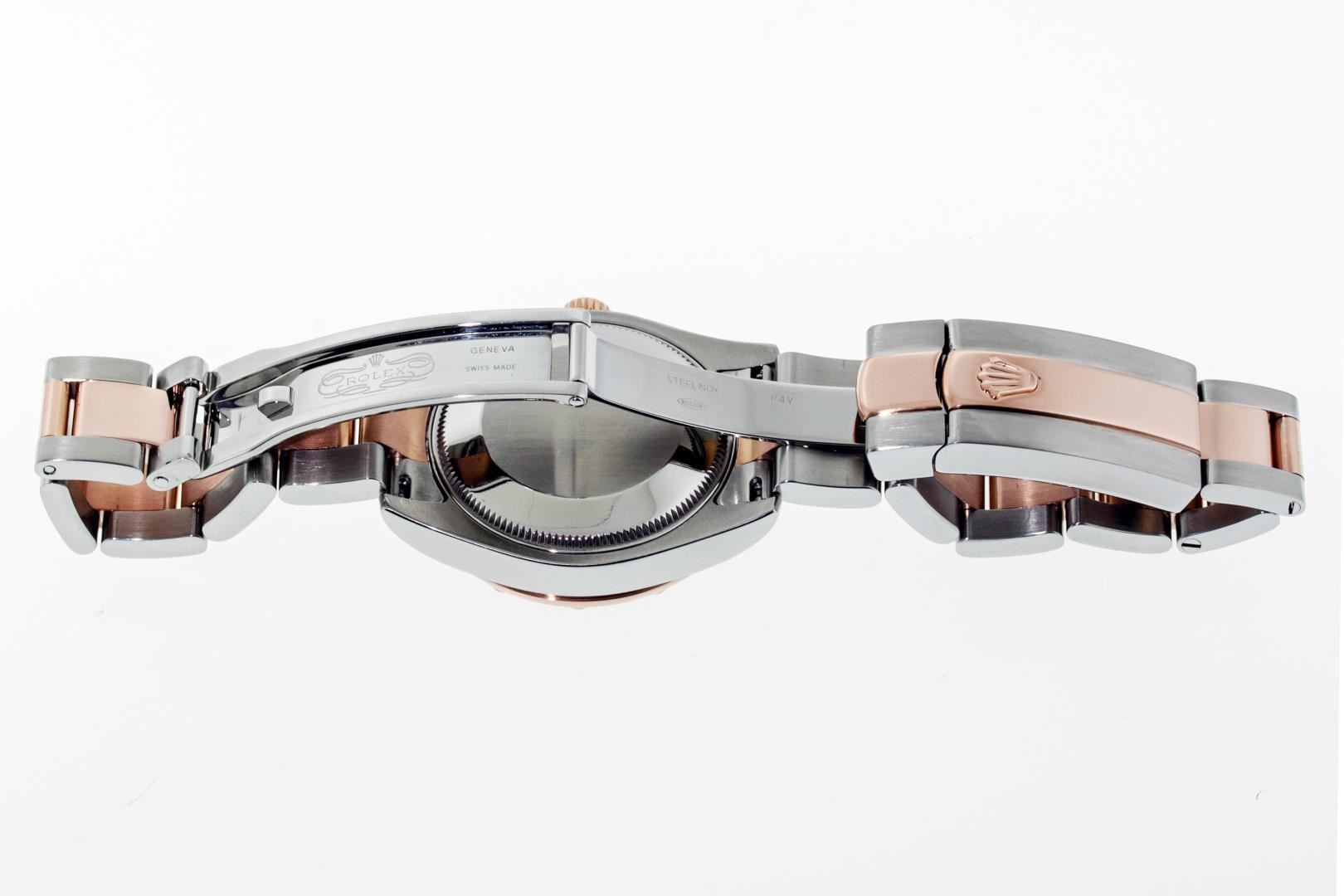 One Women's Pre Owned Midsize 31MM Stainless Steel and 18K Rose Gold Rolex Datejust Polished, Serviced & Electronically Tested, Rolex Stainless Steel & 18K Rose Gold Case: 31mm, Rolex Rose Gold Crown, Rolex Bezel: 18K Rose Gold Diamond Bezel, Diamond Count: 24 Diamonds On Bezel, Color: G To H, Clarity: VS2-SI1. Crystal: Sapphire With Magnified Date Window. Hands: Solid Hands. Rolex Movement: Automatic Winding Movement Caliber 2235. Rolex Dial: Chocolate Roman Dial WIth Diamond Six Hour Marker. Date Window: 3 O'Clock Position Date Display, Quickset, Model: Midsize Datejust. Condition: G-6 Extra Fine. Rolex Bracelet: Stainless Steel and 18K Rose Gold Oyster Band. Bright Polish. 6.0 Inch Length, Adjustable. Standard Clasp, With Rolex Logo. This Watch Has Been Serviced Time Tested And Is In Excellent Condition It Is Free Of All Scratches And Dents.
