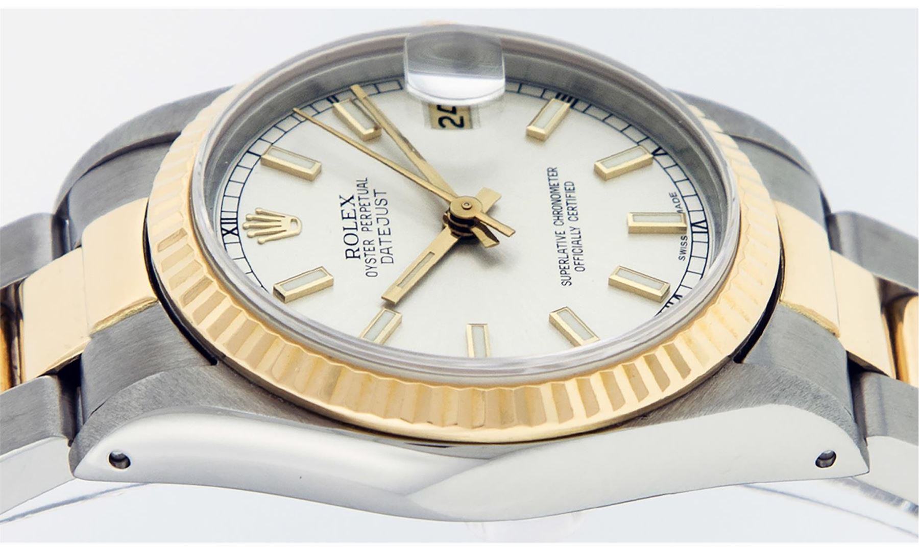 One Women's Rolex Midsize 18K Yellow Gold And Stainless Steel Datejust Polished, Serviced & Electronically Tested, Rolex Yellow Gold And Stainless Steel Case : 31mm, Rolex Stainless Steel Crown, Rolex Bezel: 18K Rolex Yellow Gold Fluted Bezel, Color: G To H, Clarity: VS2-SI1. Custom Crystal: New Sapphire With Magnified Date Window. Custom Hands: New Luminescent Hands. Rolex Movement: Automatic Winding Movement Caliber 2135. Rolex Dial: Silver Index Dial With Roman Track. Date Window: 3 O'Clock Position Date Display, Quickset, Model: Midsize Quickset Datejust. Condition: G-6 Extra Fine. Rolex Bracelet: 18K Yellow Gold And Stainless Steel Oyster Band. Bright Polish. 6.0 Inch Length, Adjustable. Standard Clasp, With Rolex Logo. This Pre Owned Watch Has Been Serviced Time Tested And Is In Excellent Condition It Is Free Of All Scratches And Dents.