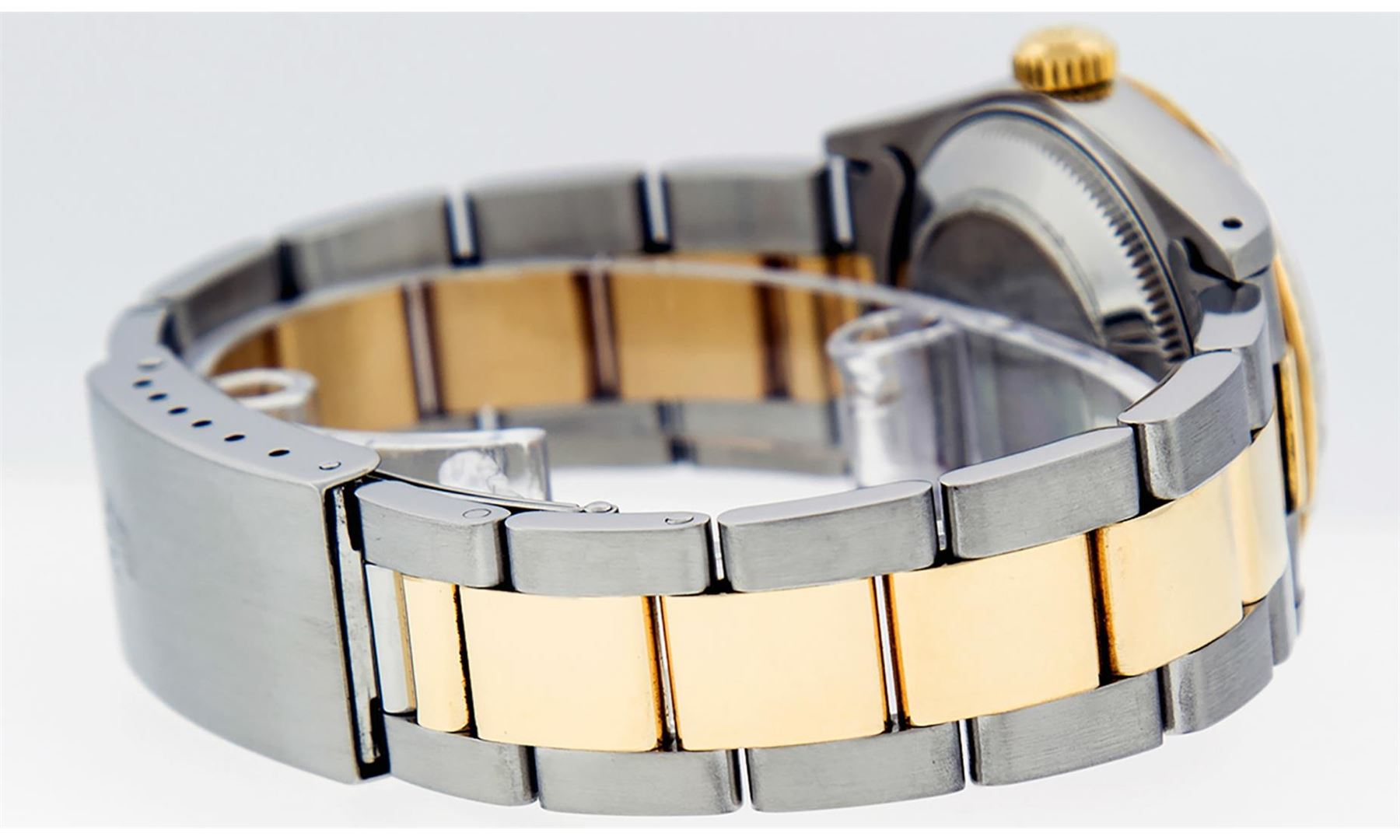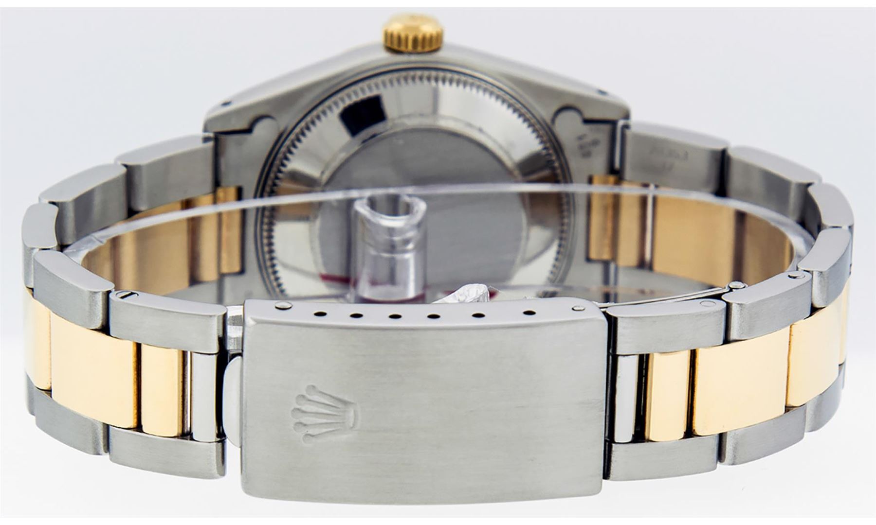 One Women's Rolex Midsize 18K Yellow Gold And Stainless Steel Datejust Polished, Serviced & Electronically Tested, Rolex Yellow Gold And Stainless Steel Case : 31mm, Rolex Stainless Steel Crown, Rolex Bezel: 18K Rolex Yellow Gold Fluted Bezel, Color: G To H, Clarity: VS2-SI1. Custom Crystal: New Sapphire With Magnified Date Window. Custom Hands: New Luminescent Hands. Rolex Movement: Automatic Winding Movement Caliber 2135. Rolex Dial: Silver Index Dial With Roman Track. Date Window: 3 O'Clock Position Date Display, Quickset, Model: Midsize Quickset Datejust. Condition: G-6 Extra Fine. Rolex Bracelet: 18K Yellow Gold And Stainless Steel Oyster Band. Bright Polish. 6.0 Inch Length, Adjustable. Standard Clasp, With Rolex Logo. This Pre Owned Watch Has Been Serviced Time Tested And Is In Excellent Condition It Is Free Of All Scratches And Dents.