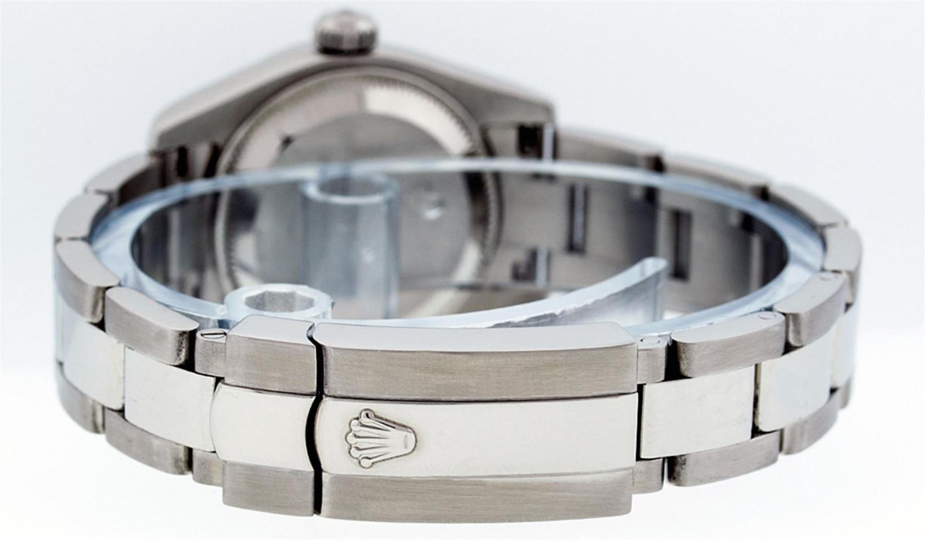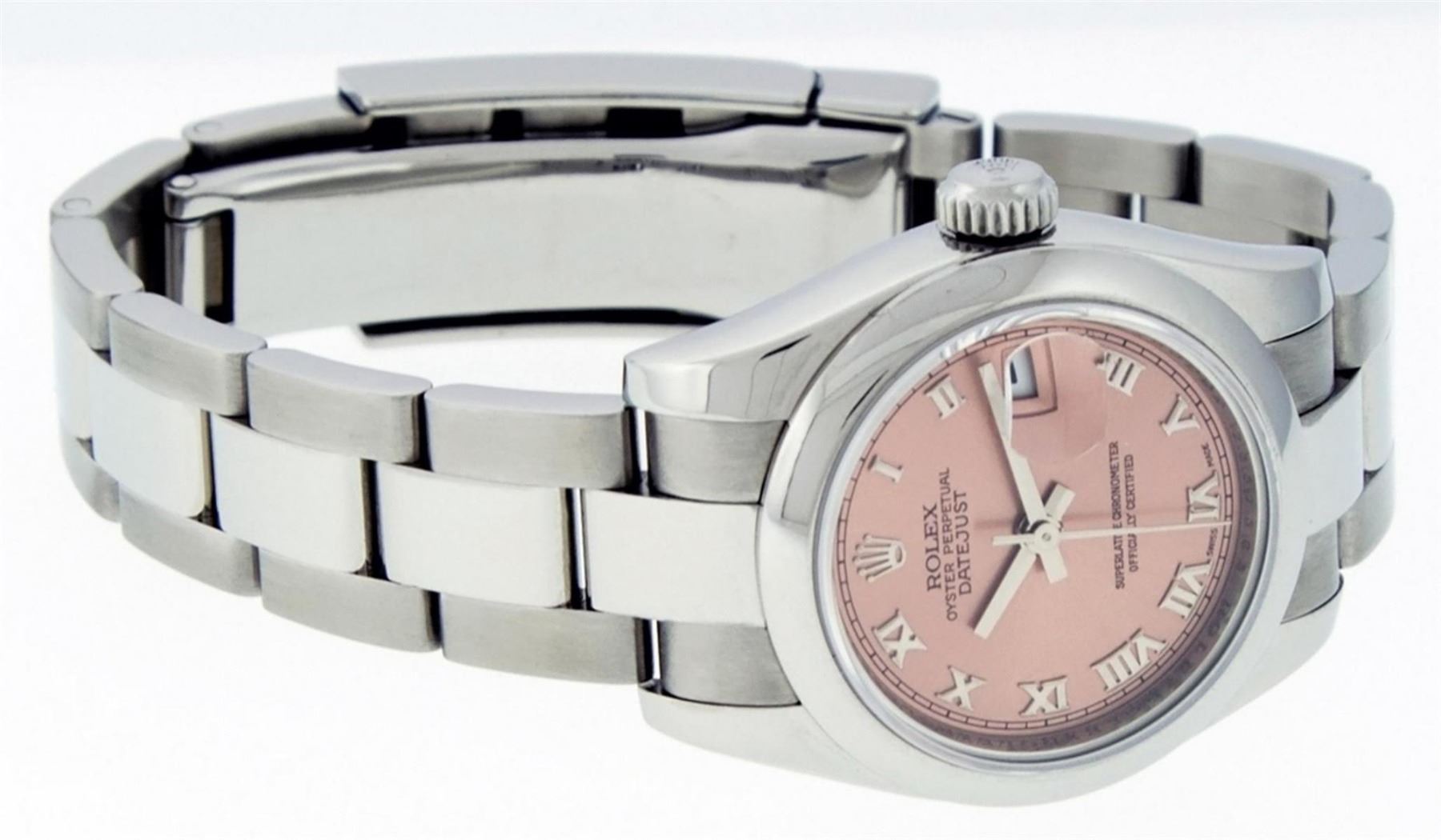 One New Style Ladies Quickset Stainless Steel Rolex Datejust Polished Bright with Satin Finish, Serviced & Electronically Tested, Stainless Steel Case: 26mm, Stainless Steel Crown, Bezel: Stainless Steel Smooth Bezel. Custom Crystal: New Scratch Resistant Sapphire Cyclops Lens. Custom Hands: New Luminescent Hands. Movement: Automatic Winding Movement. Custom Dial: Refinished Salmon Roman Dial With Square Track, Color: G to H, Clarity: VS. Date Window: 3 O'Clock Position Date Display, Model: 179160 Quickset Datejust. Condition: G-6 Extra Fine. Bracelet: Stainless Steel Oyster Band. Bright Polish & Satin Finish. 6.0 Inch Length, Adjustable. Standard Clasp, With Rolex Logo. This Watch Has Been Serviced Time Tested And Is In Excellent Condition It Is Free Of All Scratches And Dents.