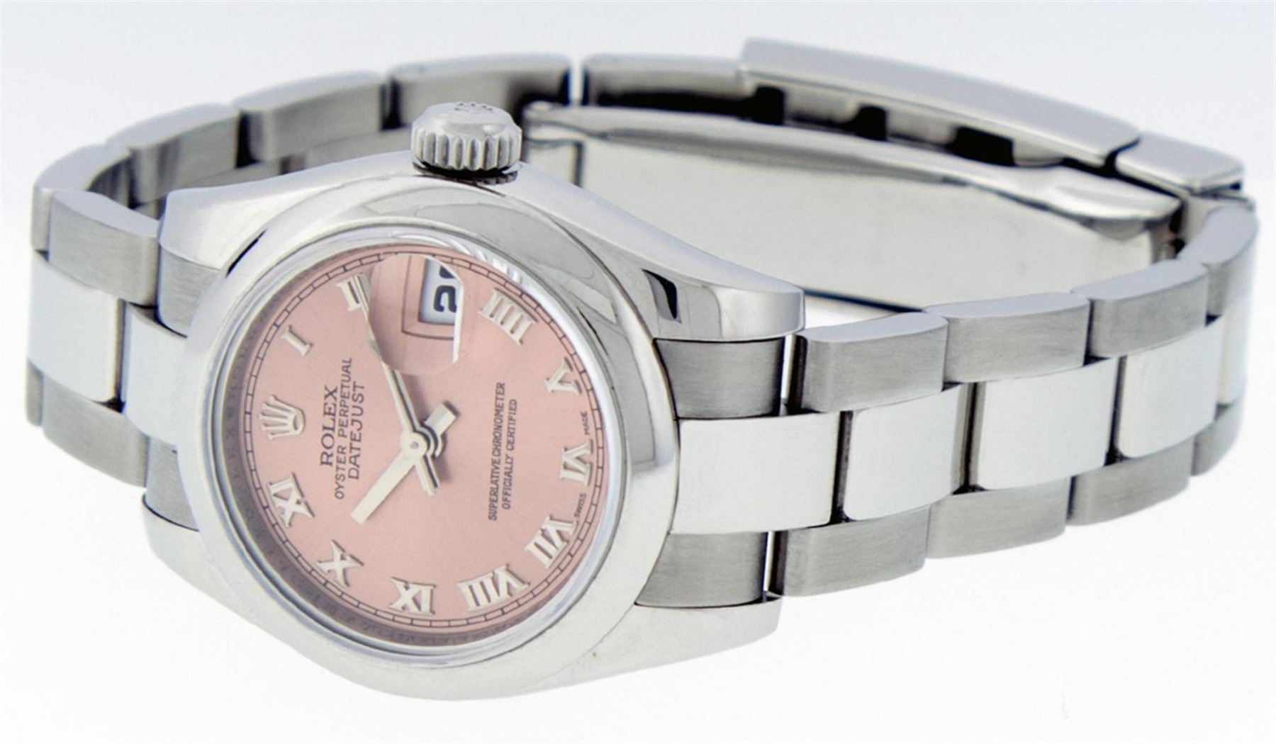 One New Style Ladies Quickset Stainless Steel Rolex Datejust Polished Bright with Satin Finish, Serviced & Electronically Tested, Stainless Steel Case: 26mm, Stainless Steel Crown, Bezel: Stainless Steel Smooth Bezel. Custom Crystal: New Scratch Resistant Sapphire Cyclops Lens. Custom Hands: New Luminescent Hands. Movement: Automatic Winding Movement. Custom Dial: Refinished Salmon Roman Dial With Square Track, Color: G to H, Clarity: VS. Date Window: 3 O'Clock Position Date Display, Model: 179160 Quickset Datejust. Condition: G-6 Extra Fine. Bracelet: Stainless Steel Oyster Band. Bright Polish & Satin Finish. 6.0 Inch Length, Adjustable. Standard Clasp, With Rolex Logo. This Watch Has Been Serviced Time Tested And Is In Excellent Condition It Is Free Of All Scratches And Dents.