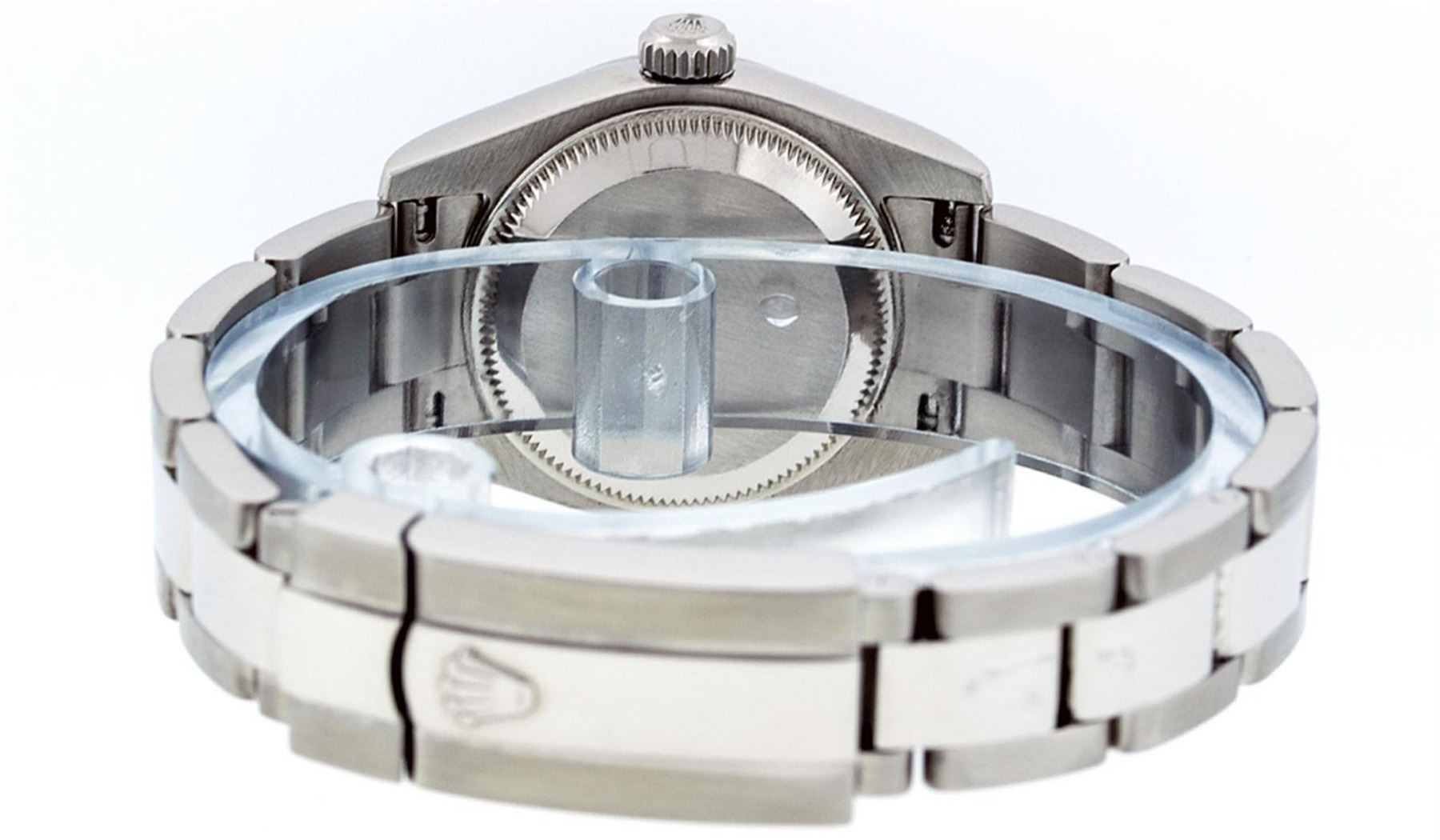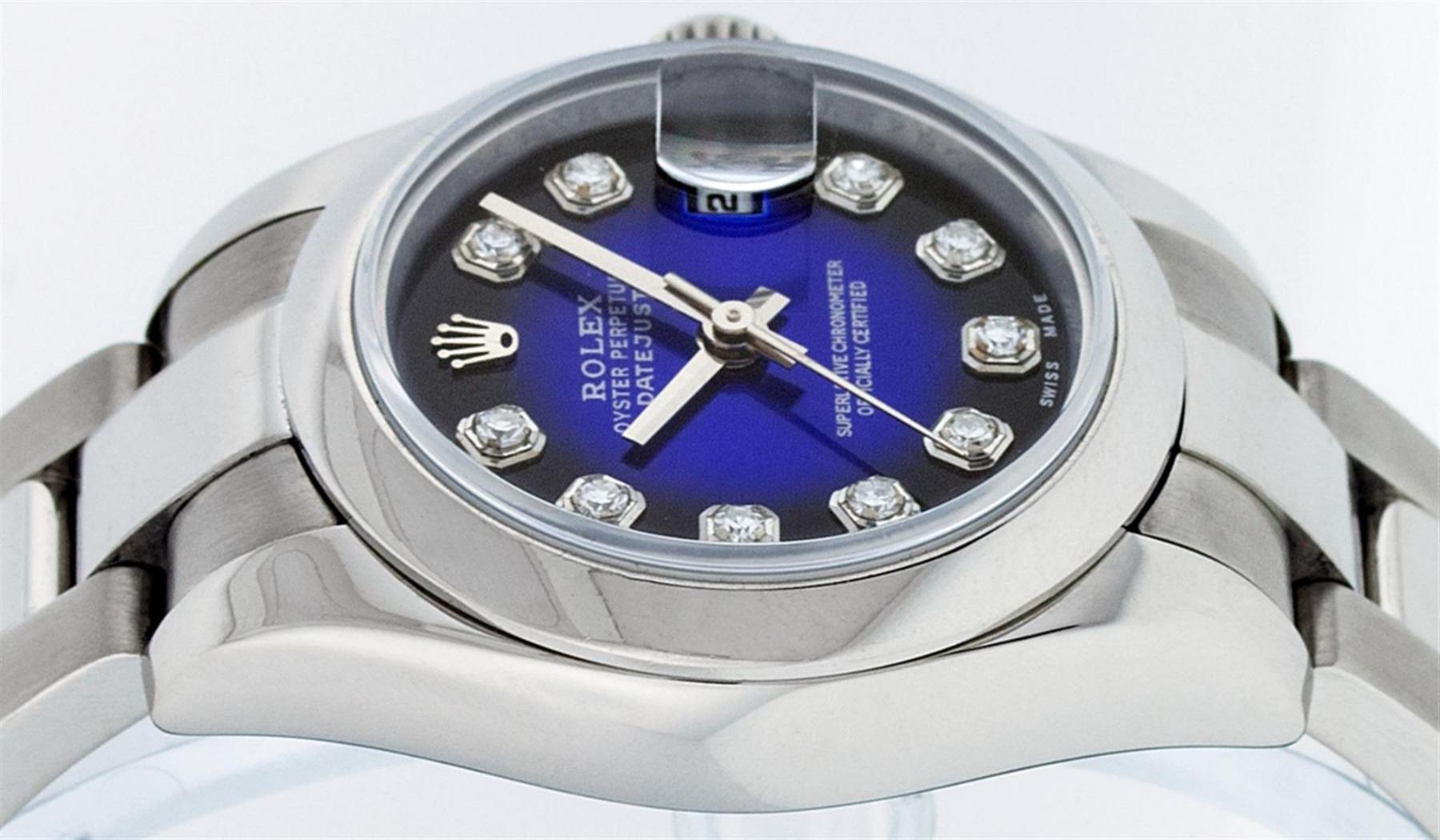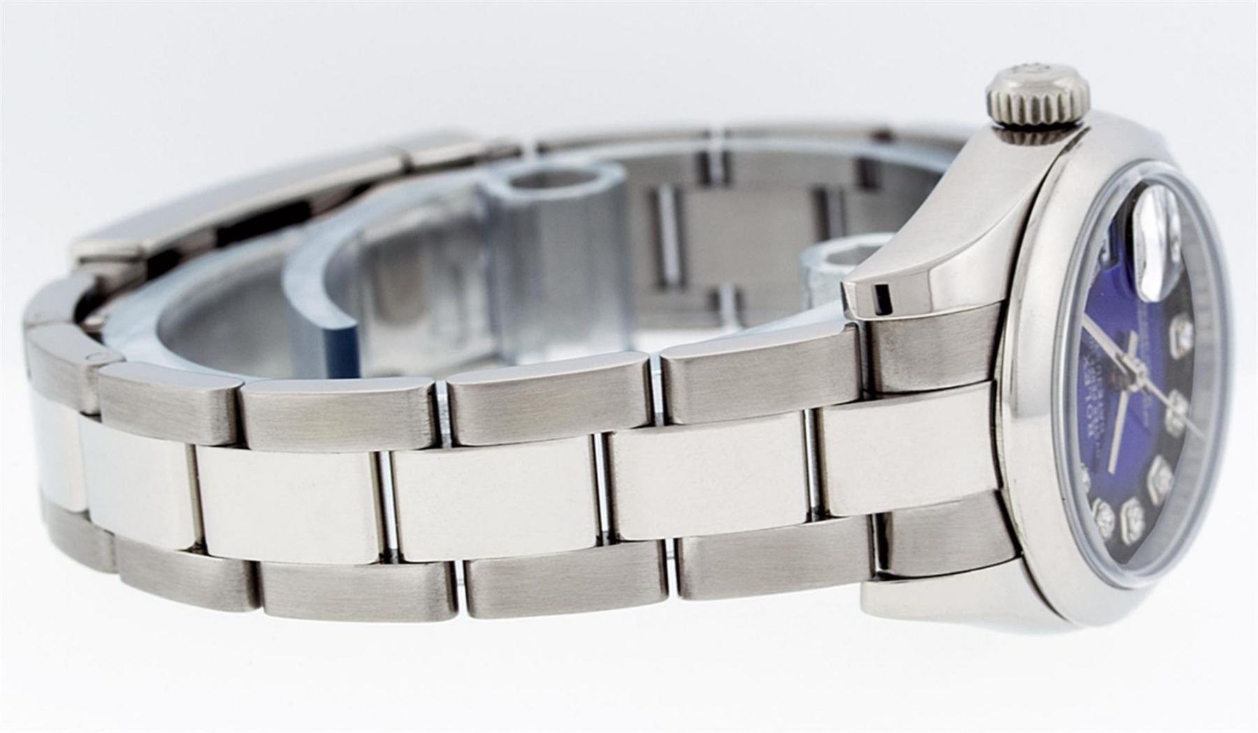 One New Style Ladies Quickset Stainless Steel Rolex Datejust Polished Bright with Satin Finish, Serviced & Electronically Tested, Stainless Steel Case: 26mm, Stainless Steel Crown, Bezel: Stainless Steel Smooth Bezel. Custom Crystal: New Scratch Resistant Sapphire Cyclops Lens. Custom Hands: New Luminescent Hands. Movement: Automatic Winding Movement. Custom Dial: Blue Vignette Single Cut VS Diamond Dial, Diamond Count: 10 Single Cut Diamonds In Dial, Color: G to H, Clarity: VS. Date Window: 3 O'Clock Position Date Display, Model: 179160 Quickset Datejust. Condition: G-6 Extra Fine. Bracelet: Stainless Steel Oyster Band. Bright Polish & Satin Finish. 6.0 Inch Length, Adjustable. Standard Clasp, With Rolex Logo. This Watch Has Been Serviced Time Tested And Is In Excellent Condition It Is Free Of All Scratches And Dents. This Watch Comes With A Rolex Box.