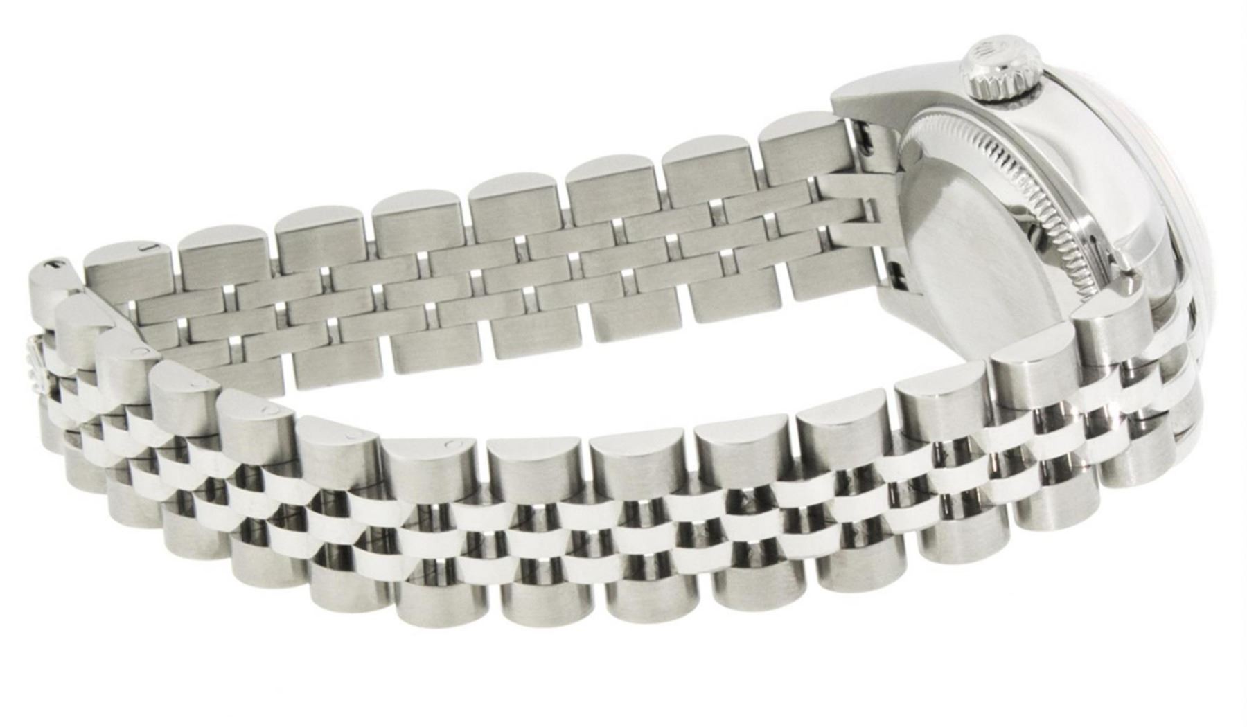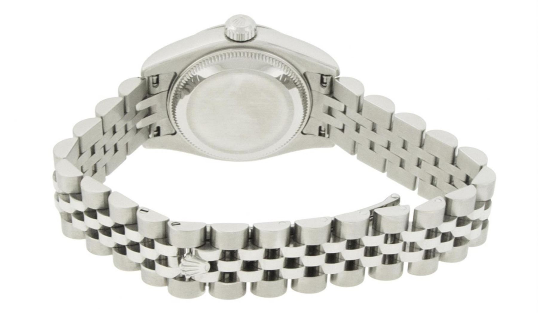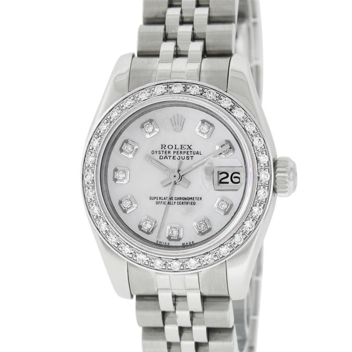 One New Style Quickset Ladies Stainless Steel Rolex Datejust Polished Bright with Satin Finish, Serviced & Electronically Tested, Stainless Steel Case: 26mm, Stainless Steel Crown, Custom Bezel: New 18K White Gold Beadset Diamond Bezel, Stone Count: 32 Diamonds On Bezel, Total Weight .70 Carat, Clarity: SI-VS, Color: G to H. Custom Crystal: New Scratch Resistant Synthetic Sapphire Cyclops Lens. Custom Hands: New Luminescent Hands. Movement: Automatic Winding Movement. Custom Dial: Refinished Mother Of Pearl Diamond Dial, Stone Count: 10 Diamonds On Dial, G To H In Color, Clarity: VS. Date Window: 3 O'Clock Position Date Display, Model: 179160 Quickjset Datejust. Condition: G-6 Extra Fine. Bracelet: Stainless Steel Jubilee Band. Bright Polish & Satin Finish. 6.0 Inch Length, Adjustable. Standard Clasp, With Rolex Logo. This Watch Has Been Serviced Time Tested And Is In Excellent Condition It Is Free Of All Scratches And Dents. This Watch Comes With A Rolex Box And Appraisal.