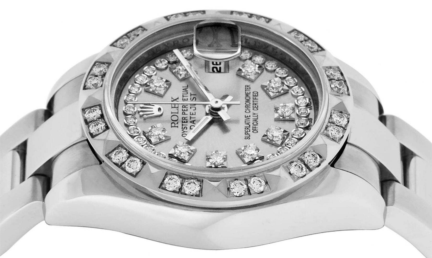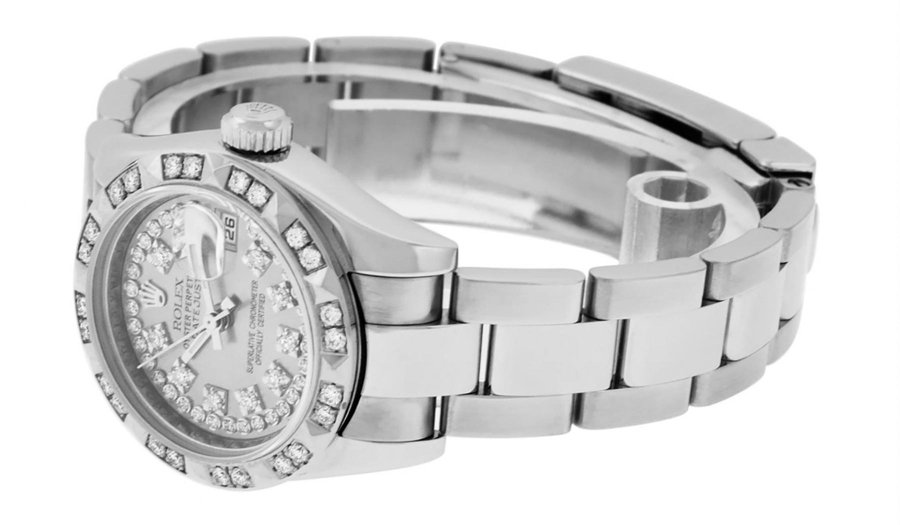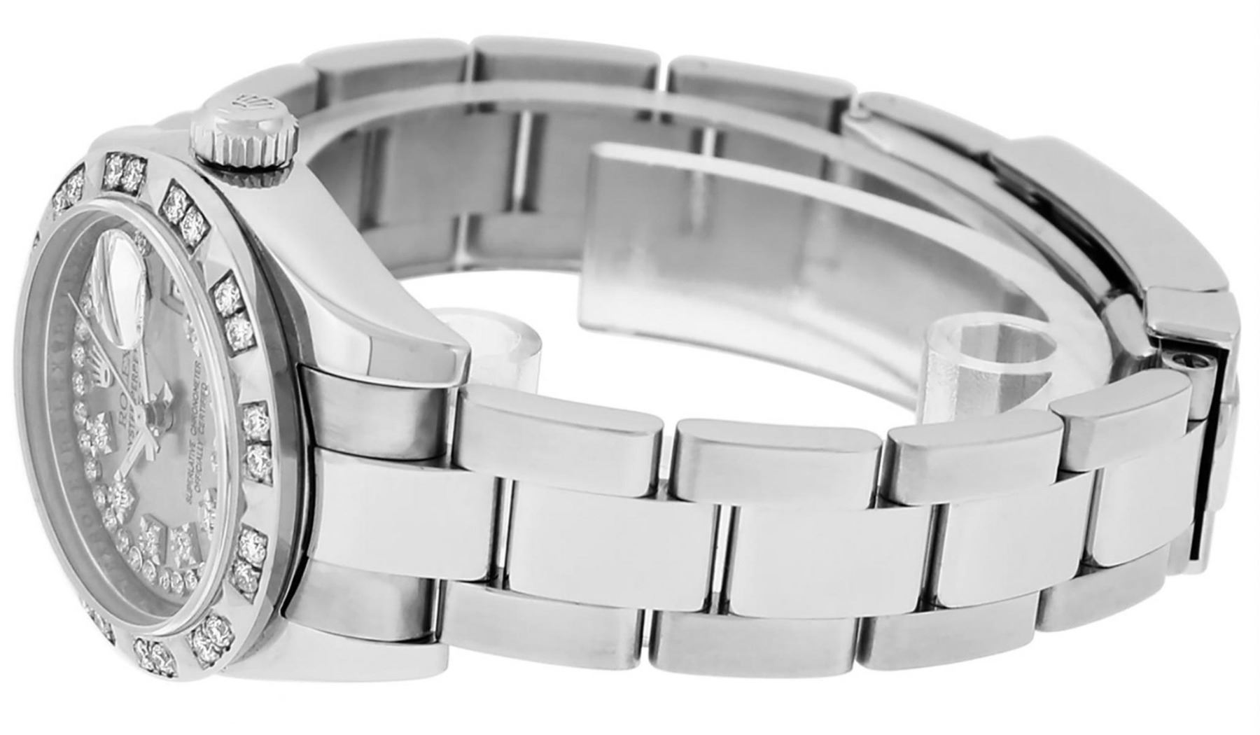 One New Style Quickset Ladies Stainless Steel Rolex Datejust Polished Bright with Satin Finish, Serviced & Electronically Tested, Stainless Steel Case: 26mm, Stainless Steel Crown, Custom Bezel: New 18K White Gold Pyramid Diamond Bezel, Stone Count: 24 Diamonds On Bezel, Total Weight .50 Carat, Clarity: SI-VS, Color: G to H. Custom Crystal: New Scratch Resistant Synthetic Sapphire Cyclops Lens. Custom Hands: New Luminescent Hands. Movement: Automatic Winding Movement. Custom Dial: Refinished Single Cut Slate Grey String String Diamond Dial, 43 Diamonds in Dial, G To H In Color, Clarity: VS. Date Window: 3 O'Clock Position Date Display, Model: 179160 Quickjset Datejust. Condition: G-6 Extra Fine. Bracelet: Stainless Steel Oyster Band. Bright Polish & Satin Finish. 6.0 Inch Length, Adjustable. Standard Clasp, With Rolex Logo. This Watch Has Been Serviced Time Tested And Is In Excellent Condition It Is Free Of All Scratches And Dents.