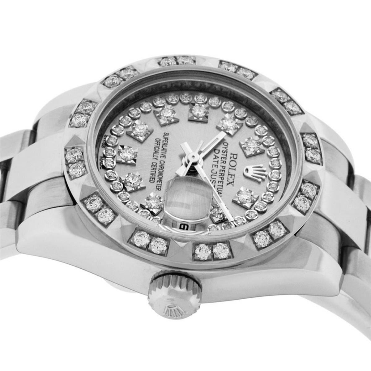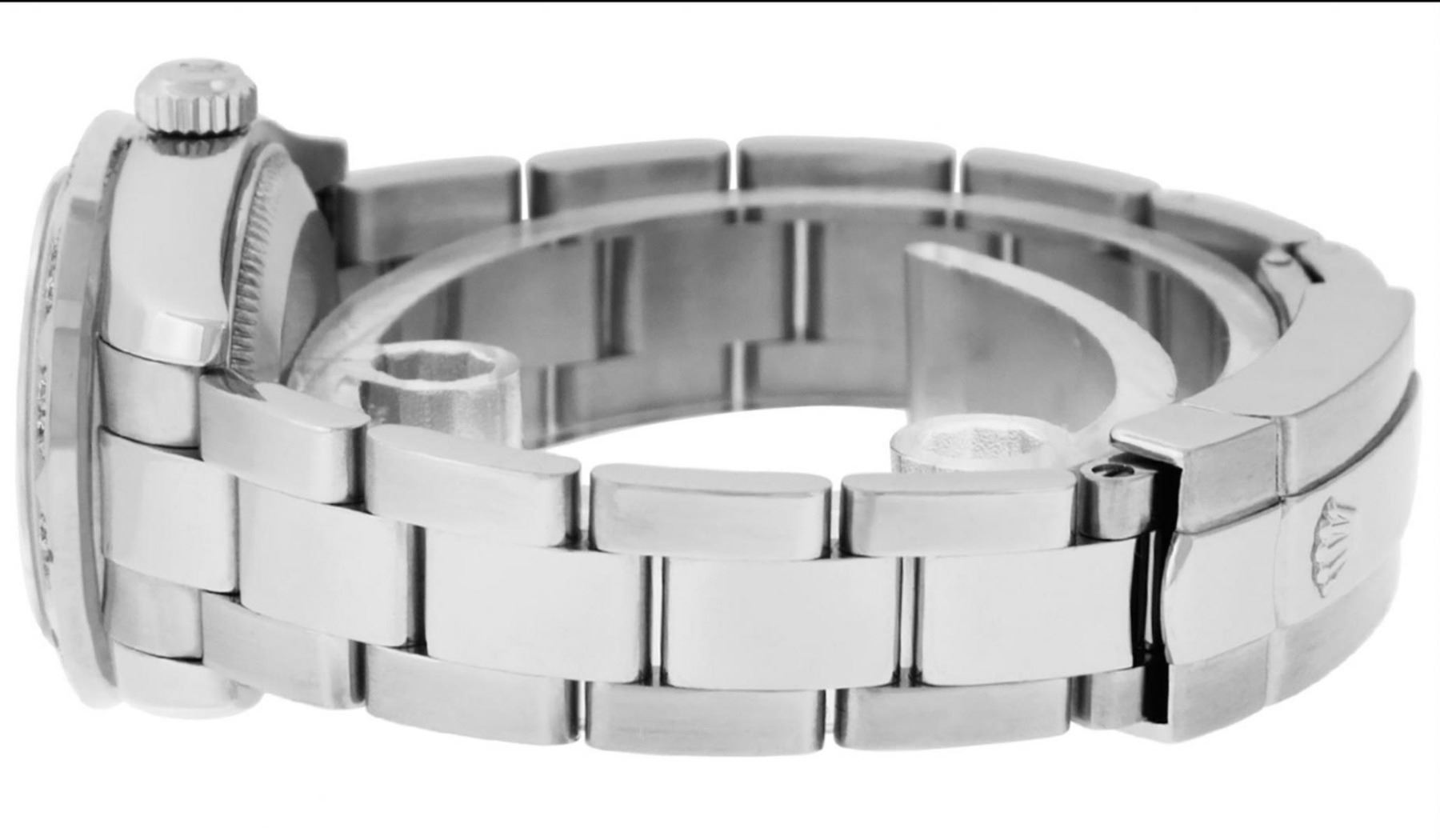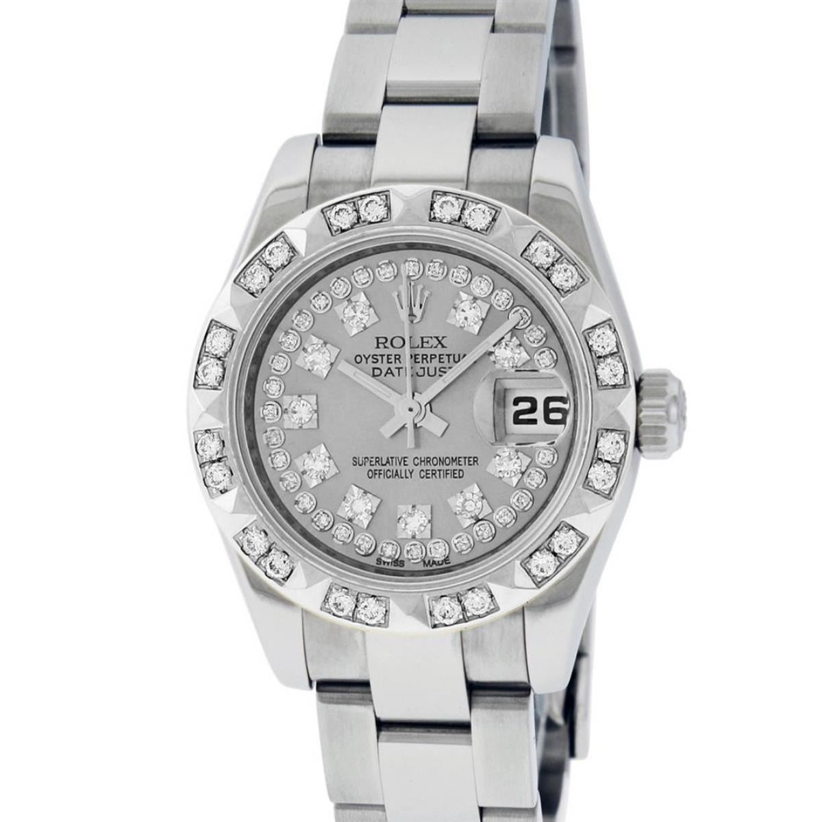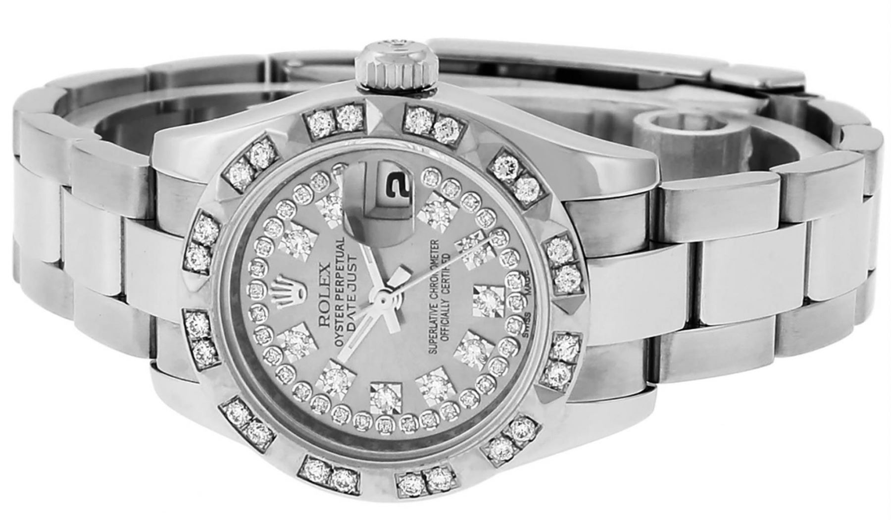 One New Style Quickset Ladies Stainless Steel Rolex Datejust Polished Bright with Satin Finish, Serviced & Electronically Tested, Stainless Steel Case: 26mm, Stainless Steel Crown, Custom Bezel: New 18K White Gold Pyramid Diamond Bezel, Stone Count: 24 Diamonds On Bezel, Total Weight .50 Carat, Clarity: SI-VS, Color: G to H. Custom Crystal: New Scratch Resistant Synthetic Sapphire Cyclops Lens. Custom Hands: New Luminescent Hands. Movement: Automatic Winding Movement. Custom Dial: Refinished Single Cut Slate Grey String String Diamond Dial, 43 Diamonds in Dial, G To H In Color, Clarity: VS. Date Window: 3 O'Clock Position Date Display, Model: 179160 Quickjset Datejust. Condition: G-6 Extra Fine. Bracelet: Stainless Steel Oyster Band. Bright Polish & Satin Finish. 6.0 Inch Length, Adjustable. Standard Clasp, With Rolex Logo. This Watch Has Been Serviced Time Tested And Is In Excellent Condition It Is Free Of All Scratches And Dents.