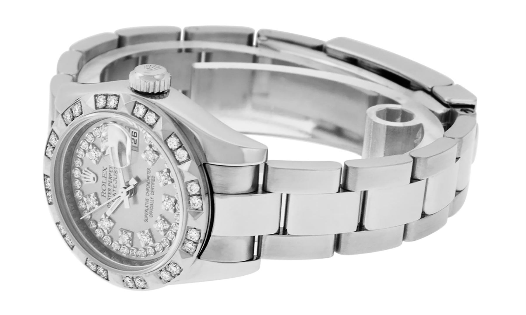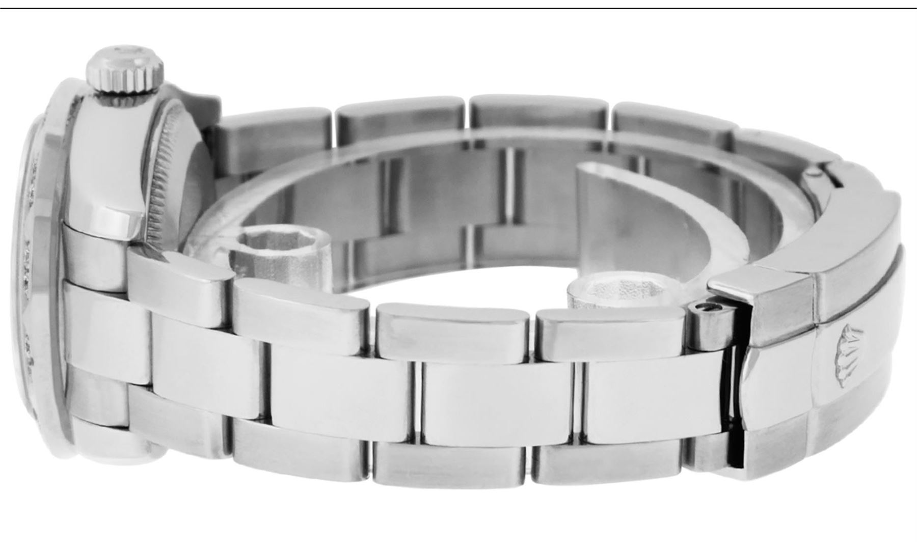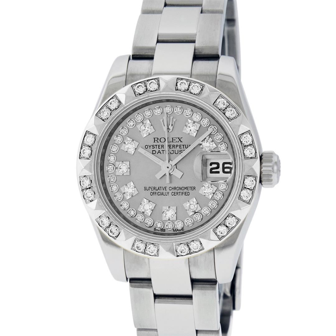 One New Style Quickset Ladies Stainless Steel Rolex Datejust Polished Bright with Satin Finish, Serviced & Electronically Tested, Stainless Steel Case: 26mm, Stainless Steel Crown, Custom Bezel: New 18K White Gold Pyramid Diamond Bezel, Stone Count: 24 Diamonds On Bezel, Clarity: SI-VS, Color: G to H. Custom Crystal: New Sapphire With Date Window. Custom Hands: New Luminescent Hands. Rolex Movement: Automatic Winding Movement. Custom Dial: Refinished Single Cut Slate Grey String String Diamond Dial, 43 Diamonds in Dial, G To H In Color, Clarity: VS. Date Window: 3 O'Clock Position Date Display, Model: 179160 Quickjset Datejust. Condition: G-6 Extra Fine. Rolex Bracelet: Stainless Steel Oyster Band. Bright Polish & Satin Finish. 6.0 Inch Length, Adjustable. Standard Clasp, With Rolex Logo. This Pre Owned Watch Has Been Serviced Time Tested And Is In Excellent Condition It Is Free Of All Scratches And Dents.