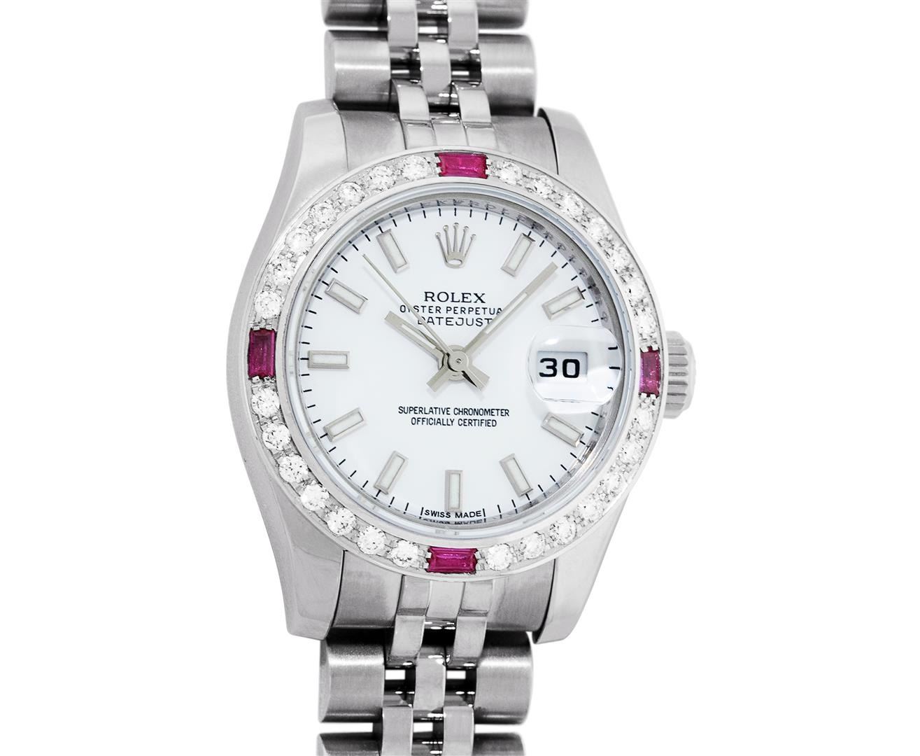 One Ladies Pre Owned Quickset Stainless Steel Rolex Datejust Polished Bright with Satin Finish, Serviced & Electronically Tested, Rolex Stainless Steel Case: 26mm. Rolex Stainless Steel Crown, Custom Bezel: New 18K White Gold Beadset And Ruby Bezel, Stone Count: 28 Diamonds + 4 Rubies, Diamond Color: G To H, Clarity: SI-VS. Crystal: Sapphire With Magnified Date Window. Hands: Lumi Hands. Rolex Movement: Quickset Automatic Winding Movement 2235. Rolex Dial: White Index With Dash Track. Date Window: 3 O'Clock Position Date Display, Model: Sapphire Quickset Datejust. Condition: G-6 Extra Fine. Rolex Bracelet: Stainless Steel Jubilee Band With Hidden Clasp. Bright Polish & Satin Finish. 6.0 Inch Length, Adjustable. Hidden Clasp, With Rolex Logo. This Watch Has Been Serviced Time Tested And Is In Excellent Condition It Is Free Of All Scratches And Dents.