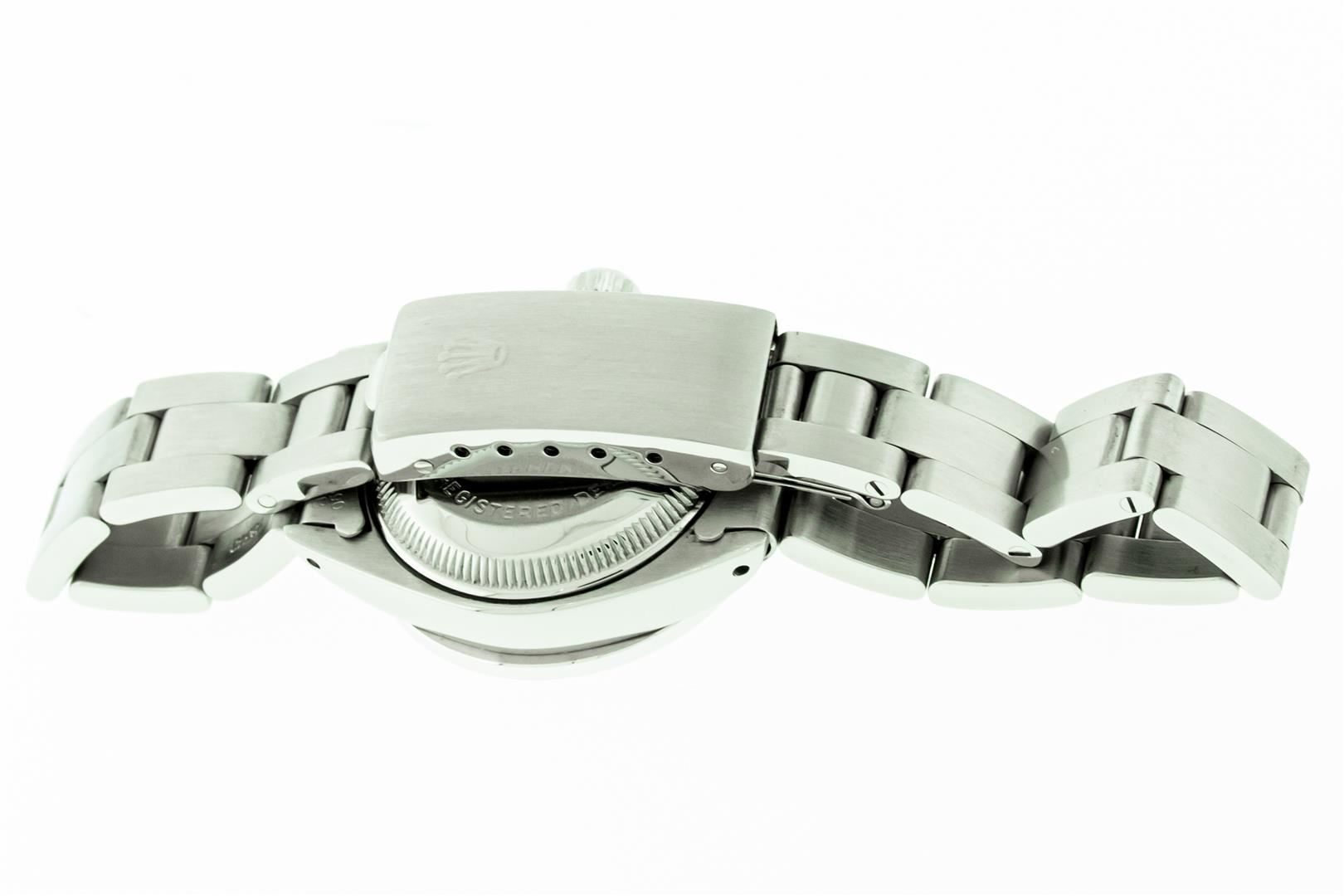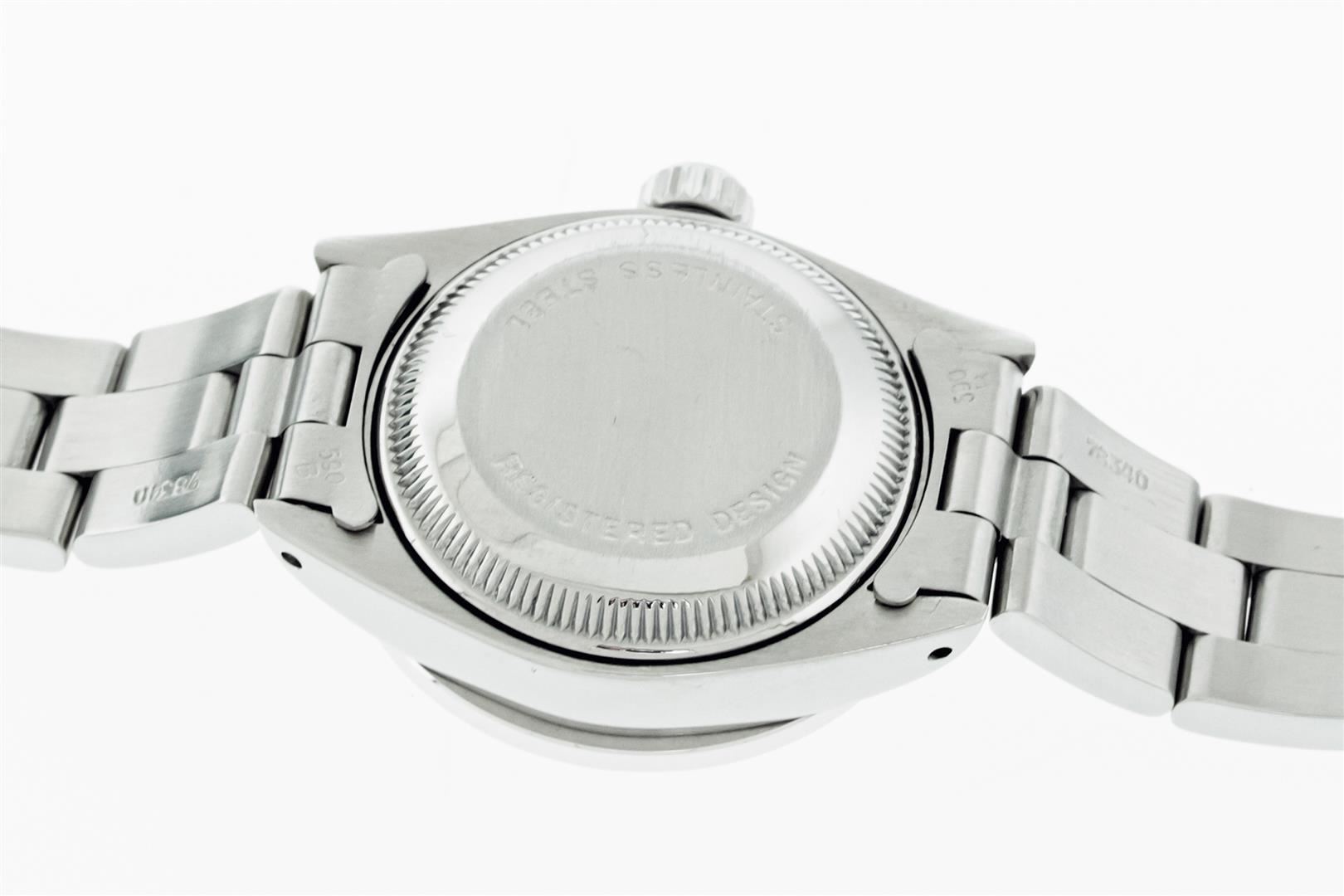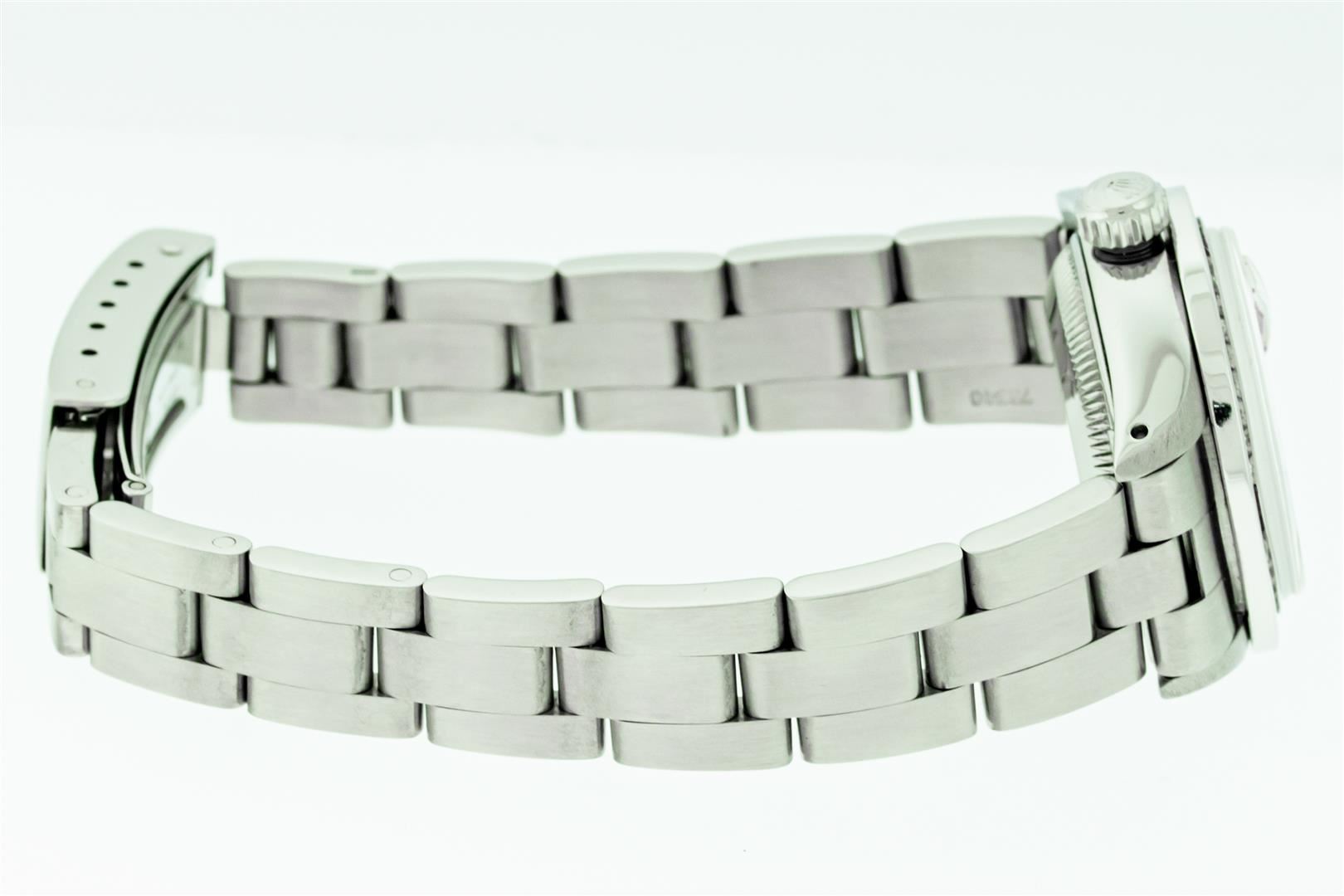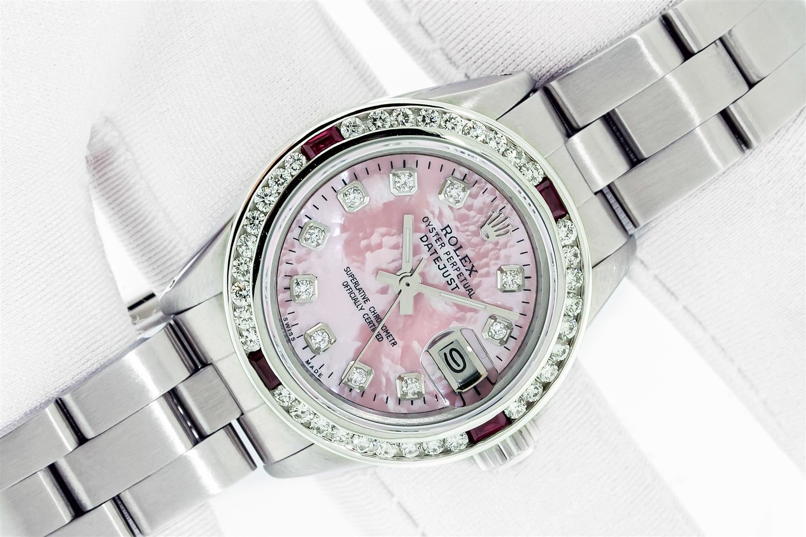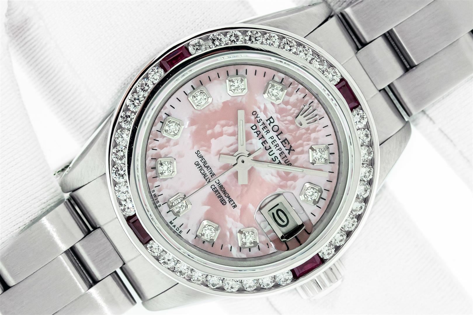 One Ladies Stainless Steel Rolex Datejust Polished Bright with Satin Finish, Serviced & Electronically Tested, Rolex Stainless Steel Case: 26mm, Rolex Stainless Steel Crown, Custom Bezel: New 18K White Gold Ruby Channel Set Diamond Bezel, Diamond + Gem Count: 36 Diamonds + 4 Rubies Clarity: SI-VS, Color: G to H. Custom Crystal: New Sapphire With Magnified Date Window. Custom Hands: New Luminescent Hands. Movement: Automatic Winding Movement. Custom Dial: Pink Mother Of Pearl With Custom Added Diamond Hour Markers. Date Window: 3 O'clock Position Date Display, Model: Datejust. Condition: G-6 Extra Fine. Rolex Bracelet: Stainless Steel Jubilee. Bright Polish & Satin Finish. 6.0 Inch Length, Adjustable. Standard Clasp, With Rolex Logo. This Pre Owned Watch Has Been Serviced Time Tested And Is In Excellent Condition It Is Free Of All Scratches And Dents.