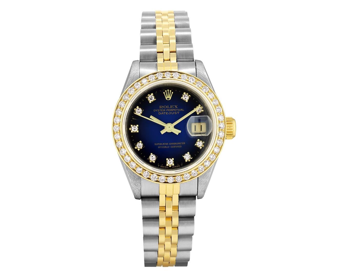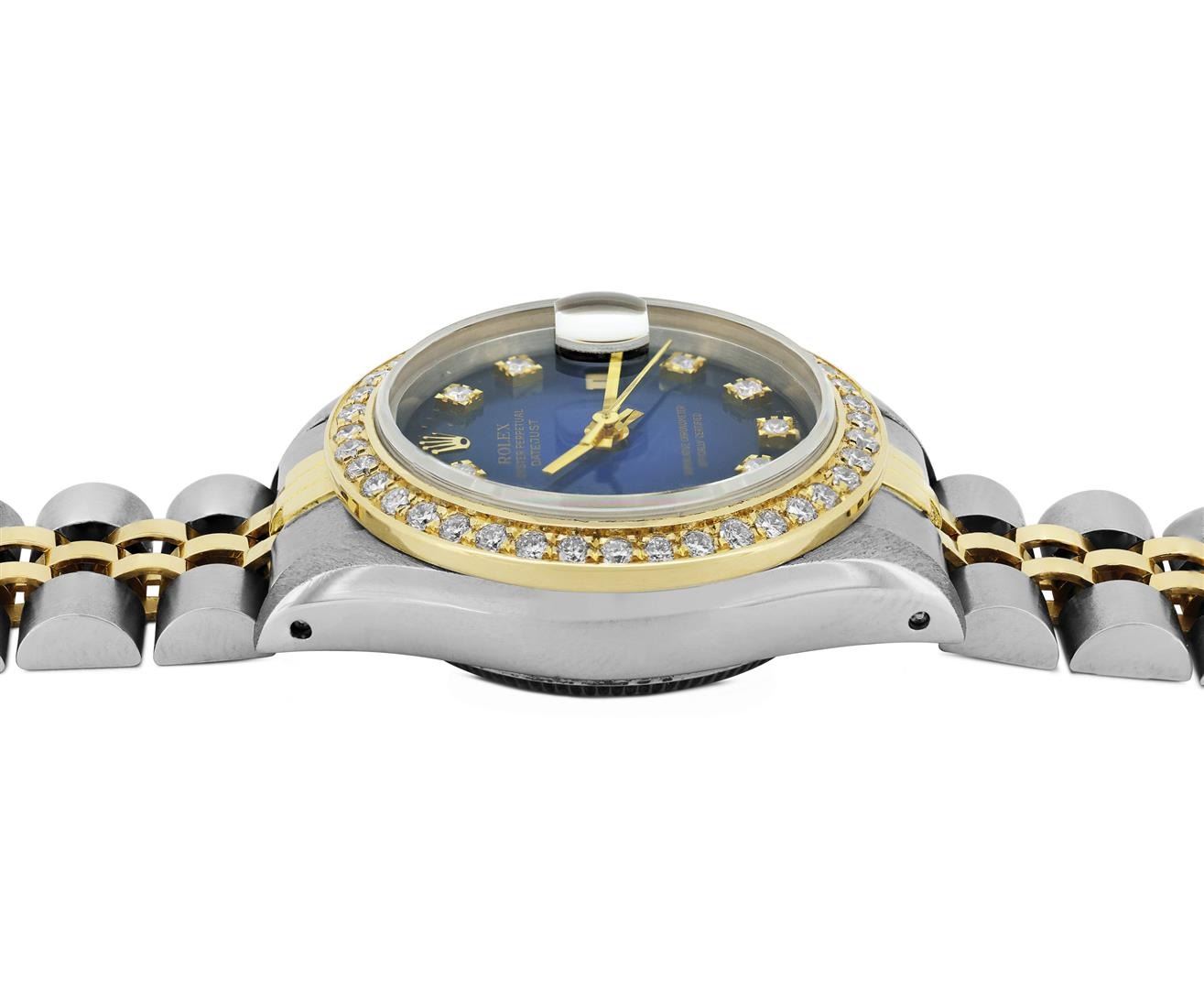 One Rolex Ladies Pre Owned Two Tone 18K Yellow Gold & Stainless Steel Rolex Datejust Polished, Serviced & Electronically Tested, Rolex Yellow Gold & Stainless Steel Case: 26mm, Rolex Yellow Gold Crown. Custom Bezel: New 18K Yellow Gold Beadset Diamond Bez