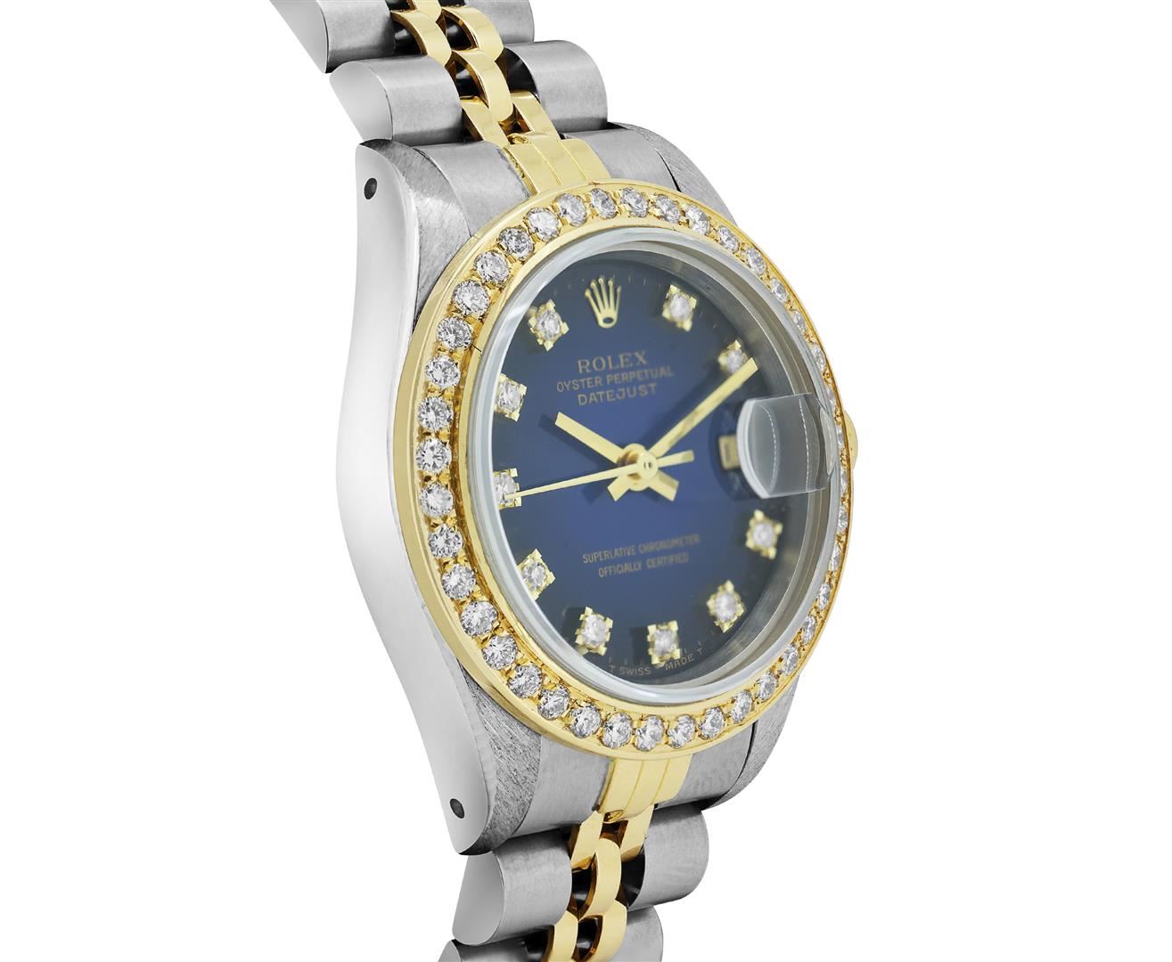 One Rolex Ladies Pre Owned Two Tone 18K Yellow Gold & Stainless Steel Rolex Datejust Polished, Serviced & Electronically Tested, Rolex Yellow Gold & Stainless Steel Case: 26mm, Rolex Yellow Gold Crown. Custom Bezel: New 18K Yellow Gold Beadset Diamond Bezel, Diamond Count: 32 Diamonds On Bezel. Crystal: Sapphire Crystal With Date Window. Custom Hands: New Solid Hands. Rolex Movement: 2135 Automatic Winding Movement. Custom Dial: Custom Blue Vignette Dial With Added Genuine VVS Diamond Hour Markers And Dash Track, Diamond Count: 10 Diamonds On Dial. Date Window: 3 O'Clock Position Date Display, Condition: G-6 Extra Fine. Rolex Bracelet: Two Tone 18K Yellow Gold & Stainless Steel Jubilee Band. Bright Polish & Satin Finish. 6.0 Inch Length, Adjustable. Standard Fold Clasp, With Rolex Logo. This Watch Has Been Serviced Time Tested And Is In Excellent Condition It Is Free Of All Scratches And Dents. This Watch Comes With A Rolex Box.