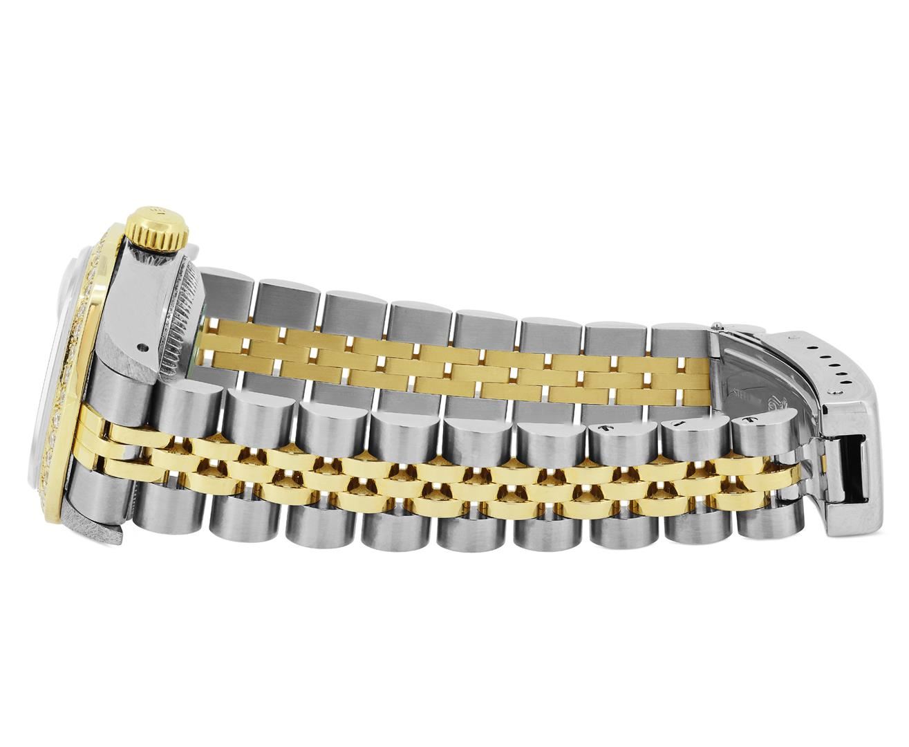 One Rolex Ladies Pre Owned Two Tone 18K Yellow Gold & Stainless Steel Rolex Datejust Polished, Serviced & Electronically Tested, Rolex Yellow Gold & Stainless Steel Case: 26mm, Rolex Yellow Gold Crown. Custom Bezel: New 18K Yellow Gold Beadset Diamond Bezel, Diamond Count: 32 Diamonds On Bezel. Crystal: Sapphire Crystal With Date Window. Custom Hands: New Solid Hands. Rolex Movement: 2135 Automatic Winding Movement. Custom Dial: Custom Blue Vignette Dial With Added Genuine VVS Diamond Hour Markers And Dash Track, Diamond Count: 10 Diamonds On Dial. Date Window: 3 O'Clock Position Date Display, Condition: G-6 Extra Fine. Rolex Bracelet: Two Tone 18K Yellow Gold & Stainless Steel Jubilee Band. Bright Polish & Satin Finish. 6.0 Inch Length, Adjustable. Standard Fold Clasp, With Rolex Logo. This Watch Has Been Serviced Time Tested And Is In Excellent Condition It Is Free Of All Scratches And Dents. This Watch Comes With A Rolex Box.