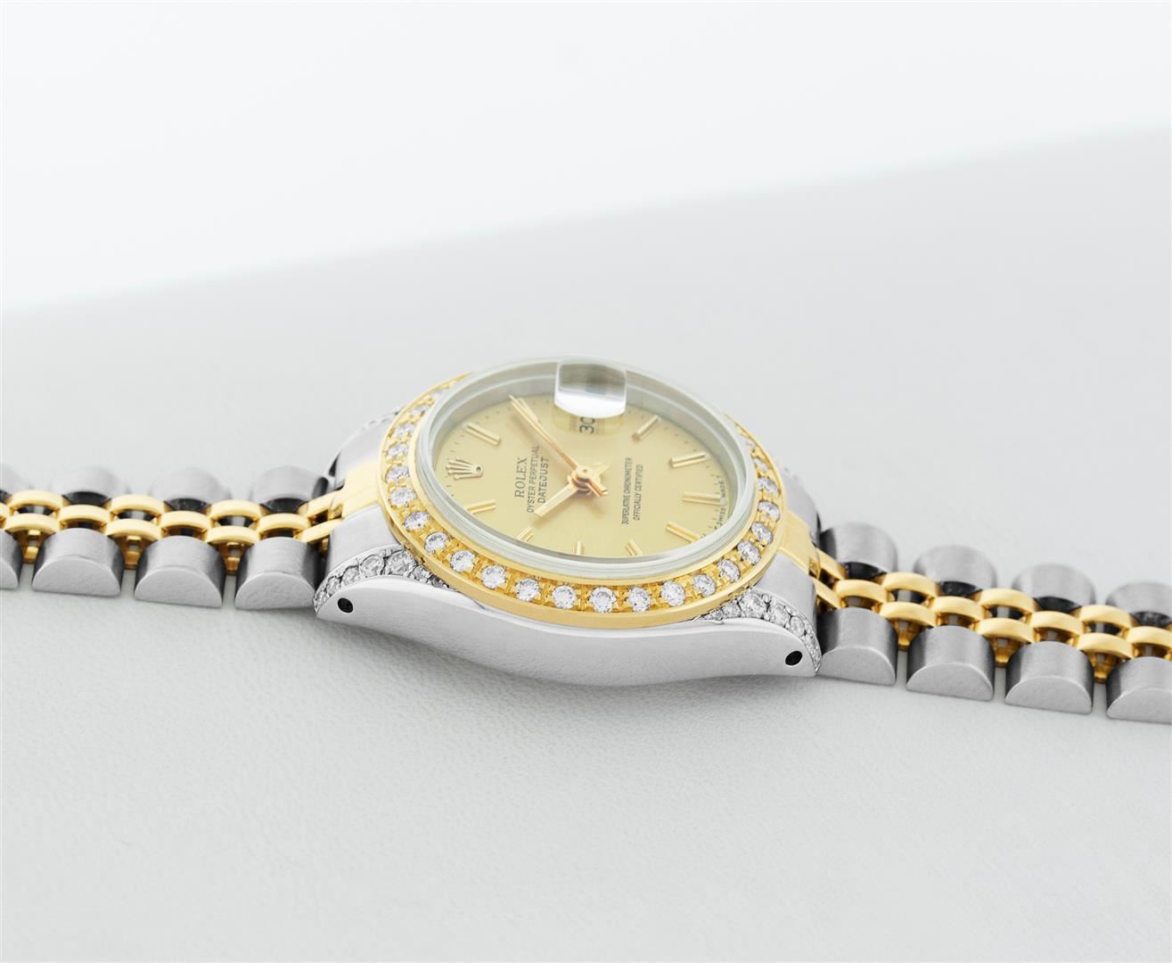 One Pre Owned Quickset Ladies Two Tone 18K Yellow Gold & Stainless Rolex Polished, Serviced & Electronically Tested, Rolex 18K Yellow Gold & Stainless Steel Case: 26mm, Custom Diamond Lugs: Added Diamonds On Lugs, Diamond Count: 24 Diamonds On Lugs. Rolex Yellow Gold Crown, Custom Bezel: New 18K Yellow Gold Diamond Bezel, Diamond Count: 32 Diamonds, Clarity: SI-VS, Color: G to H. Custom Crystal: New Sapphire With Magnified Date Window. Custom Hands: New Gold Hands. Rolex Movement: Automatic Quickset Winding Movement. Rolex Dial: Champagne Index With Lumi Dots And Dash Track. Date Window: 3 O'Clock Position Date Display, Model: Date, Condition: G-6 Extra Fine. Rolex Bracelet: Two Tone 18K Yellow Gold & Stainless Steel Jubilee Band. Bright Polish. 6.0 Inch Length, Adjustable. Standard Clasp, With Rolex Logo. This Watch Has Been Serviced Time Tested And Is In Excellent Condition It Is Free Of All Scratches And Dents.