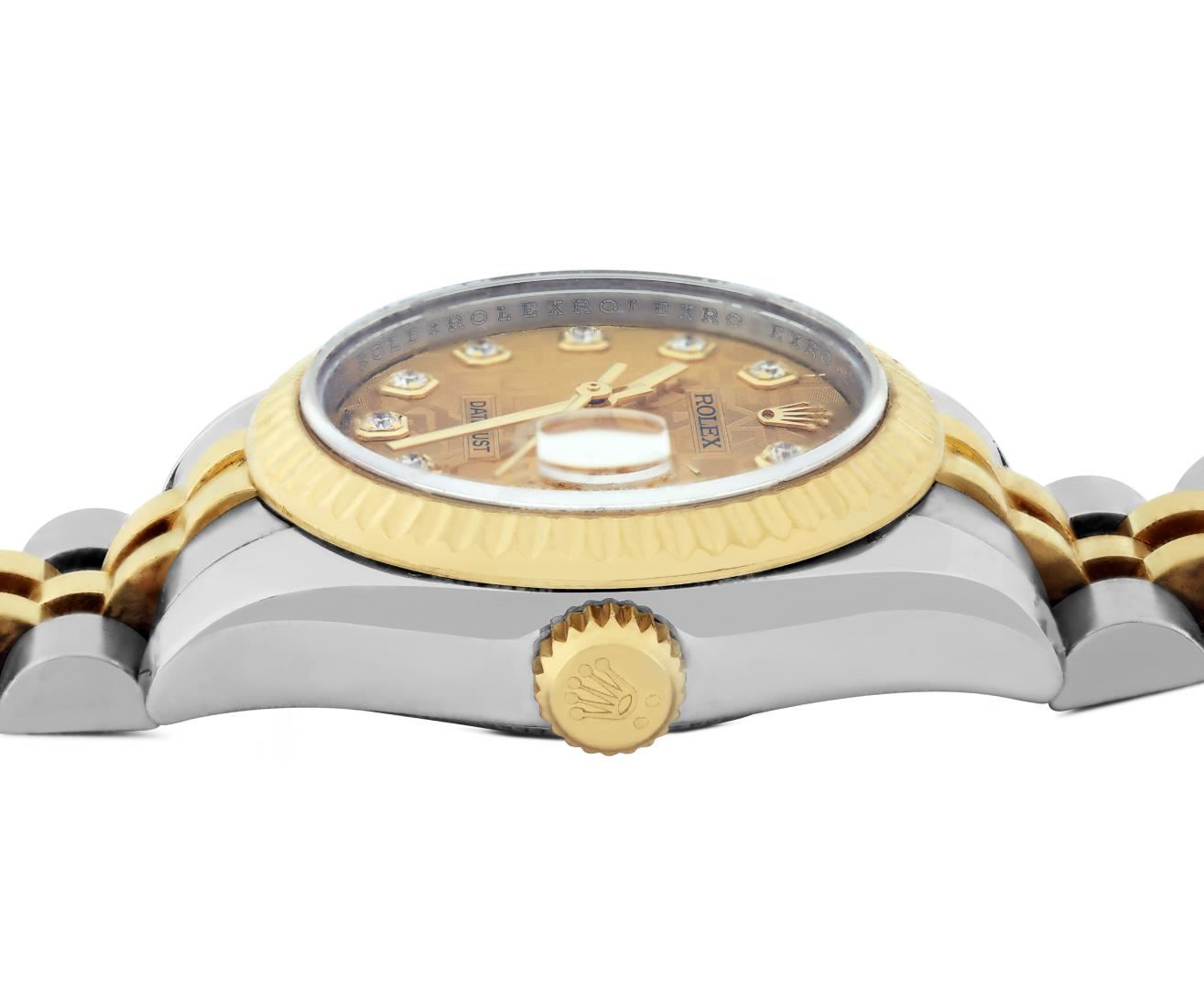 One Rolex Ladies Pre Owned Two Tone 18K Yellow Gold And Stainless Steel Rolex Datejust Polished, Serviced And Electronically Tested, Rolex Yellow Gold And Stainless Steel Case: 26mm, Rolex Yellow Gold Crown. Rolex Bezel: 18K Yellow Gold Fluted Bezel, Diamond Count: 32 Diamonds On Bezel. Crystal: Sapphire Crystal With Date Window. Hands: Solid Hands. Rolex Movement: 2235 Automatic Winding Movement. Rolex Factory Dial: Factory Champagne Jubilee Diamond Dial. Date Window: 3 O'Clock Position Date Display, Condition: G-6 Extra Fine. Rolex Bracelet: Two Tone 18K Yellow Gold And Stainless Steel Jubilee Band With Hidden Clasp. Bright Polish And Satin Finish. 6.0 Inch Length, Adjustable. Hidden Clasp, With Rolex Logo. This Watch Has Been Serviced Time Tested And Is In Excellent Condition It Is Free Of All Scratches And Dents. This Watch Comes With A Rolex Box.