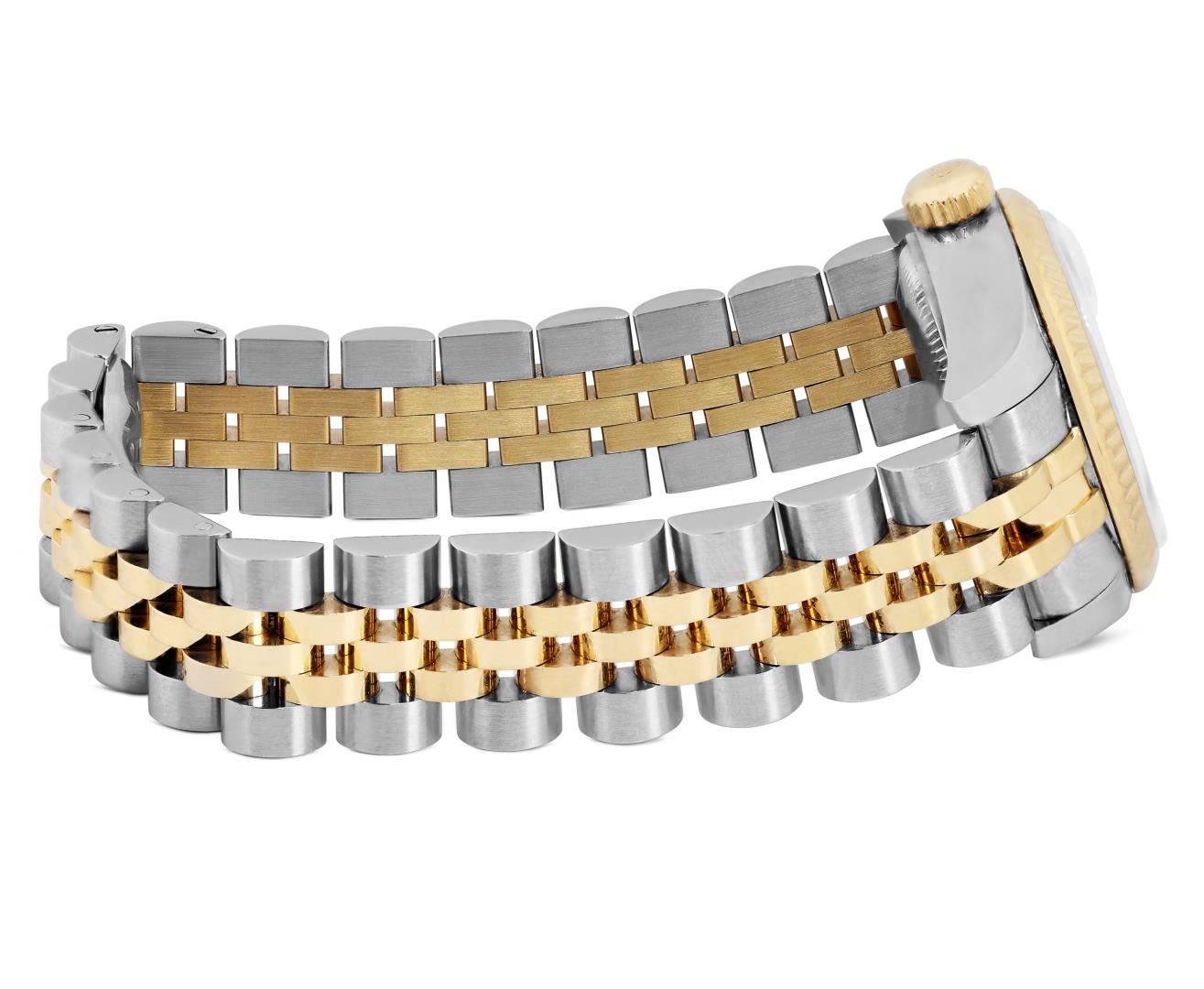One Rolex Ladies Pre Owned Two Tone 18K Yellow Gold And Stainless Steel Rolex Datejust Polished, Serviced And Electronically Tested, Rolex Yellow Gold And Stainless Steel Case: 26mm, Rolex Yellow Gold Crown. Rolex Bezel: 18K Yellow Gold Fluted Bezel, Diamond Count: 32 Diamonds On Bezel. Crystal: Sapphire Crystal With Date Window. Hands: Solid Hands. Rolex Movement: 2235 Automatic Winding Movement. Rolex Factory Dial: Factory Champagne Jubilee Diamond Dial. Date Window: 3 O'Clock Position Date Display, Condition: G-6 Extra Fine. Rolex Bracelet: Two Tone 18K Yellow Gold And Stainless Steel Jubilee Band With Hidden Clasp. Bright Polish And Satin Finish. 6.0 Inch Length, Adjustable. Hidden Clasp, With Rolex Logo. This Watch Has Been Serviced Time Tested And Is In Excellent Condition It Is Free Of All Scratches And Dents. This Watch Comes With A Rolex Box.