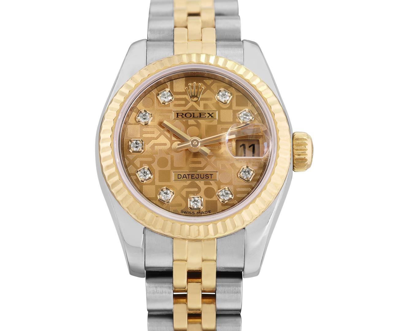 One Rolex Ladies Pre Owned Two Tone 18K Yellow Gold And Stainless Steel Rolex Datejust Polished, Serviced And Electronically Tested, Rolex Yellow Gold And Stainless Steel Case: 26mm, Rolex Yellow Gold Crown. Rolex Bezel: 18K Yellow Gold Fluted Bezel, Diamond Count: 32 Diamonds On Bezel. Crystal: Sapphire Crystal With Date Window. Hands: Solid Hands. Rolex Movement: 2235 Automatic Winding Movement. Rolex Factory Dial: Factory Champagne Jubilee Diamond Dial. Date Window: 3 O'Clock Position Date Display, Condition: G-6 Extra Fine. Rolex Bracelet: Two Tone 18K Yellow Gold And Stainless Steel Jubilee Band With Hidden Clasp. Bright Polish And Satin Finish. 6.0 Inch Length, Adjustable. Hidden Clasp, With Rolex Logo. This Watch Has Been Serviced Time Tested And Is In Excellent Condition It Is Free Of All Scratches And Dents. This Watch Comes With A Rolex Box.