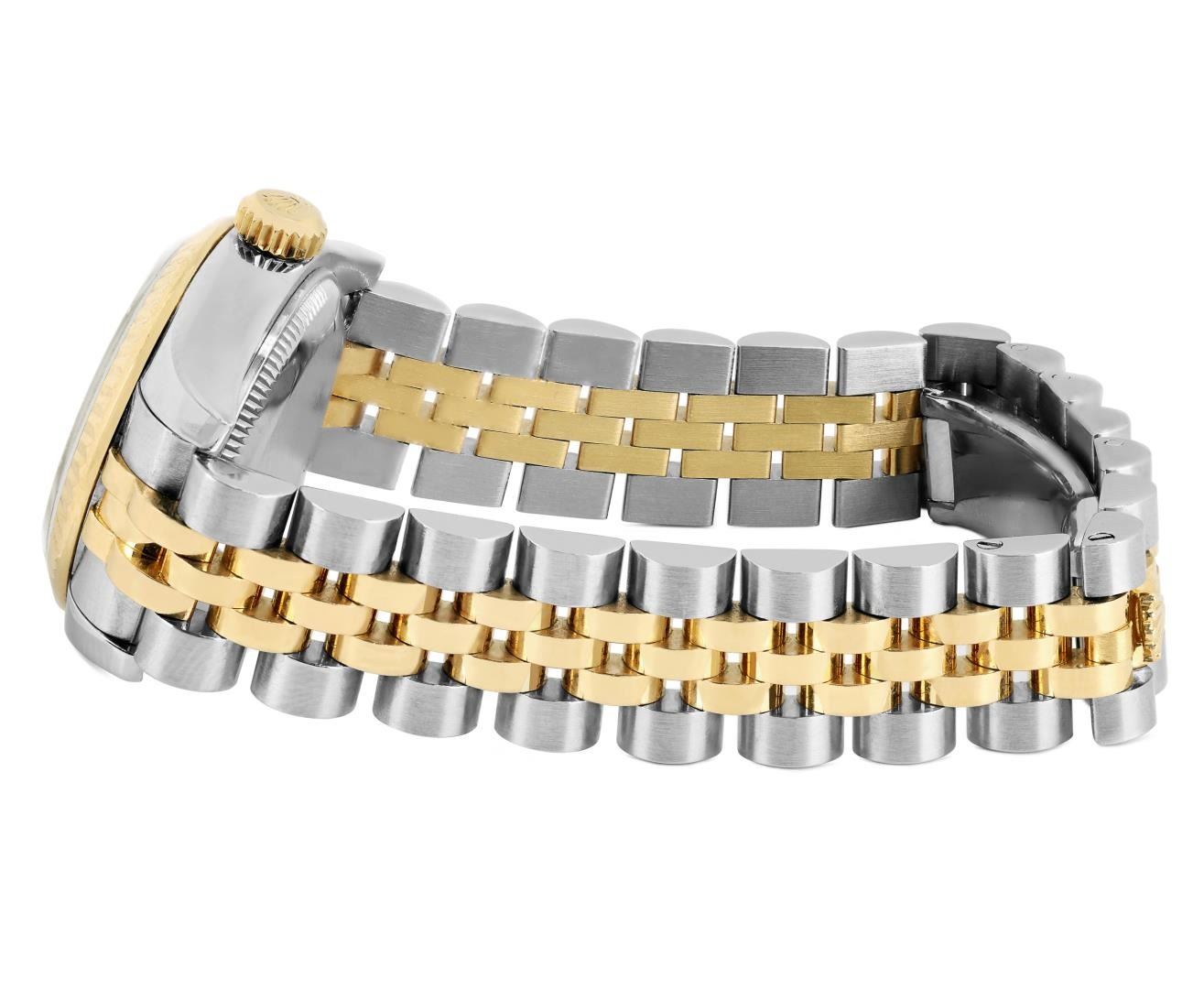One Rolex Ladies Pre Owned Two Tone 18K Yellow Gold And Stainless Steel Rolex Datejust Polished, Serviced And Electronically Tested, Rolex Yellow Gold And Stainless Steel Case: 26mm, Rolex Yellow Gold Crown. Rolex Bezel: 18K Yellow Gold Fluted Bezel, Diamond Count: 32 Diamonds On Bezel. Crystal: Sapphire Crystal With Date Window. Hands: Solid Hands. Rolex Movement: 2235 Automatic Winding Movement. Rolex Factory Dial: Factory Champagne Jubilee Diamond Dial. Date Window: 3 O'Clock Position Date Display, Condition: G-6 Extra Fine. Rolex Bracelet: Two Tone 18K Yellow Gold And Stainless Steel Jubilee Band With Hidden Clasp. Bright Polish And Satin Finish. 6.0 Inch Length, Adjustable. Hidden Clasp, With Rolex Logo. This Watch Has Been Serviced Time Tested And Is In Excellent Condition It Is Free Of All Scratches And Dents. This Watch Comes With A Rolex Box.