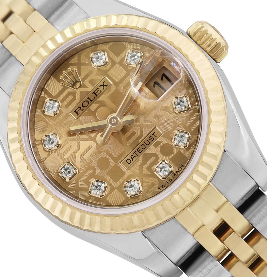 One Rolex Ladies Pre Owned Two Tone 18K Yellow Gold And Stainless Steel Rolex Datejust Polished, Serviced And Electronically Tested, Rolex Yellow Gold And Stainless Steel Case: 26mm, Rolex Yellow Gold Crown. Rolex Bezel: 18K Yellow Gold Fluted Bezel, Diamond Count: 32 Diamonds On Bezel. Crystal: Sapphire Crystal With Date Window. Hands: Solid Hands. Rolex Movement: 2235 Automatic Winding Movement. Rolex Factory Dial: Factory Champagne Jubilee Diamond Dial. Date Window: 3 O'Clock Position Date Display, Condition: G-6 Extra Fine. Rolex Bracelet: Two Tone 18K Yellow Gold And Stainless Steel Jubilee Band With Hidden Clasp. Bright Polish And Satin Finish. 6.0 Inch Length, Adjustable. Hidden Clasp, With Rolex Logo. This Watch Has Been Serviced Time Tested And Is In Excellent Condition It Is Free Of All Scratches And Dents. This Watch Comes With A Rolex Box.
