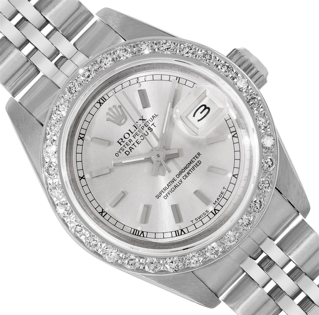 One Rolex Ladies Pre Owned Stainless Steel Datejust Wristwatch Polished Bright with Satin Finish, Serviced & Electronically Tested, Stainless Steel Case: 26mm, Stainless Steel Crown, Custom Bezel: New 18K White Gold Beadset Diamond Bezel, Diamond Count: 32 Diamonds, Total Weight .70 Carat, Clarity: SI-VS, Color: G to H. Custom Crystal: New Sapphire With Magnified Date Window. Custom Hands: New Luminescent Hands. Rolex Movement: 2135 Automatic Winding Movement. Rolex Dial: Factory Silver Dial With Index Hour Markers, Square Roman Track, And Lumi Dots. Date Window: 3 O'Clock Position Date Display, Model: Datejust. Condition: G-6 Extra Fine. Rolex Bracelet: Stainless Steel Jubilee Band. Bright Polish & Satin Finish. 6.0 Inch Length, Adjustable. Standard Clasp, With Rolex Logo. This Watch Has Been Serviced And Time Tested. It Is In Excellent Condition, Free Of All Scratches And Dents. This Watch Comes With A Rolex Box.