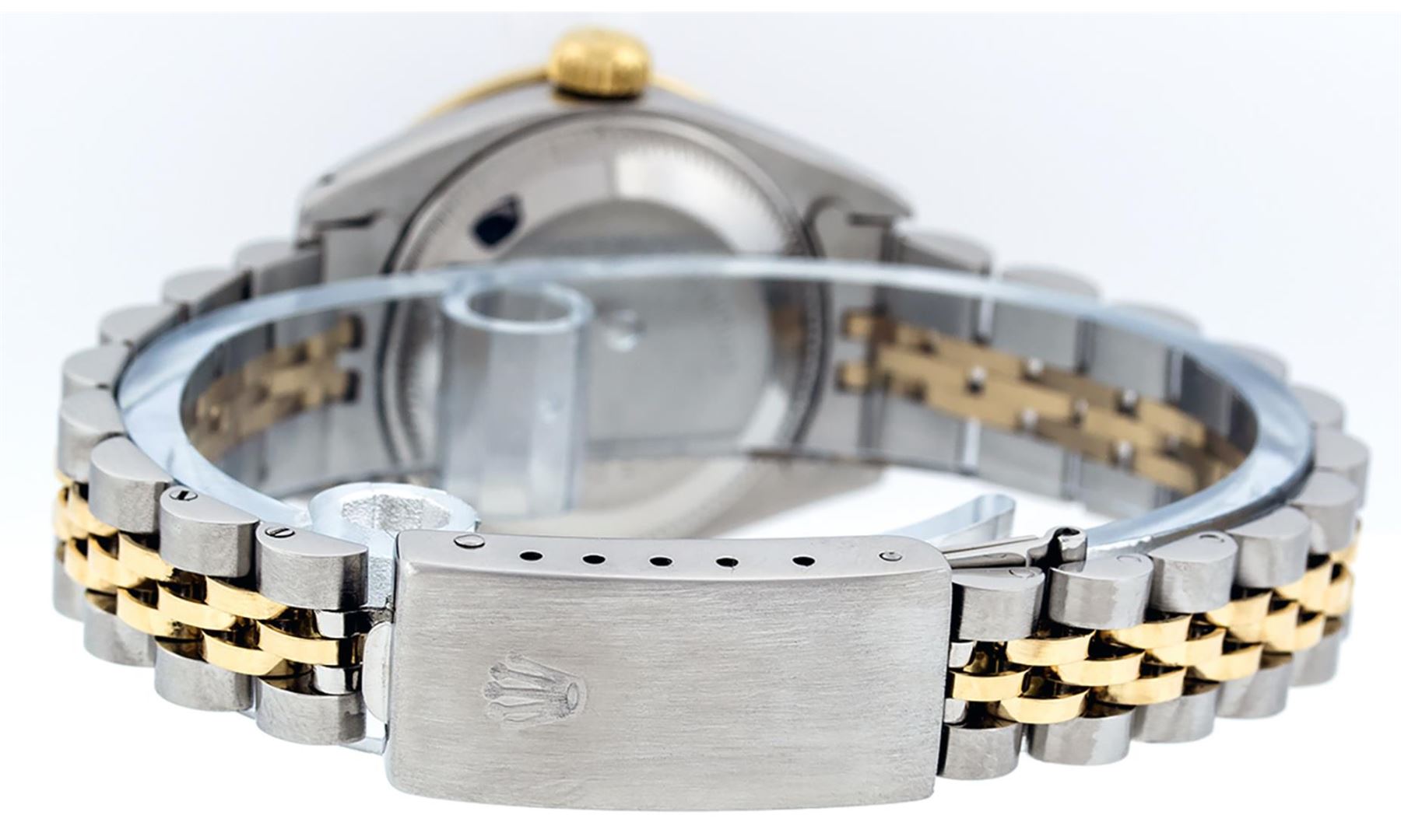 One Ladies Pre Owned Quickset Two Tone 18K Yellow Gold And Stainless Steel Rolex Datejust Polished, Serviced And Electronically Tested, Yellow Gold And Stainless Steel Case: 26mm, Yellow Gold Crown, Custom Bezel: New 18K Yellow Gold Emerald Beadset Diamond Bezel, Diamond + Gem Count: 28 Diamonds + 4 Emeralds. Custom Crystal: New Sapphire With Date Window. Custom Hands: New Luminescent Hands. Rolex Movement: Automatic Winding Movement 2135. Custom Dial: Custom Green Vignette Dial With Added Diamond Hour Markers, Diamond Count: 10 Diamond in Dial. Date Window: 3 O'Clock Position Date Display, Model: Quickset Datejust, Condition: G-6 Extra Fine. Rolex Bracelet: Two Tone Yellow Gold And Stainless Steel Jubilee Band. Bright Polish. 6.0 Inch Length, Adjustable. Standard Clasp, With Rolex Logo. This Watch Has Been Serviced Time Tested And Is In Excellent Condition It Is Free Of All Scratches And Dents.