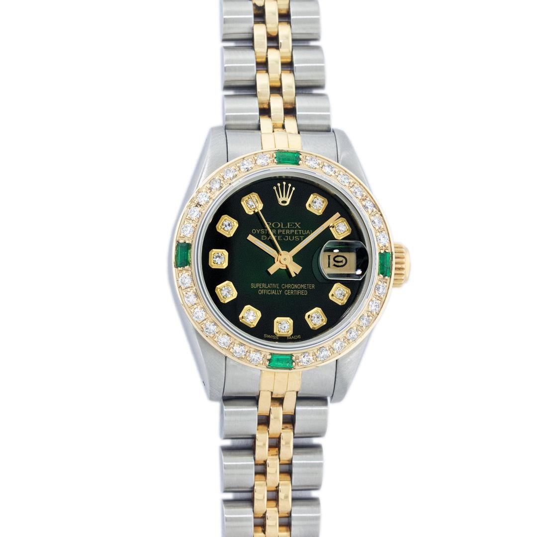 One Ladies Pre Owned Quickset Two Tone 18K Yellow Gold And Stainless Steel Rolex Datejust Polished, Serviced And Electronically Tested, Yellow Gold And Stainless Steel Case: 26mm, Yellow Gold Crown, Custom Bezel: New 18K Yellow Gold Emerald Beadset Diamond Bezel, Diamond + Gem Count: 28 Diamonds + 4 Emeralds. Custom Crystal: New Sapphire With Date Window. Custom Hands: New Luminescent Hands. Rolex Movement: Automatic Winding Movement 2135. Custom Dial: Custom Green Vignette Dial With Added Diamond Hour Markers, Diamond Count: 10 Diamond in Dial. Date Window: 3 O'Clock Position Date Display, Model: Quickset Datejust, Condition: G-6 Extra Fine. Rolex Bracelet: Two Tone Yellow Gold And Stainless Steel Jubilee Band. Bright Polish. 6.0 Inch Length, Adjustable. Standard Clasp, With Rolex Logo. This Watch Has Been Serviced Time Tested And Is In Excellent Condition It Is Free Of All Scratches And Dents.