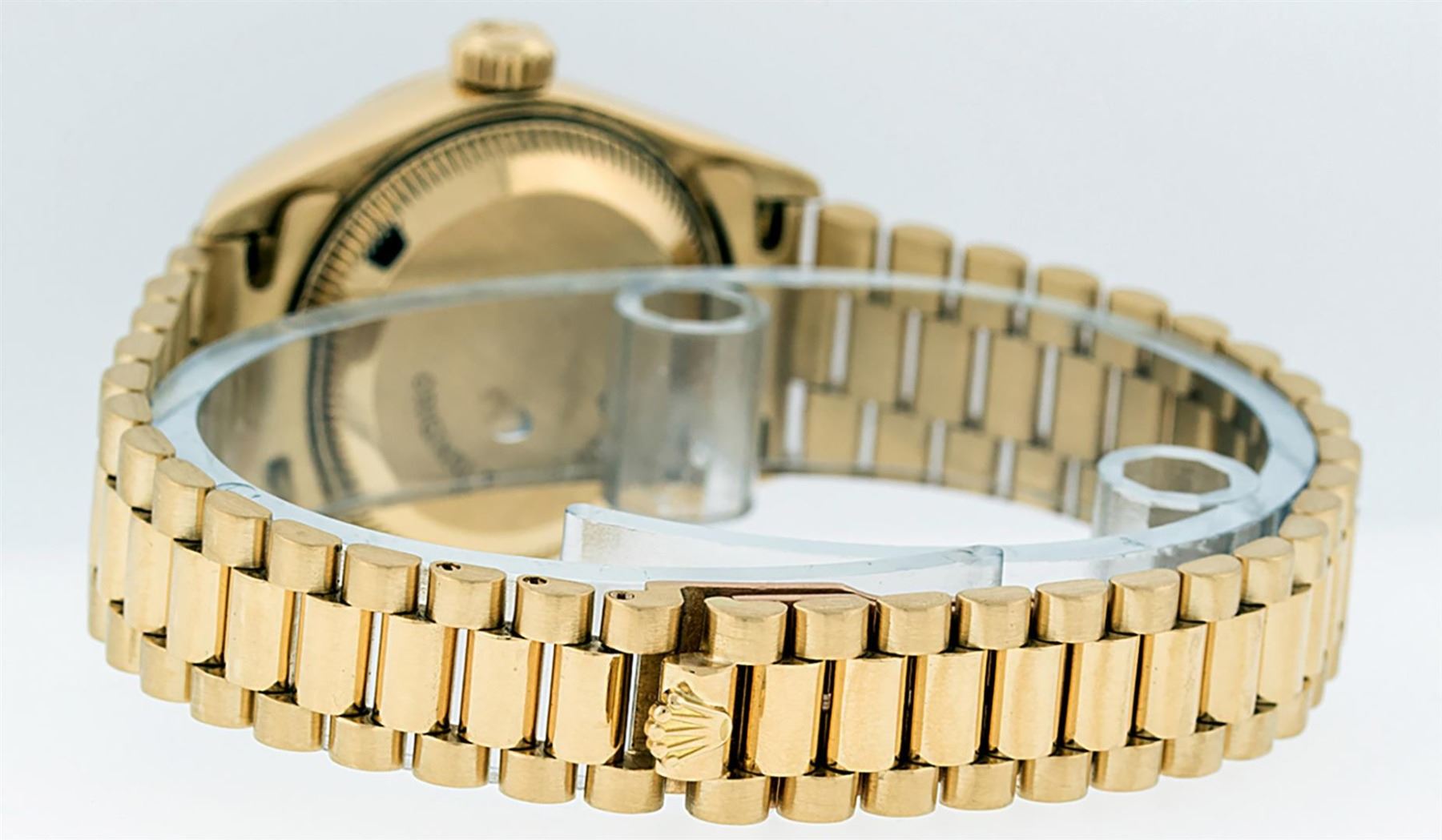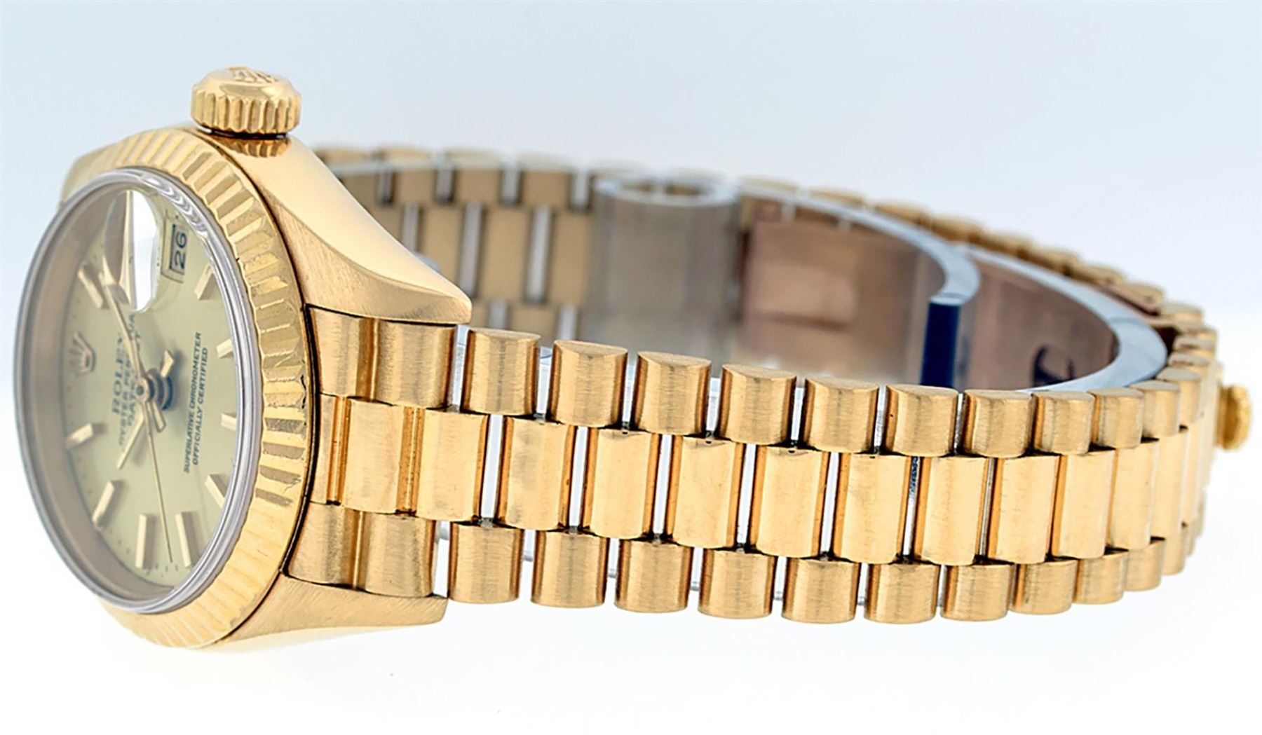 One Ladies Pre Owned Quickset Rolex 18K Yellow Gold President Polished, Serviced & Electronically Tested, Rolex 18K Yellow Gold Case: 26mm, Rolex 18K Yellow Gold Crown, Rolex Bezel: 18K Yellow Gold Fluted Bezel. Rolex Crystal: Sapphire With Cyclops Lens. Rolex Hands: Luminescent Hands. Rolex Movement: Automatic Winding Quickset Movement 2130. Rolex Dial: Champagne Index Dial With Dash Track & Lumi Dots. Date Window: 3 O'Clock Position, Model: President. Condition: G-6 Extra Fine. Rolex Bracelet: 18K Yellow Gold President Band, Bright & Satin Polish. 6.0 Inch Length, Standard President Clasp (Hidden Clasp), With Rolex Logo. The Watch Is In Very Good Condition Free Of All Scratches And Dents.