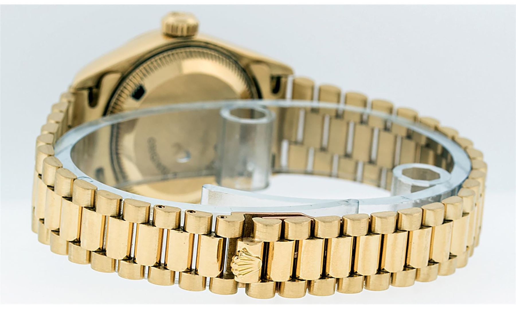 One Ladies Pre Owned Quickset Rolex 18K Yellow Gold President Polished, Serviced & Electronically Tested, Rolex 18K Yellow Gold Case: 26mm, Rolex 18K Yellow Gold Crown, Rolex Bezel: 18K Yellow Gold Fluted Bezel. Rolex Crystal: Sapphire With Cyclops Lens. Rolex Hands: Luminescent Hands. Rolex Movement: Automatic Winding Quickset Movement 2130. Rolex Dial: Champagne Index Dial With Dash Track & Lumi Dots. Date Window: 3 O'Clock Position, Model: President. Condition: G-6 Extra Fine. Rolex Bracelet: 18K Yellow Gold President Band, Bright & Satin Polish. 6.0 Inch Length, Standard President Clasp (Hidden Clasp), With Rolex Logo. The Watch Is In Very Good Condition Free Of All Scratches And Dents.
