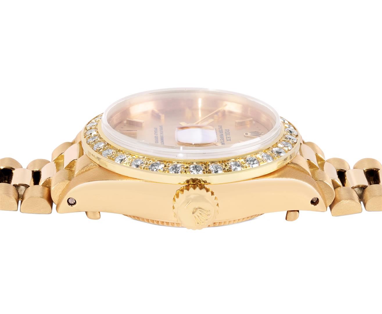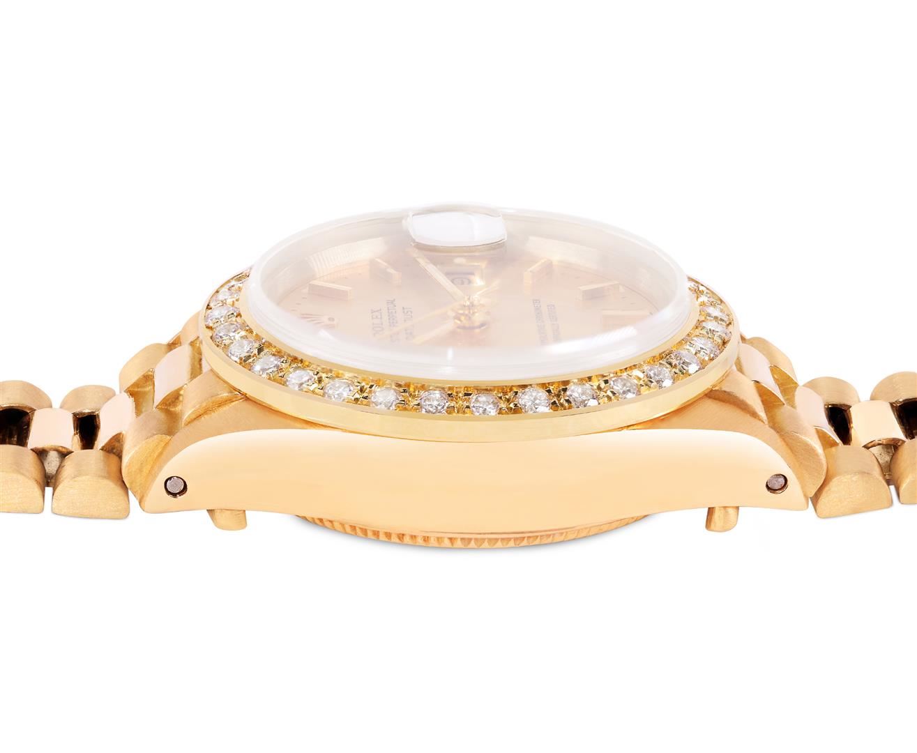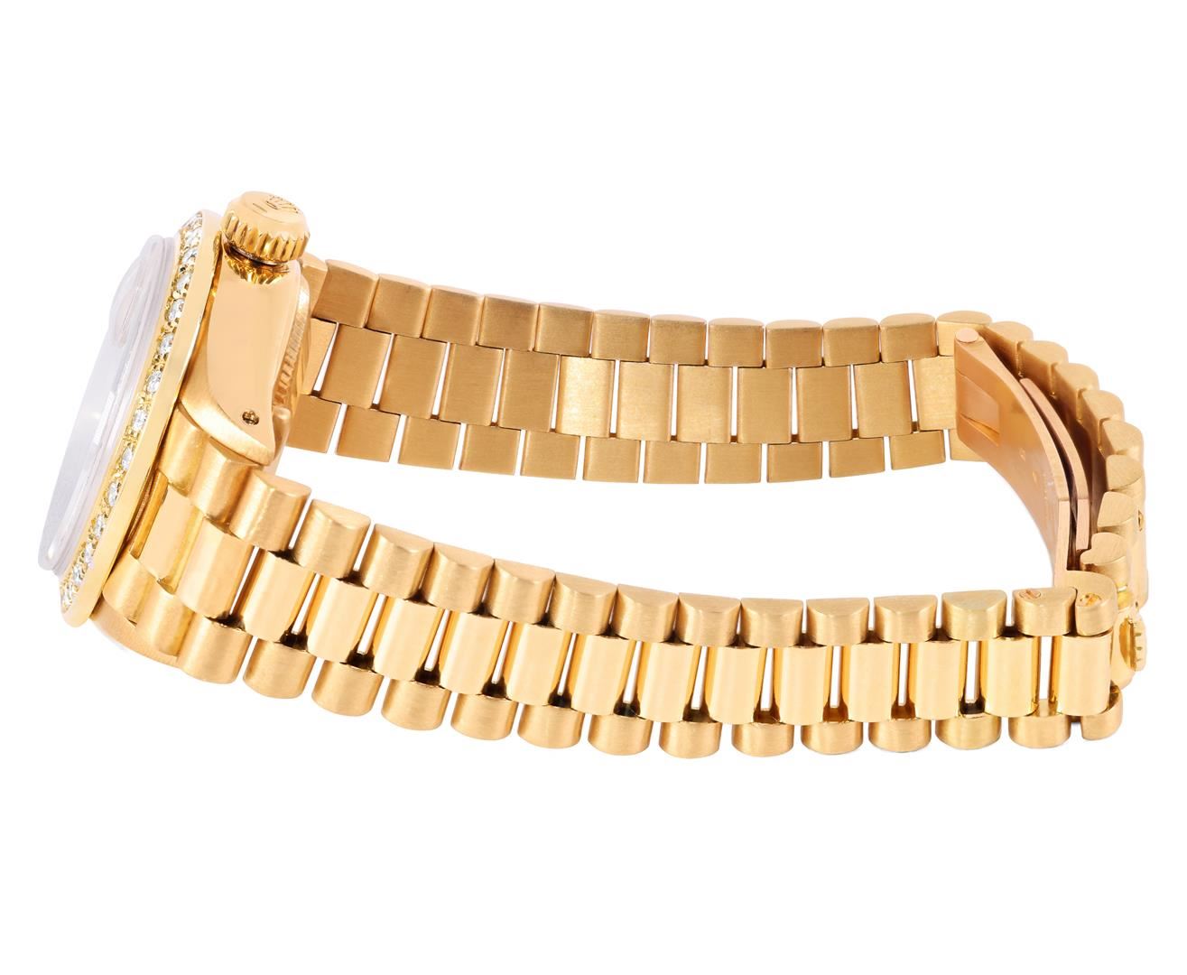One Ladies Pre Owned Quickset Rolex 18K Yellow Gold President Polished, Serviced & Electronically Tested, Rolex 18K Yellow Gold Case: 26mm, Rolex 18K Yellow Gold Crown, Custom Bezel: New Beadset Diamond Bezel, Diamond Count: 32 Diamonds On Bezel. Custom Crystal: New Sapphire With Cyclops Lens. Custom Hands: New Luminescent Hands. Rolex Movement: Rolex Automatic Movement Self-Winding 2135. Rolex Dial: Factory Rolex Champagne Index Dial. Model: Quickset Datejust President. Condition: G-6 Extra Fine, Rolex Bracelet: 18K Yellow Gold President Band, Bright & Satin Polish. 6.0 Inch Length, President Hidden Clasp, With Rolex Logo. This Watch Has Been Serviced Time Tested And Is In Excellent Condition It Is Free Of All Scratches And Dents. This Watch Comes With A Rolex Box.