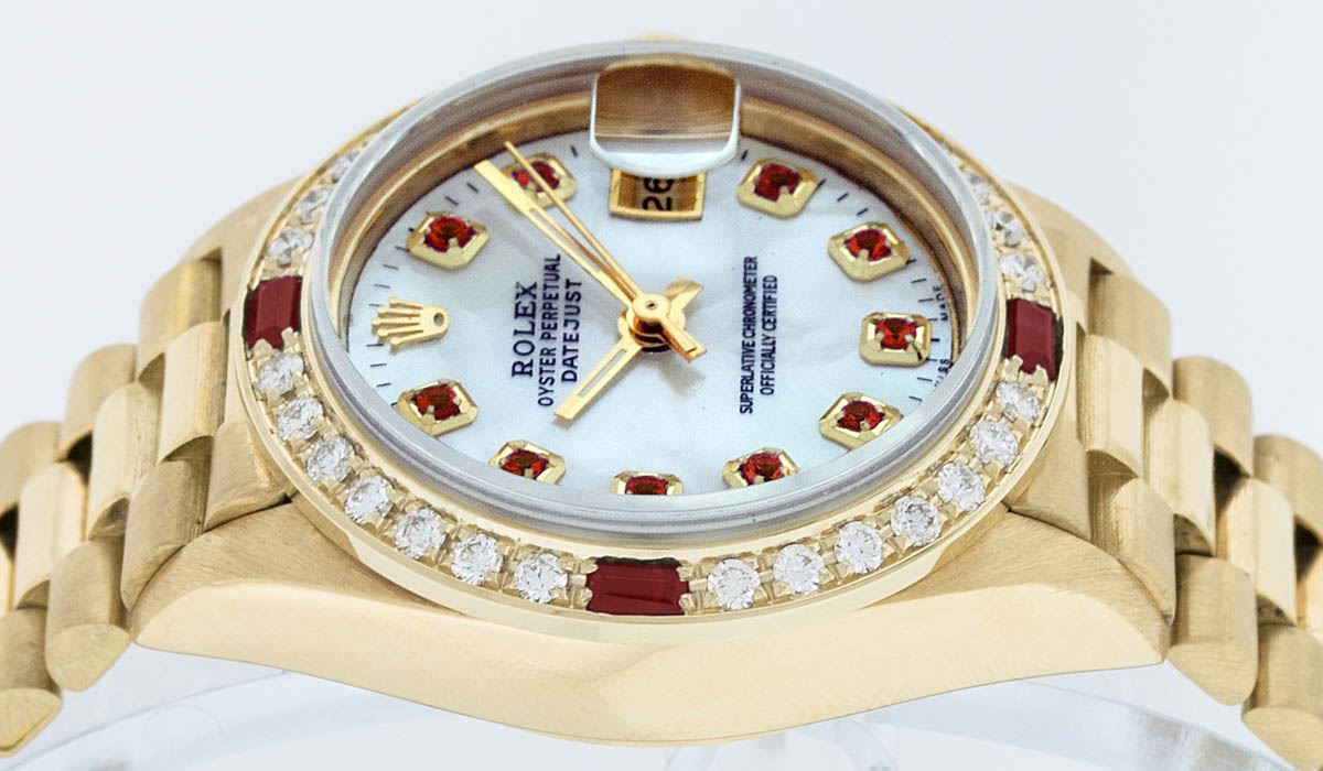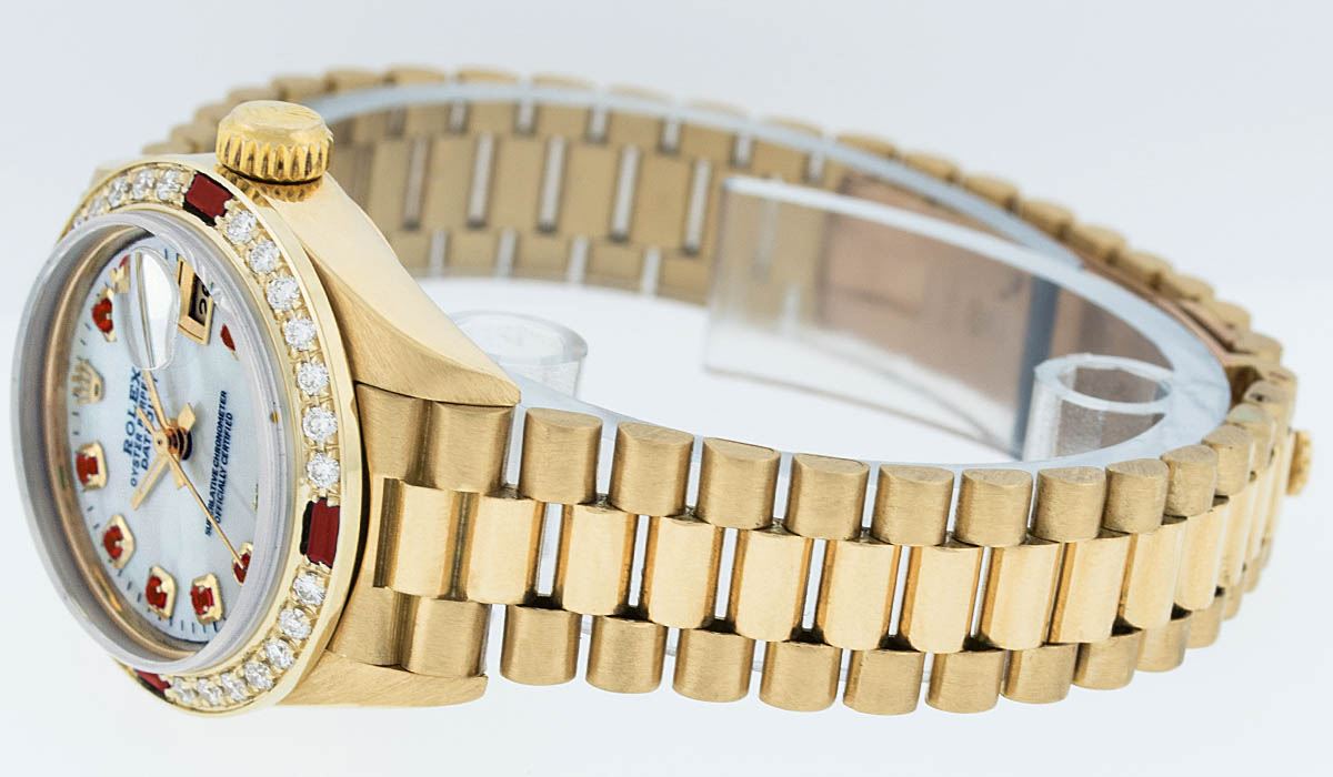 One Ladies 18K Yellow Gold Rolex President Polished, Serviced & Electronically Tested, Yellow Gold Case: 26mm, 18K Yellow Gold Crown, Custom Bezel: 18K Yellow Gold Beadset Diamond Bezel, Diamond Count: 32 Diamonds. Total Weight .70 Carat, Clarity: SI-VS, Color: G to H. Custom Crystal: Synthetic Sapphire Cyclops Lens. Movement: Automatic Winding Movement Caliber 2135. Custom Dial: Mother Of Pearl With Ruby Hour Markers, Stone Count: 10 Rubies In Dial. Date Window: 3 O'Clock Position, Model: Datejust President 69178, Quickset, Condition: G-6 Extra Fine. Bracelet: 18K Yellow Gold President With Hidden Clasp, Bright & Satin Polish. 6.0 Inch Length, Standard President Clasp (Hidden Clasp), With Rolex Logo. Watch Has Been Serviced And Polished It Is Free Of All Scratches And Dents.