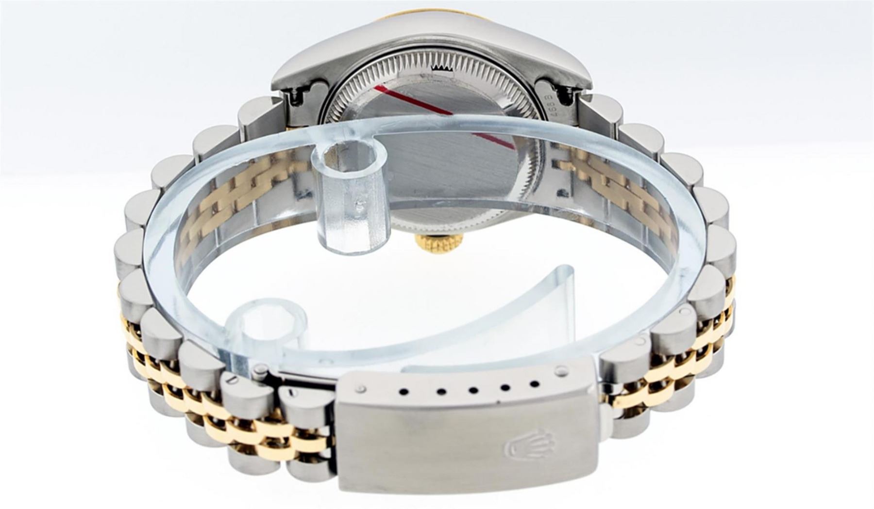 One Ladies 18K Two Tone Rolex Datejust Polished, Serviced & Electronically Tested, 18K Yellow Gold & Stainless Steel, Case Size: 26mm, 18K Yellow Gold Crown, Bezel: 18K Yellow Gold Fluted Bezel. Custom Crystal: New Acrylic Cyclops Lens. Custom Hands: New Luminescent Hands. Movement: Automatic Winding Movement Caliber 2235. Custom Dial: Mother Of Pearl Roman Dial With Square Track. Date Window: 3 O'Clock Position Date Display, Model: Datejust. Condition: G-6 Extra Fine. Bracelet: Two Tone 18K Yellow Gold & Stainless Steel Jubilee Band. Bright Polish. 6.0 Inch Length, Adjustable. Standard Clasp, With Rolex Logo. This Watch Has Been Serviced Time Tested And Is In Excellent Condition It Is Free Of All Scratches And Dents.