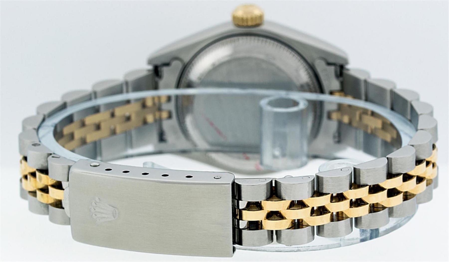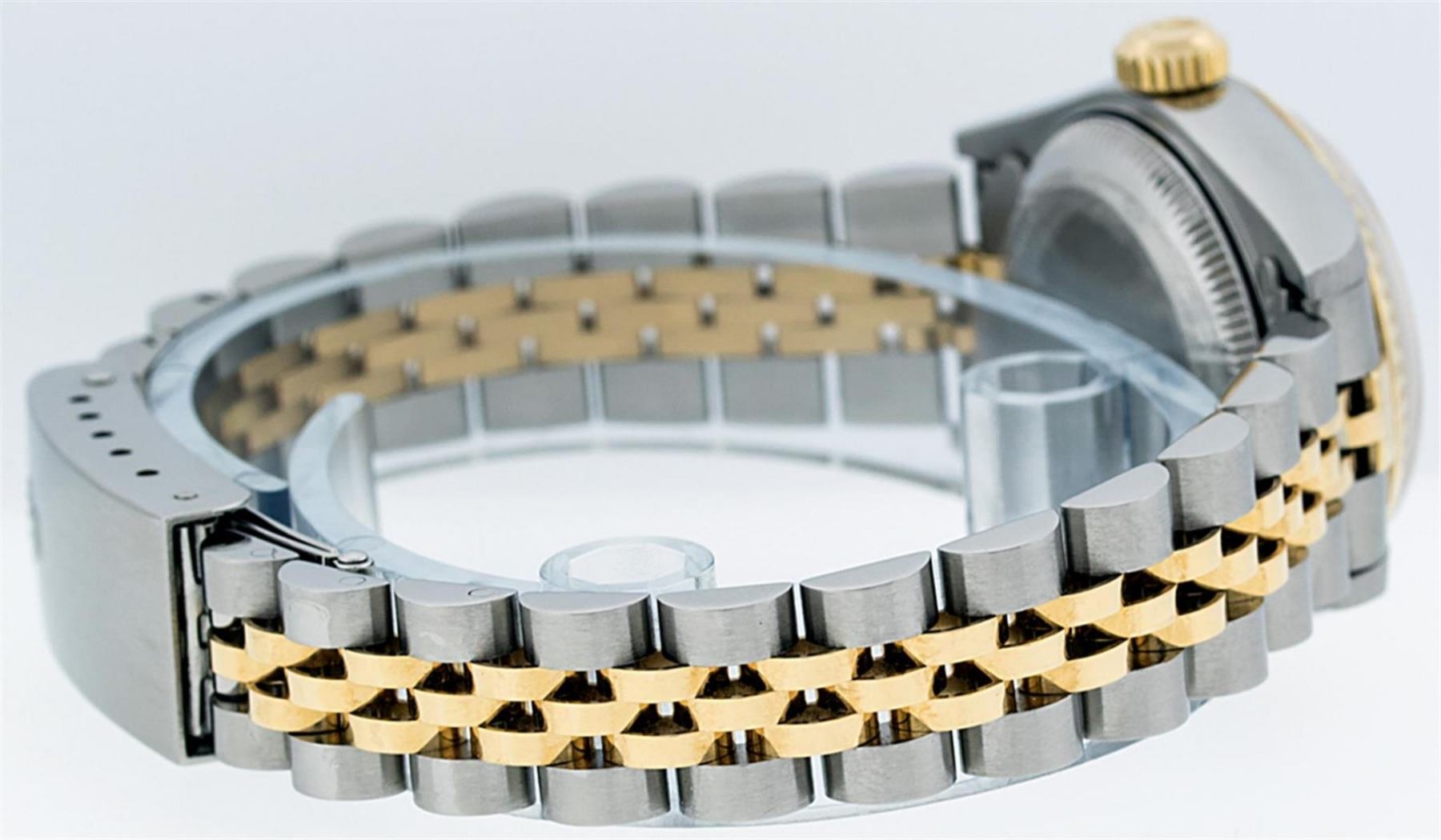 One Ladies 18K Two Tone Rolex Datejust Polished, Serviced & Electronically Tested, 18K Yellow Gold & Stainless Steel, Case Size: 26mm, 18K Yellow Gold Crown, Bezel: 18K Yellow Gold Fluted Bezel. Custom Crystal: New Acrylic Cyclops Lens. Custom Hands: New Luminescent Hands. Movement: Automatic Winding Movement Caliber 2235. Custom Dial: Mother Of Pearl Single Cut Diamond Dial, Diamond Count: 10 Diamonds In Dial, Color: G To H, Clarity VS2. Date Window: 3 O'Clock Position Date Display, Model: Datejust. Condition: G-6 Extra Fine. Bracelet: Two Tone 18K Yellow Gold & Stainless Steel Jubilee. Bright Polish. 6.0 Inch Length, Adjustable. Standard Clasp, With Rolex Logo. This Watch Has Been Serviced Time Tested And Is In Excellent Condition It Is Free Of All Scratches And Dents.