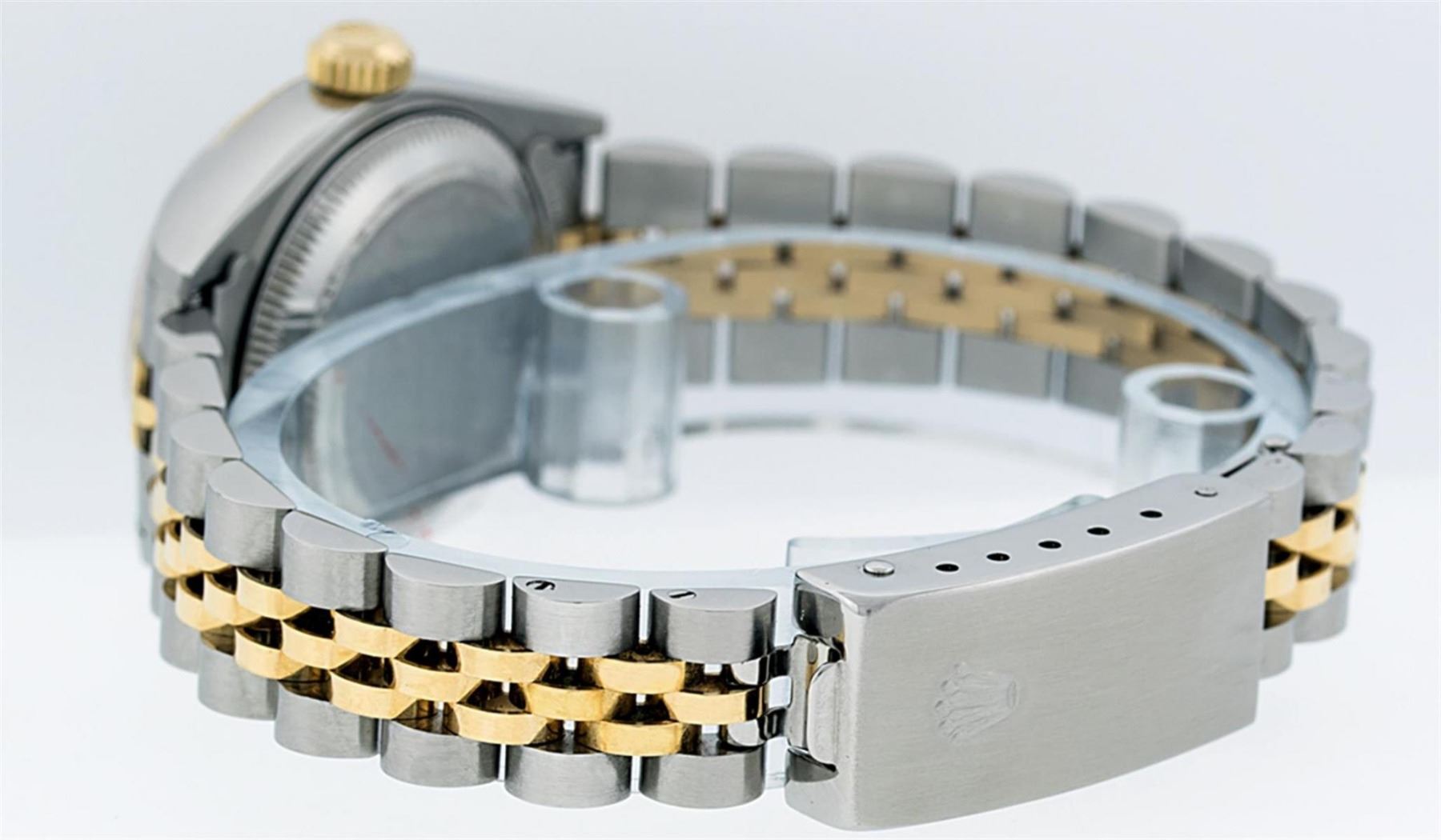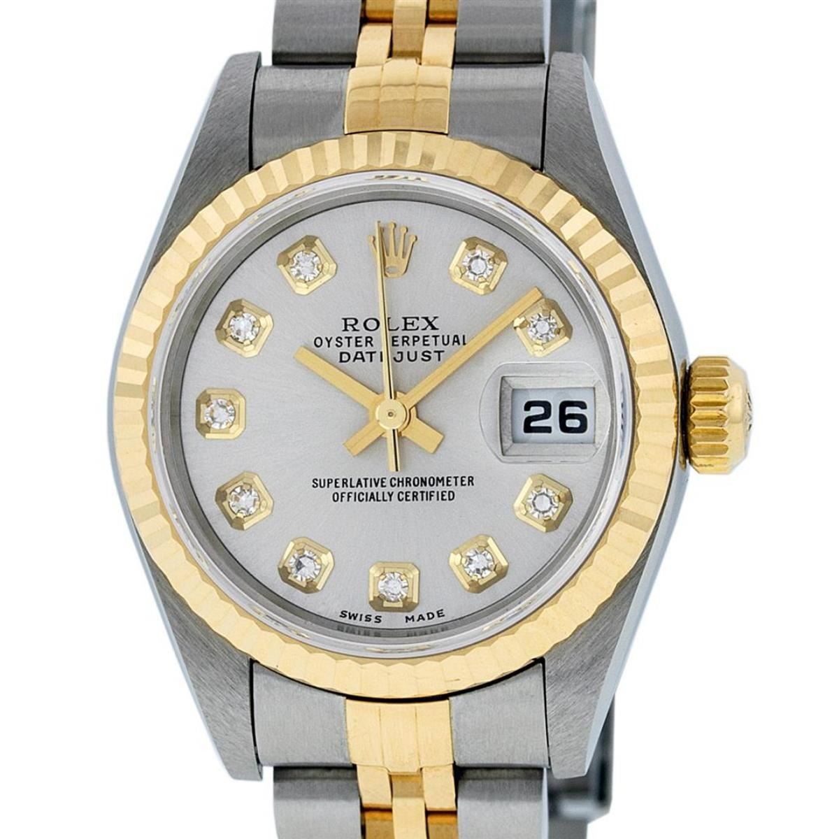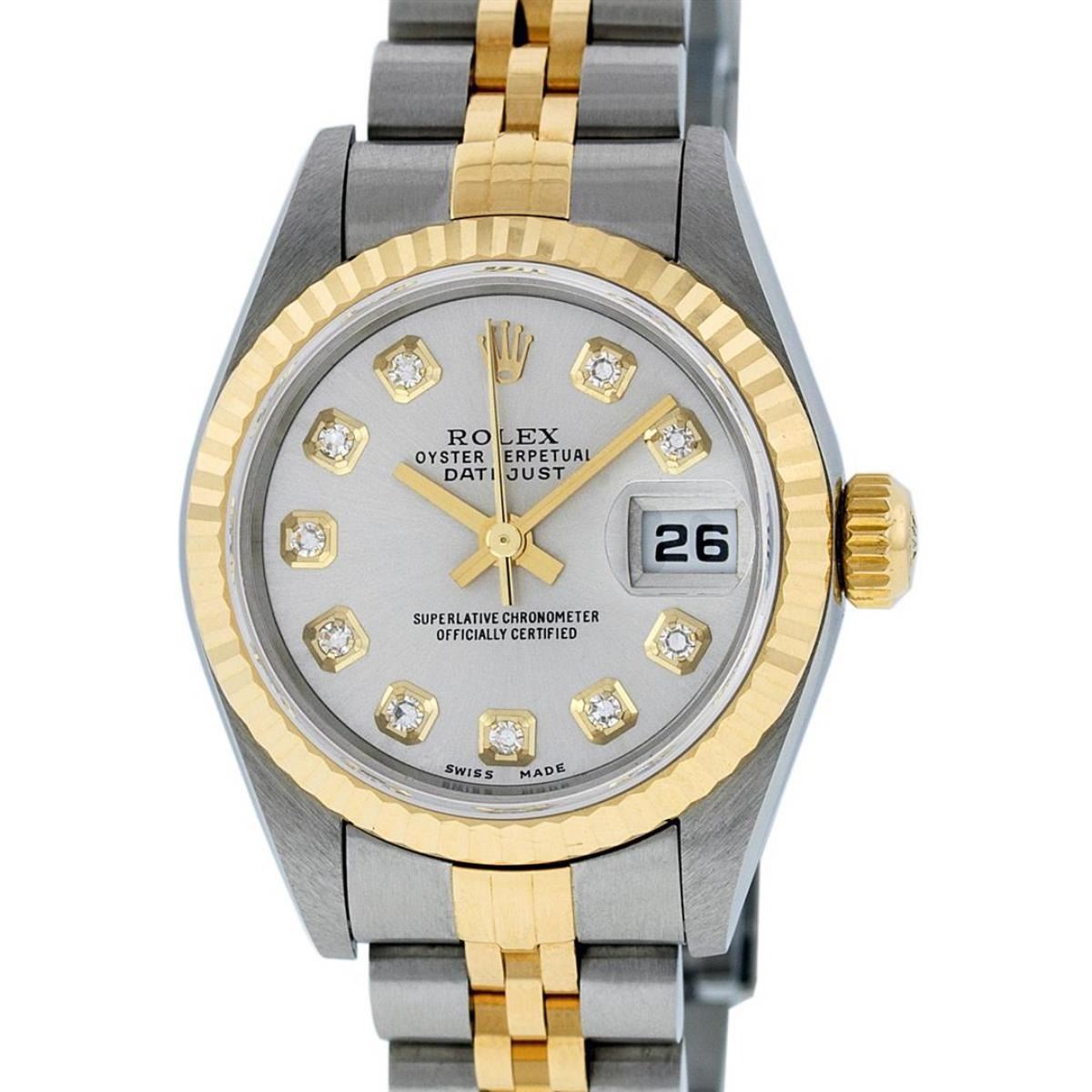 One Ladies 18K Two Tone Rolex Datejust Polished, Serviced & Electronically Tested, 18K Yellow Gold & Stainless Steel, Case Size: 26mm, 18K Yellow Gold Crown, Bezel: 18K Yellow Gold Fluted Bezel. Custom Crystal: New Acrylic Cyclops Lens. Custom Hands: New Luminescent Hands. Movement: Automatic Winding Movement Caliber 2235. Custom Dial: Silver Diamond Dial, Diamond Count: 10 Diamonds In Dial, Color: G To H, Clarity VS2. Date Window: 3 O'Clock Position Date Display, Model: Datejust. Condition: G-6 Extra Fine. Bracelet: Two Tone 18K Yellow Gold & Stainless Steel Jubilee. Bright Polish. 6.0 Inch Length, Adjustable. Standard Clasp, With Rolex Logo. This Watch Has Been Serviced Time Tested And Is In Excellent Condition It Is Free Of All Scratches And Dents.