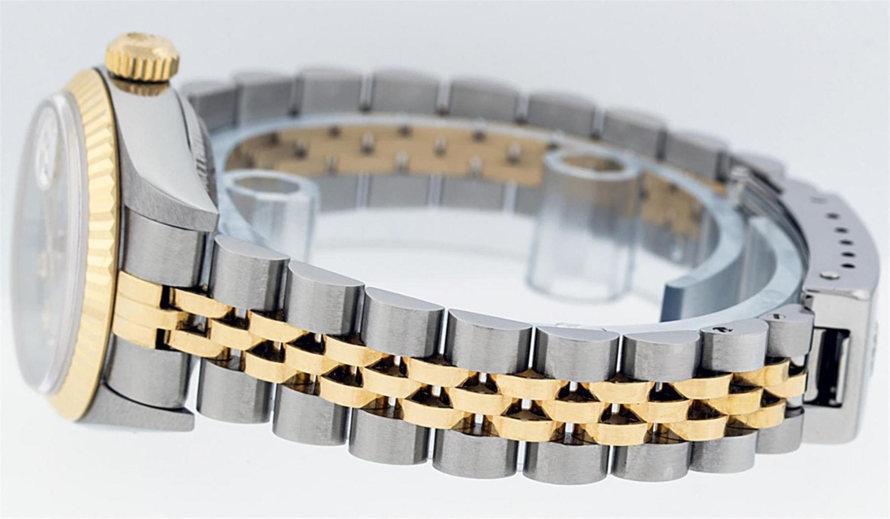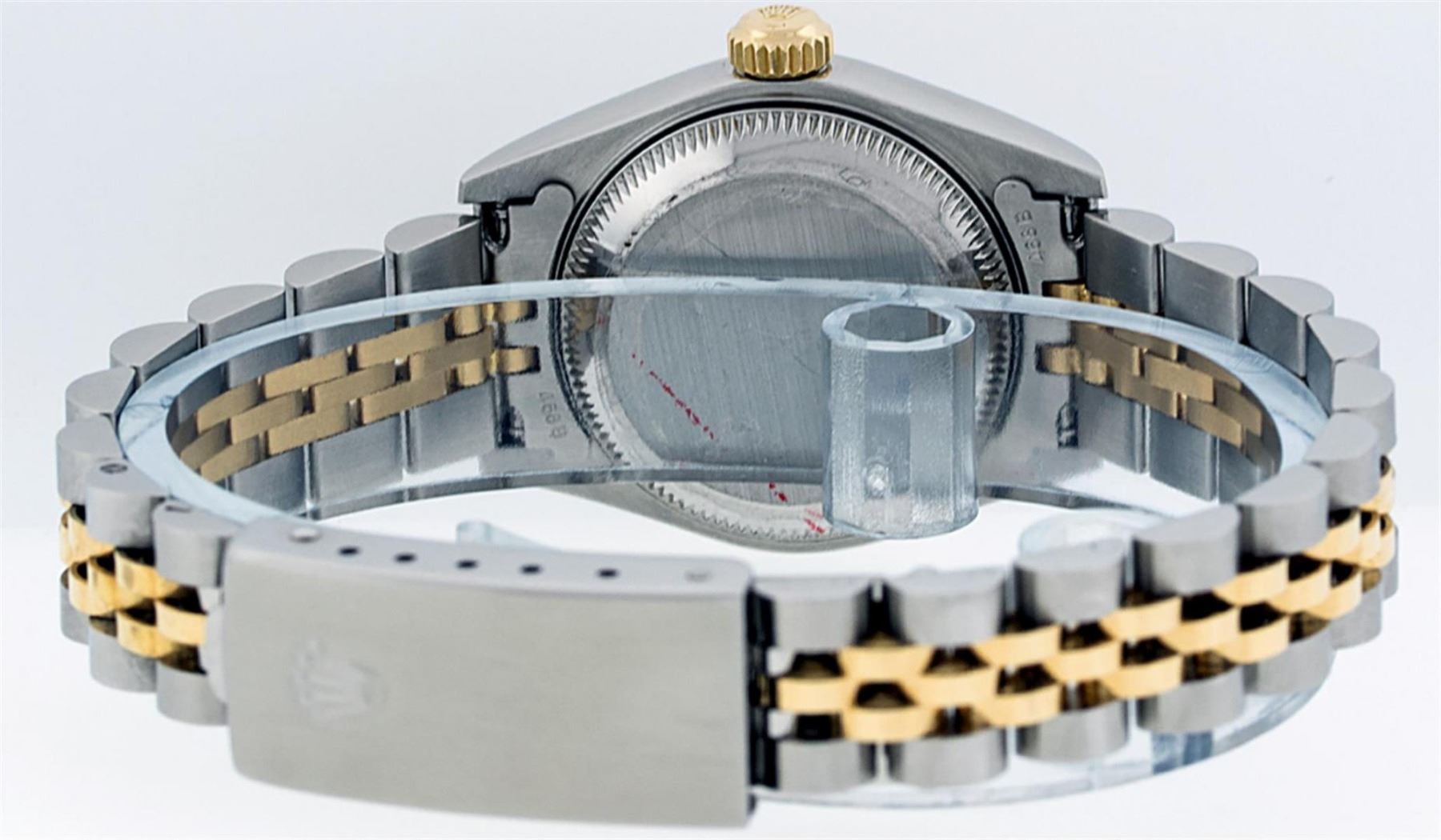 One Ladies 18K Two Tone Rolex Datejust Polished, Serviced & Electronically Tested, 18K Yellow Gold & Stainless Steel, Case Size: 26mm, 18K Yellow Gold Crown, Bezel: 18K Yellow Gold Fluted Bezel. Custom Crystal: New Acrylic Cyclops Lens. Custom Hands: New Luminescent Hands. Movement: Quickset Automatic Winding Movement. Custom Dial: Silver Diamond Dial, Diamond Count: 10 Diamonds In Dial, Color: G To H, Clarity VS2. Date Window: 3 O'Clock Position Date Display, Model: Datejust. Condition: G-6 Extra Fine. Bracelet: Two Tone 18K Yellow Gold & Stainless Steel Jubilee. Bright Polish. 6.0 Inch Length, Adjustable. Standard Clasp, With Rolex Logo. This Watch Has Been Serviced Time Tested And Is In Excellent Condition It Is Free Of All Scratches And Dents.