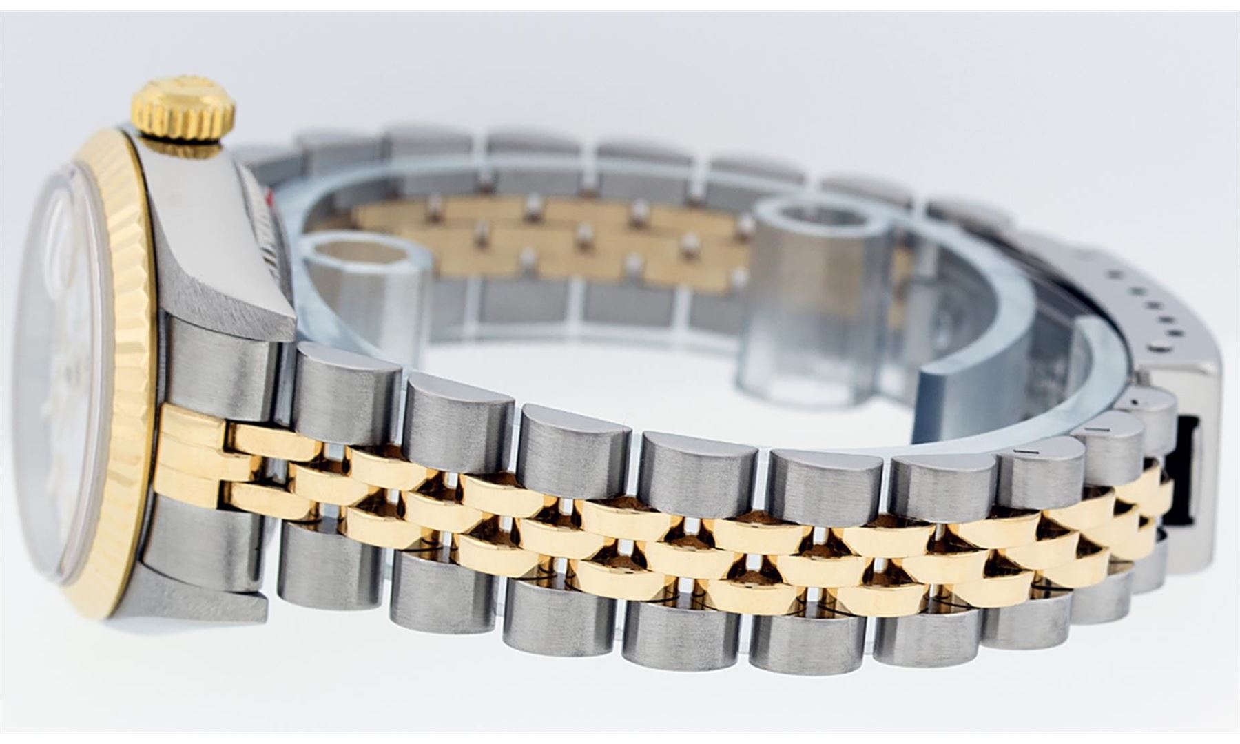 One Ladies 18K Two Tone Rolex Datejust Polished, Serviced & Electronically Tested, 18K Yellow Gold & Stainless Steel, Case Size: 26mm, 18K Yellow Gold Crown, Bezel: 18K Yellow Gold Fluted Bezel. Custom Crystal: New Acrylic Cyclops Lens. Custom Hands: New Luminescent Hands. Movement: Automatic Winding Movement Caliber 2235. Custom Dial: White Roman Dial With Roman Track. Date Window: 3 O'Clock Position Date Display, Model: Datejust. Condition: G-6 Extra Fine. Bracelet: Two Tone 18K Yellow Gold & Stainless Steel Jubilee. Bright Polish. 6.0 Inch Length, Adjustable. Standard Clasp, With Rolex Logo. This Watch Has Been Serviced Time Tested And Is In Excellent Condition It Is Free Of All Scratches And Dents.