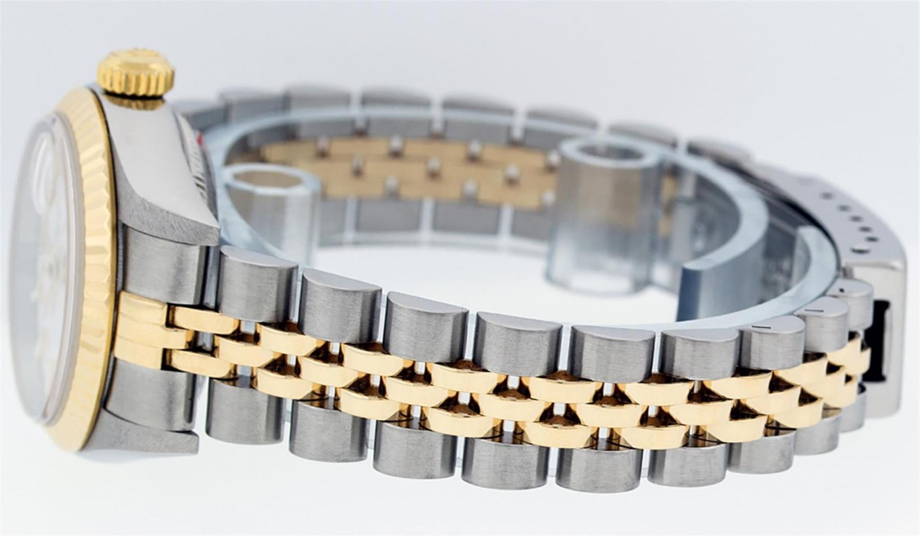 One Ladies 18K Two Tone Rolex Datejust Polished, Serviced & Electronically Tested, 18K Yellow Gold & Stainless Steel, Case Size: 26mm, 18K Yellow Gold Crown, Bezel: 18K Yellow Gold Fluted Bezel. Custom Crystal: New Acrylic Cyclops Lens. Custom Hands: New Luminescent Hands. Movement: Automatic Winding Movement Caliber 2235. Custom Dial: White Roman Dial With Roman Track. Date Window: 3 O'Clock Position Date Display, Model: Datejust. Condition: G-6 Extra Fine. Bracelet: Two Tone 18K Yellow Gold & Stainless Steel Jubilee. Bright Polish. 6.0 Inch Length, Adjustable. Standard Clasp, With Rolex Logo. This Watch Has Been Serviced Time Tested And Is In Excellent Condition It Is Free Of All Scratches And Dents.