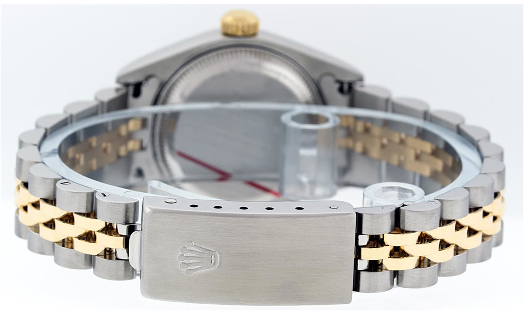 One Ladies Pre Owned 18K Two Tone Rolex Datejust Polished, Serviced & Electronically Tested, Rolex 18K Yellow Gold & Stainless Steel, Rolex Case Size: 26mm, Rolex 18K Yellow Gold Crown, Rolex Bezel: 18K Yellow Gold Fluted Bezel. Rolex Crystal: Sapphire With Cyclops Lens. Hands: Solid Hands. Rolex Movement: Automatic Winding Movement Caliber. Rolex Dial: Pyramid Roman Dial With Square Track. Date Window: 3 O'Clock Position Date Display, Model: Quickset Datejust. Condition: G-6 Extra Fine. Bracelet: Two Tone 18K Yellow Gold & Stainless Steel Jubilee Band. Bright Polish. 6.0 Inch Length, Adjustable. Standard Clasp, With Rolex Logo. This Watch Has Been Serviced Time Tested And Is In Excellent Condition It Is Free Of All Scratches And Dents.