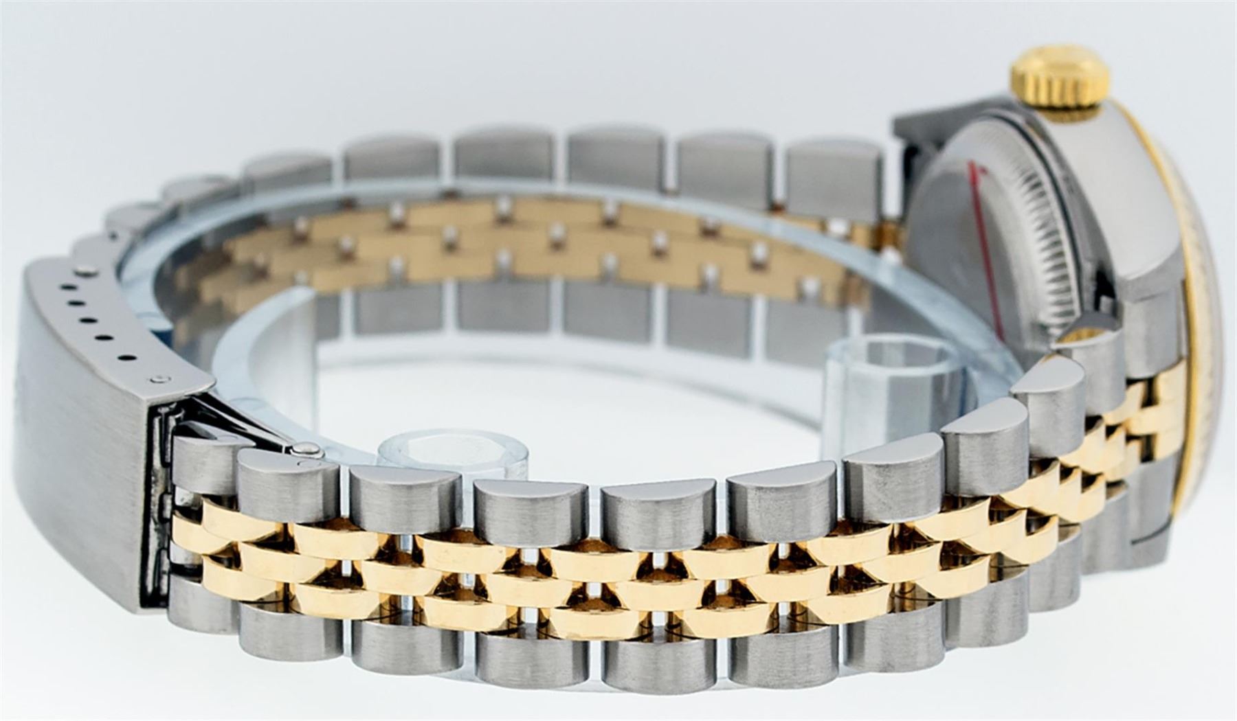 One Ladies Pre Owned 18K Two Tone Rolex Datejust Polished, Serviced & Electronically Tested, Rolex 18K Yellow Gold & Stainless Steel, Rolex Case Size: 26mm, Rolex 18K Yellow Gold Crown, Rolex Bezel: 18K Yellow Gold Fluted Bezel. Rolex Crystal: Sapphire With Cyclops Lens. Hands: Solid Hands. Rolex Movement: Automatic Winding Movement Caliber. Rolex Dial: Pyramid Roman Dial With Square Track. Date Window: 3 O'Clock Position Date Display, Model: Quickset Datejust. Condition: G-6 Extra Fine. Bracelet: Two Tone 18K Yellow Gold & Stainless Steel Jubilee Band. Bright Polish. 6.0 Inch Length, Adjustable. Standard Clasp, With Rolex Logo. This Watch Has Been Serviced Time Tested And Is In Excellent Condition It Is Free Of All Scratches And Dents.