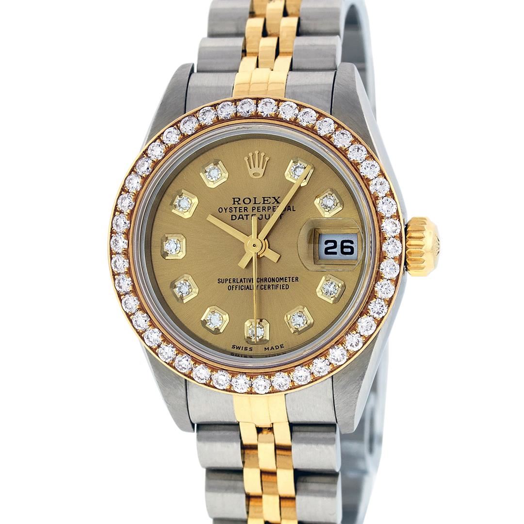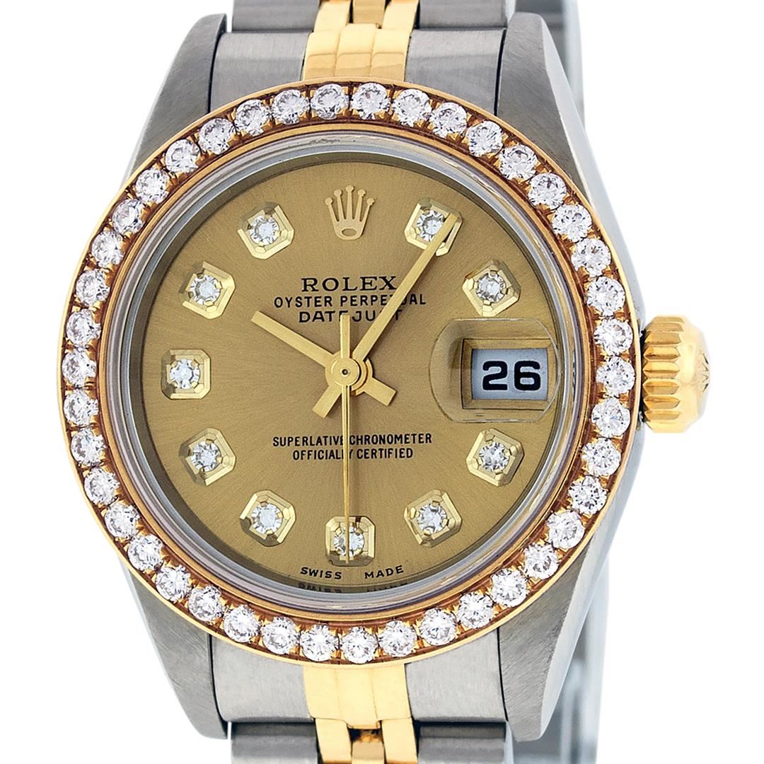 One Ladies Quickset 18K Two Tone Rolex Datejust Polished, Serviced & Electronically Tested, 18K Yellow Gold & Stainless Steel Case: 26mm, 18K Yellow Gold Crown, Custom Bezel: New 18K Yellow Gold Beadset Diamond Bezel, Diamond Count: 42 Diamonds in dial, Total Weight 1.00 Carat, Clarity: SI-VS, Color: G to H. Custom Crystal: New Synthetic Sapphire Cyclops Lens. Custom Hands: New Luminescent Hands. Movement: Automatic Winding Movement Caliber 2235. Custom Dial: Champagne Single Cut Diamond Dial, Stone Count: 10 Diamonds, Clarity: VS2, Color: G to H. Date Window: 3 O'Clock Position Date Display, Model: Datejust. Condition: G-6 Extra Fine. Bracelet: Two Tone 18K Yellow Gold & Stainless Steel Jubilee Band. Bright Polish. 6.0 Inch Length, Adjustable. Standard Clasp, With Rolex Logo. This Watch Has Been Serviced Time Tested And Is In Excellent Condition It Is Free Of All Scratches And Dents.