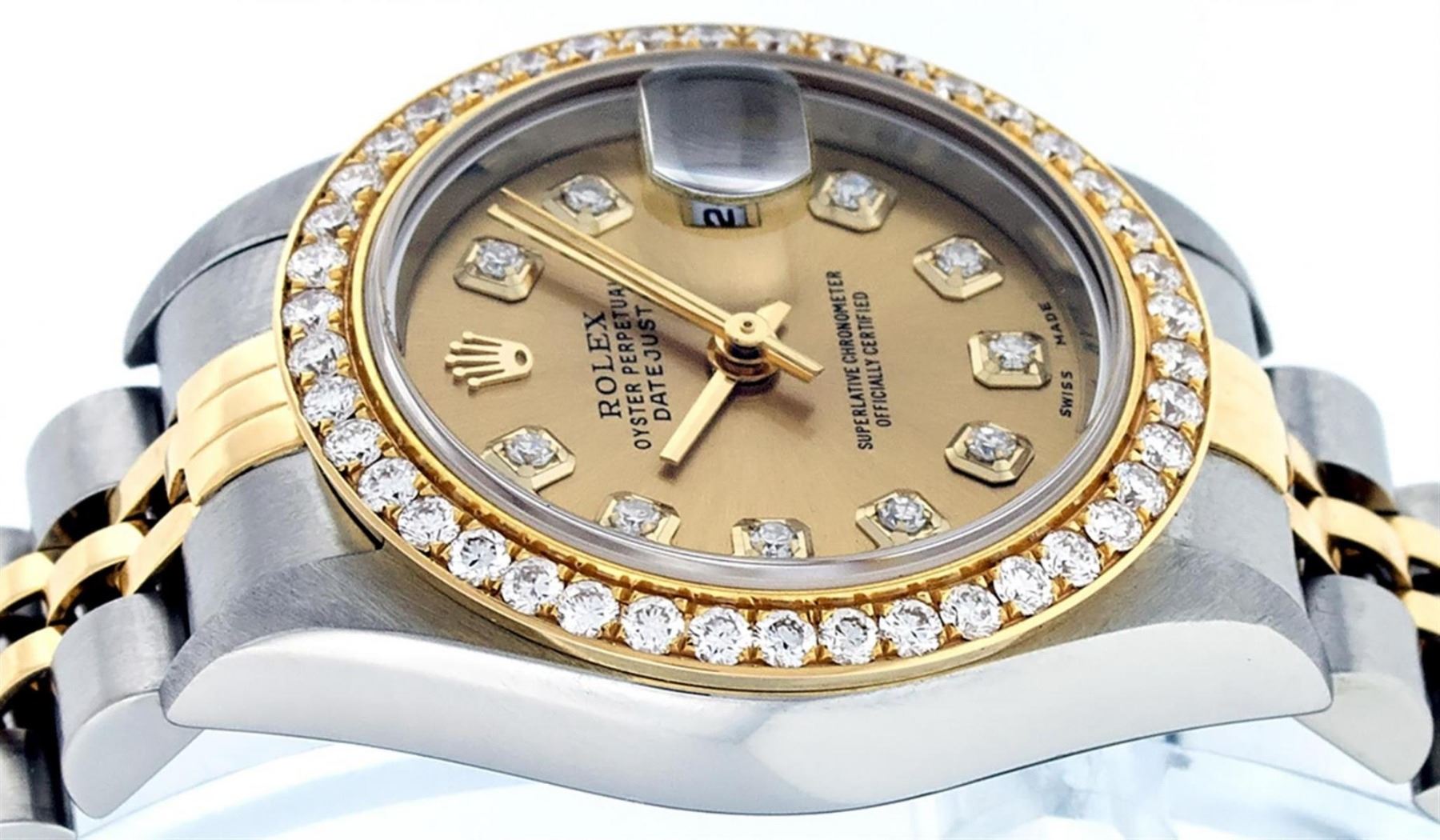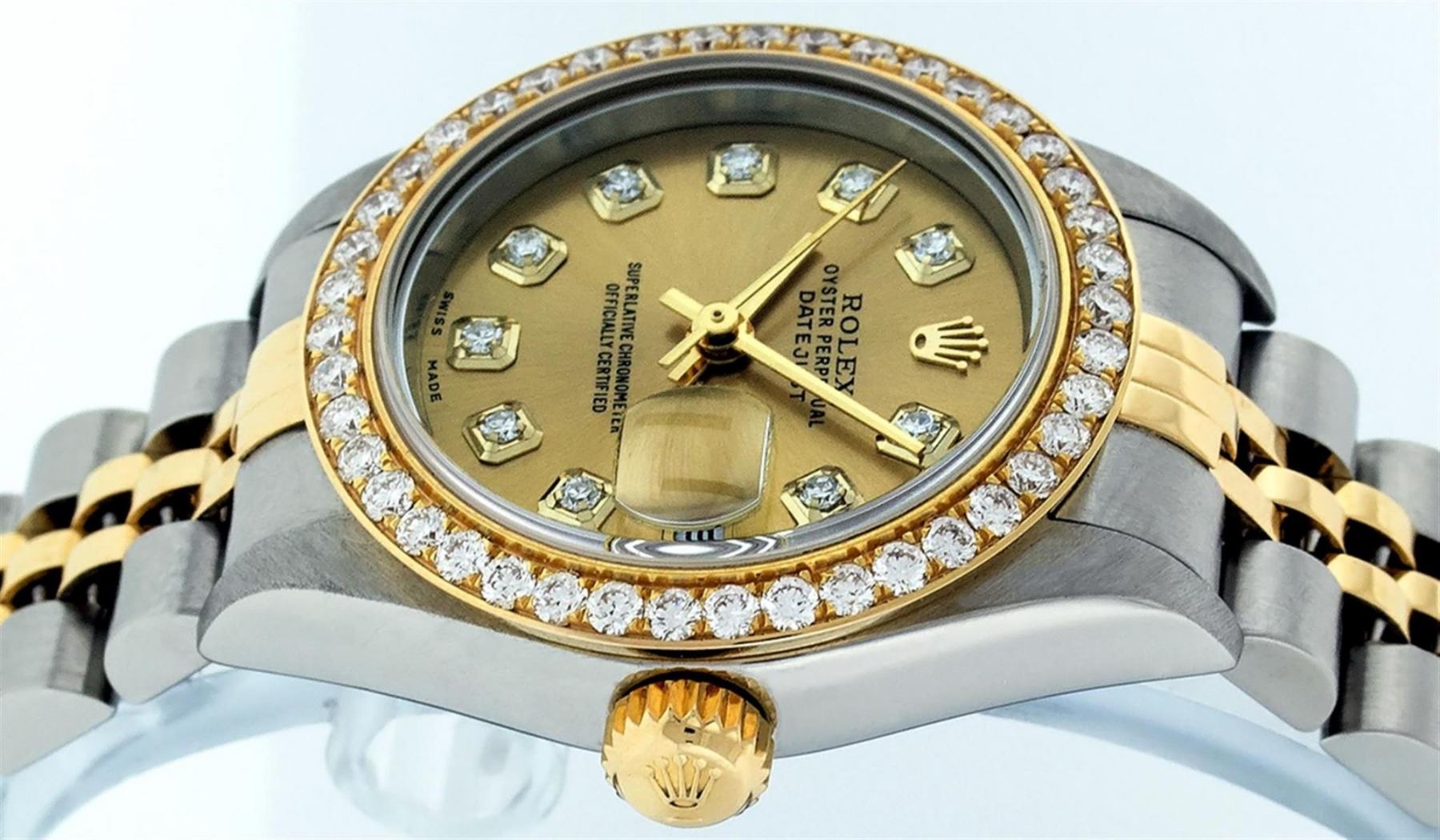 One Ladies Quickset 18K Two Tone Rolex Datejust Polished, Serviced & Electronically Tested, 18K Yellow Gold & Stainless Steel Case: 26mm, 18K Yellow Gold Crown, Custom Bezel: New 18K Yellow Gold Beadset Diamond Bezel, Diamond Count: 42 Diamonds in dial, Total Weight 1.00 Carat, Clarity: SI-VS, Color: G to H. Custom Crystal: New Synthetic Sapphire Cyclops Lens. Custom Hands: New Luminescent Hands. Movement: Automatic Winding Movement Caliber 2235. Custom Dial: Champagne Single Cut Diamond Dial, Stone Count: 10 Diamonds, Clarity: VS2, Color: G to H. Date Window: 3 O'Clock Position Date Display, Model: Datejust. Condition: G-6 Extra Fine. Bracelet: Two Tone 18K Yellow Gold & Stainless Steel Jubilee Band. Bright Polish. 6.0 Inch Length, Adjustable. Standard Clasp, With Rolex Logo. This Watch Has Been Serviced Time Tested And Is In Excellent Condition It Is Free Of All Scratches And Dents.