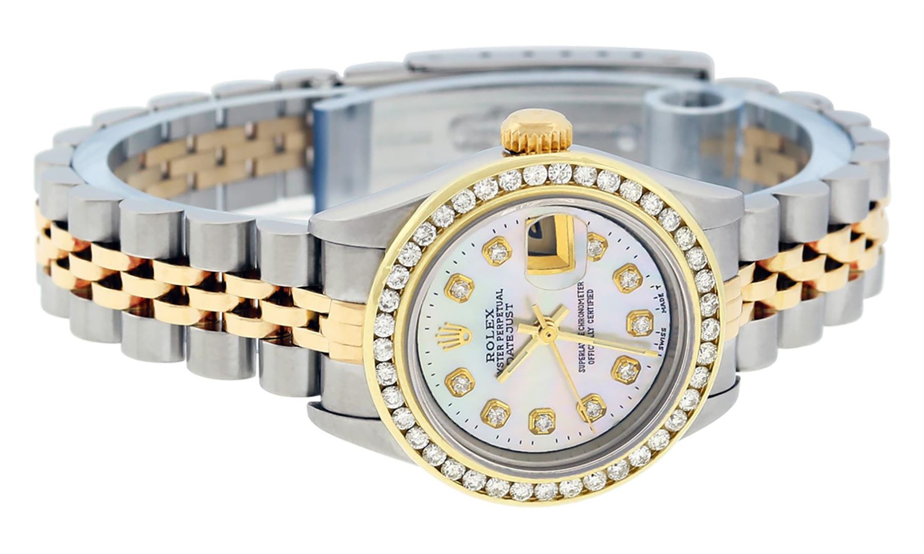 One Ladies Pre Owned 18K Two Tone Rolex Datejust Polished, Serviced & Electronically Tested, 18K Yellow Gold & Stainless Steel Case: 26mm, 18K Yellow Gold Crown, Custom Bezel: New 18K Yellow Gold Channel Set Diamond Bezel, Diamond Count: 44 Diamonds in di