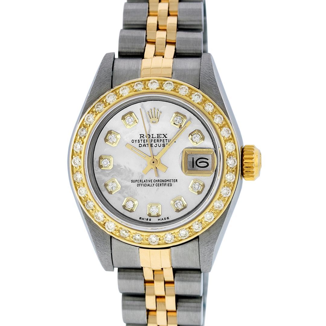 One Ladies 18K Two Tone Rolex Datejust Polished, Serviced & Electronically Tested, 18K Yellow Gold & Stainless Steel Case: 26mm, 18K Yellow Gold Crown, Custom Bezel: New 18K Yellow Gold Beadset Diamond Bezel, Diamond Count: 43 Diamonds in dial, Total Weight .70 Carat, Clarity: SI-VS, Color: G to H. Custom Crystal: New Synthetic Sapphire Cyclops Lens. Custom Hands: New Luminescent Hands. Movement: Automatic Winding Movement Caliber 2235. Custom Dial: Mother Of Pearl Diamond Dial, Stone Count: 10 Diamonds, Clarity: SI-VS, Color: G to H. Date Window: 3 O'Clock Position Date Display, Model: Datejust. Condition: G-6 Extra Fine. Bracelet: Two Tone 18K Yellow Gold & Stainless Steel Jubilee Band. Bright Polish. 6.0 Inch Length, Adjustable. Standard Clasp, With Rolex Logo. This Watch Has Been Serviced Time Tested And Is In Excellent Condition It Is Free Of All Scratches And Dents.
