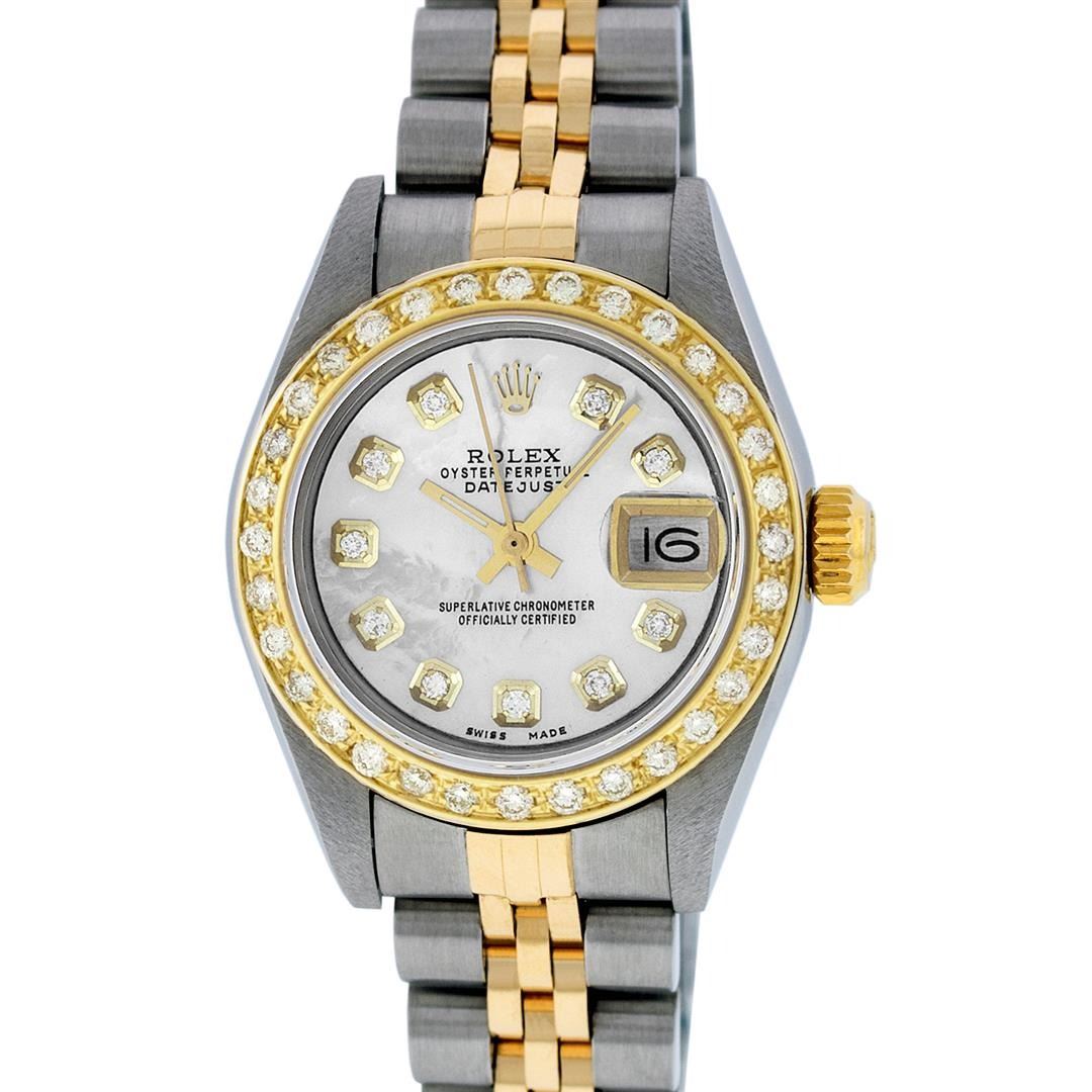 One Ladies Pre Owned 18K Two Tone Rolex Datejust Polished, Serviced & Electronically Tested, 18K Yellow Gold & Stainless Steel Case: 26mm, 18K Yellow Gold Crown, Custom Bezel: New 18K Yellow Gold Beadset Diamond Bezel, Diamond Count: 43 Diamonds in dial,
