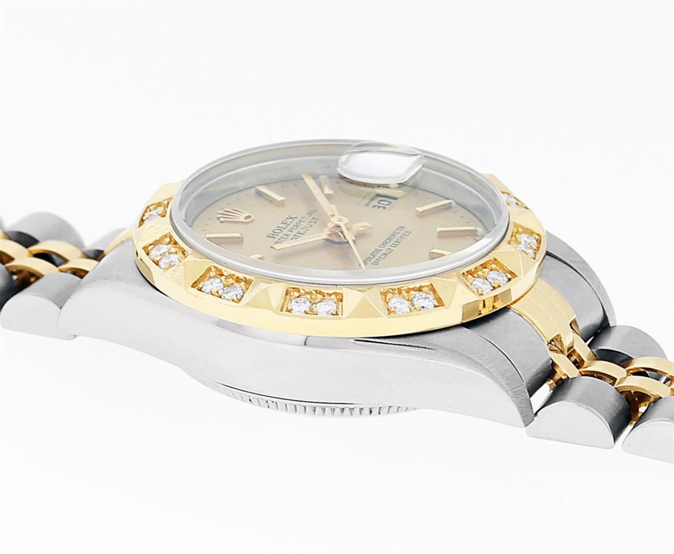 One Pre Owned Quickset Ladies Two Tone 18K Yellow Gold & Stainless Rolex Polished, Serviced & Electronically Tested, Rolex 18K Yellow Gold & Stainless Steel Case: 26mm. Rolex Yellow Gold Crown, Custom Bezel: New 18K Yellow Gold Pyramid Bezel, Diamond Count: 24 Diamonds On Bezel, Clarity: SI-VS, Color: G to H. Custom Crystal: New Sapphire With Magnified Date Window. Custom Hands: New Lumi Hands. Rolex Movement: Automatic Quickset Winding Movement 2235. Rolex Dial: Champagne Index With Lumi Dots And Dash Track. Date Window: 3 O'Clock Position Date Display, Model: Quickset Datejust, Condition: G-6 Extra Fine. Rolex Bracelet: Two Tone 18K Yellow Gold & Stainless Steel Jubilee Band. Bright Polish. 6.0 Inch Length, Adjustable. Standard Clasp, With Rolex Logo. This Watch Has Been Serviced Time Tested And Is In Excellent Condition It Is Free Of All Scratches And Dents.