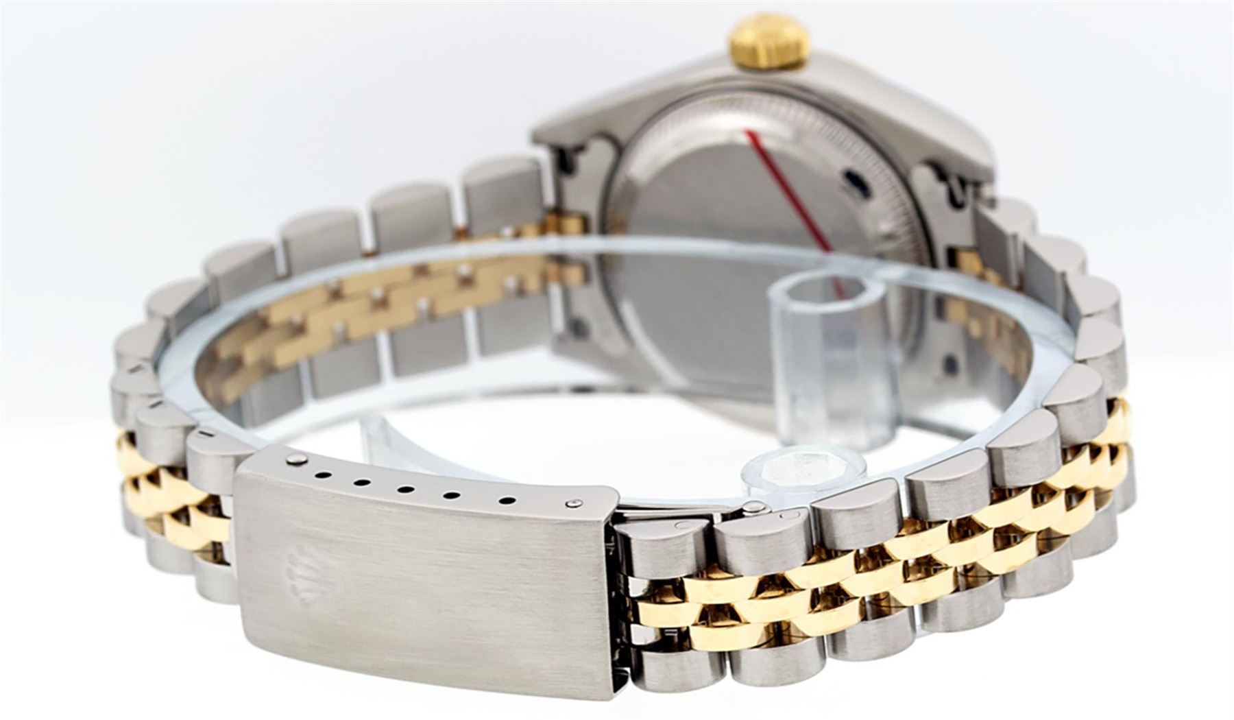 One Ladies Quickset Pre Owned 18K Two Tone Rolex Datejust Polished, Serviced & Electronically Tested, Rolex 18K Yellow Gold & Stainless Steel, Rolex Case Size: 26mm, Rolex 18K Yellow Gold Crown, Rolex Bezel: 18K Yellow Gold Fluted Bezel. Crystal: Sapphire With Magnified Date Window. Hands: Solid Hands. Rolex Movement: Automatic Winding Movement Caliber 2235. Rolex Dial: Ivory Pyramid Roman Dial With Square Track. Date Window: 3 O'Clock Position Date Display, Model: Quickset Datejust. Condition: G-6 Extra Fine. Rolex Bracelet: Two Tone 18K Yellow Gold & Stainless Steel Jubilee Band. Bright Polish. 6.0 Inch Length, Adjustable. Standard Clasp, With Rolex Logo. This Watch Has Been Serviced Time Tested And Is In Excellent Condition It Is Free Of All Scratches And Dents.