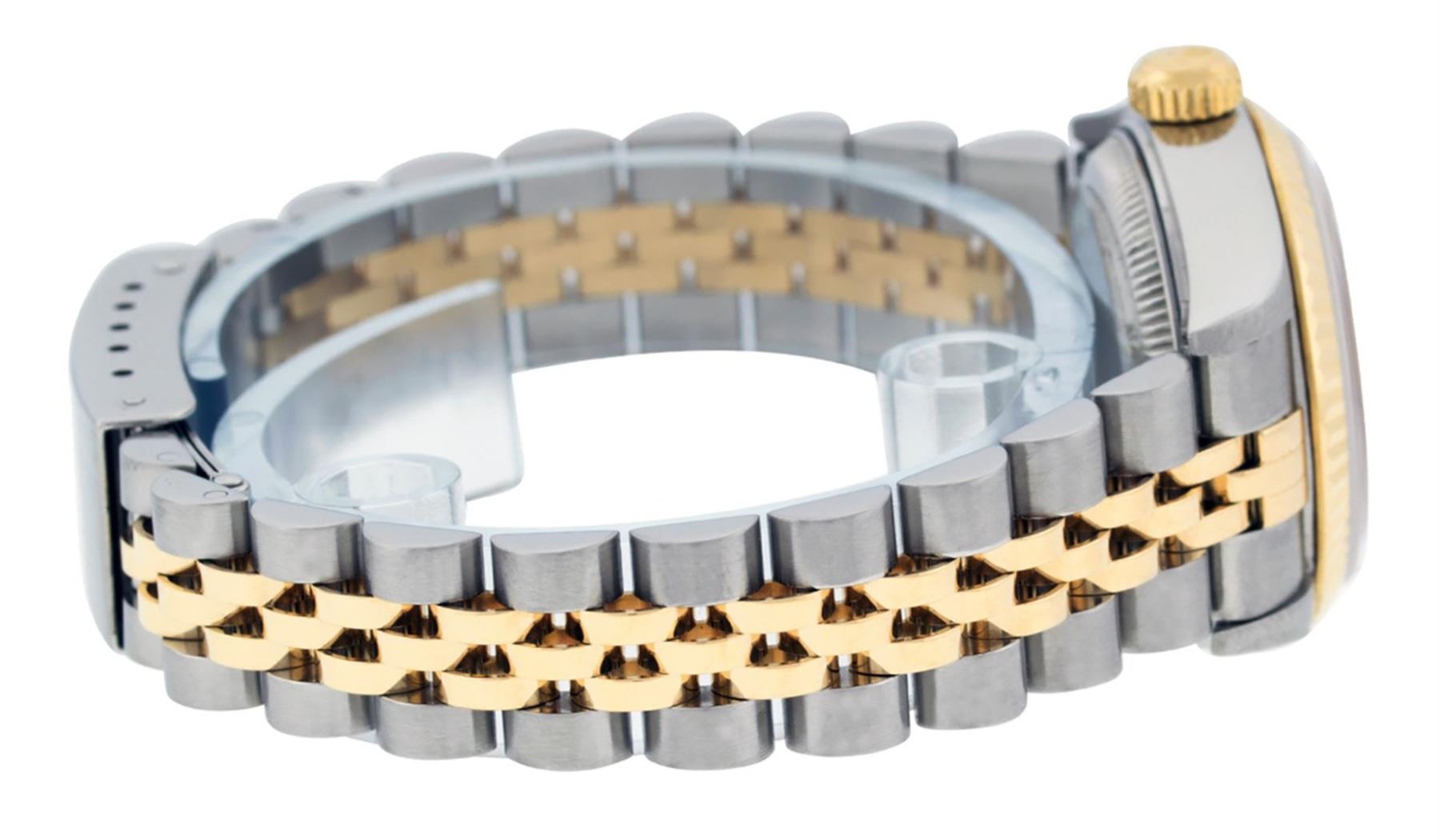 One Ladies Quickset Pre Owned 18K Two Tone Rolex Datejust Polished, Serviced & Electronically Tested, Rolex 18K Yellow Gold & Stainless Steel, Rolex Case Size: 26mm, Rolex 18K Yellow Gold Crown, Rolex Bezel: 18K Yellow Gold Fluted Bezel. Crystal: Sapphire With Magnified Date Window. Hands: Solid Hands. Rolex Movement: Automatic Winding Movement Caliber 2235. Rolex Dial: Ivory Pyramid Roman Dial With Square Track. Date Window: 3 O'Clock Position Date Display, Model: Quickset Datejust. Condition: G-6 Extra Fine. Rolex Bracelet: Two Tone 18K Yellow Gold & Stainless Steel Jubilee Band. Bright Polish. 6.0 Inch Length, Adjustable. Standard Clasp, With Rolex Logo. This Watch Has Been Serviced Time Tested And Is In Excellent Condition It Is Free Of All Scratches And Dents.
