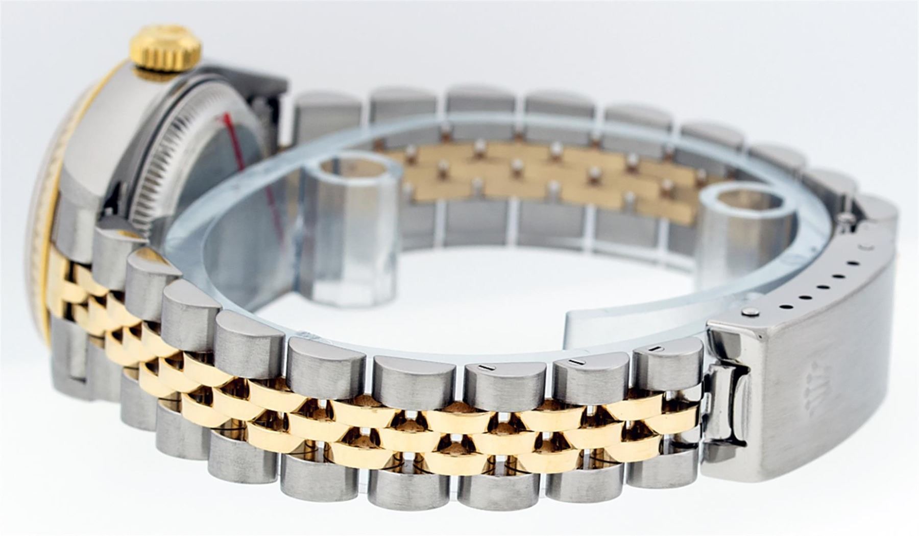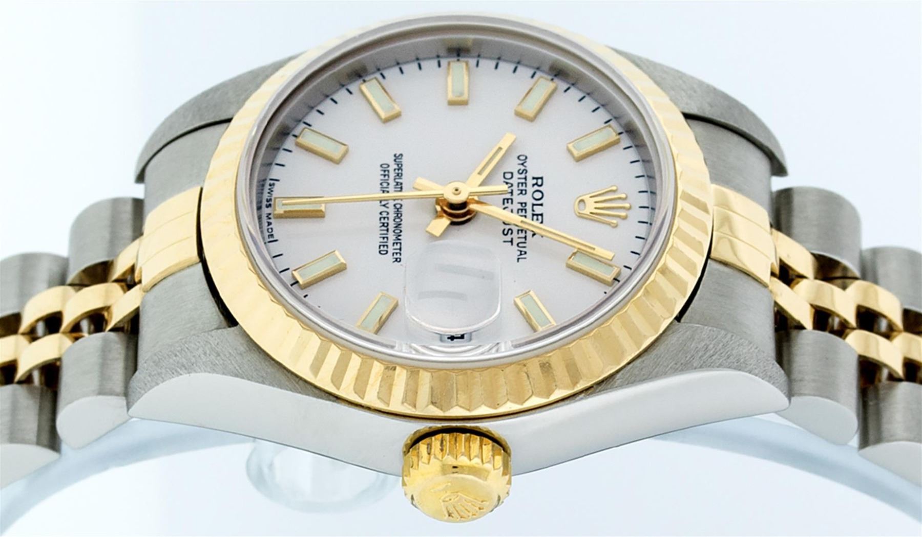One Ladies Pre Owned 18K Two Tone Rolex Datejust Polished, Serviced & Electronically Tested, 18K Yellow Gold & Stainless Steel, Case Size: 26mm, 18K Yellow Gold Crown, Rolex Bezel: 18K Yellow Gold Fluted Bezel. Custom Crystal: New Sapphire With Magnified Date Window. Custom Hands: New Luminescent Hands. Rolex Movement: Automatic Winding Movement 2235. Custom Dial: White Roman Dial With Roman Track. Date Window: 3 O'Clock Position Date Display, Model: Datejust. Condition: G-6 Extra Fine. Rolex Bracelet: Two Tone 18K Yellow Gold & Stainless Steel Jubilee Band. Bright Polish. 6.0 Inch Length, Adjustable. Standard Clasp, With Rolex Logo. This Watch Has Been Serviced Time Tested And Is In Excellent Condition It Is Free Of All Scratches And Dents.